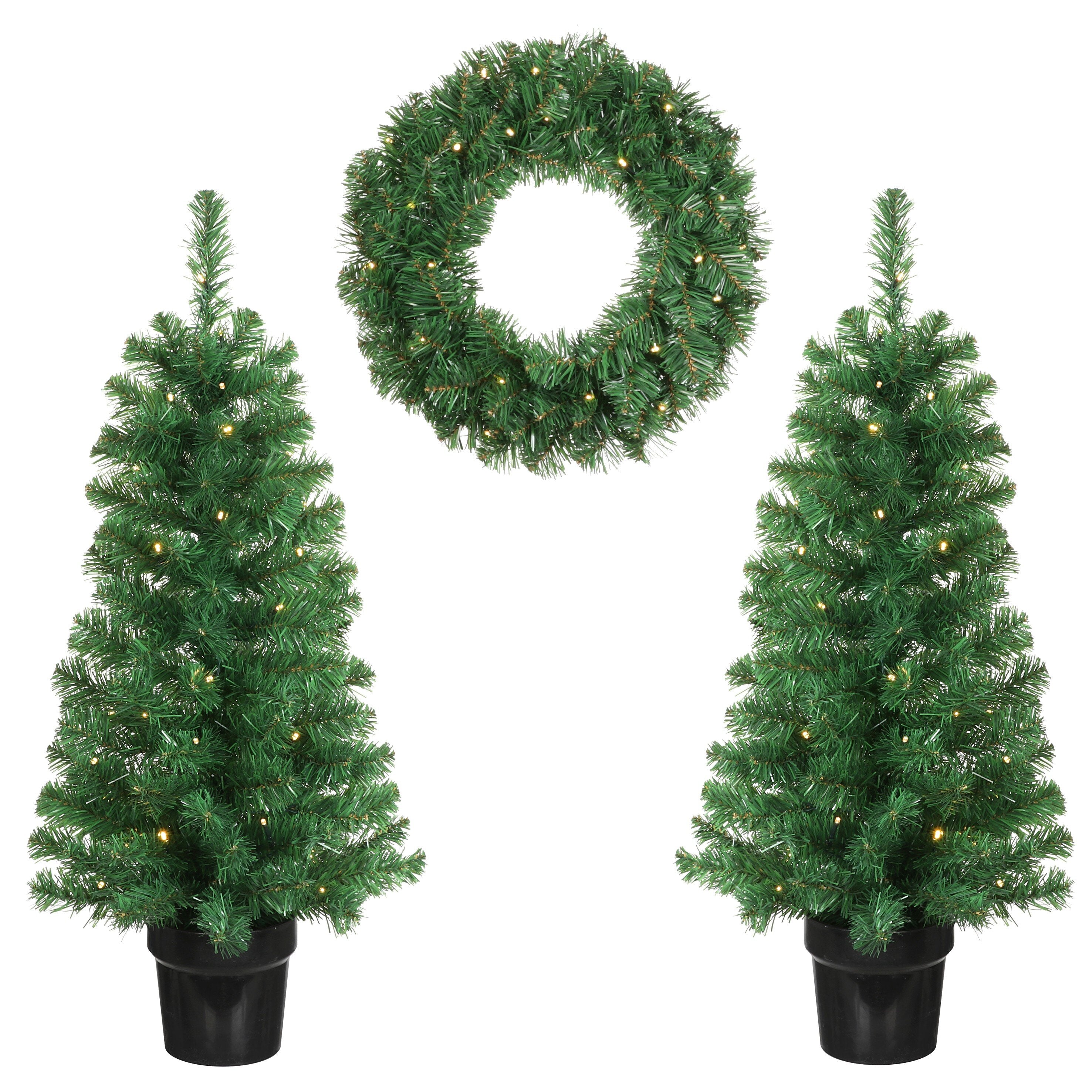 Beschrijving- Complete set met twee kerstboompjes en een krans voor een sfeervolle entree