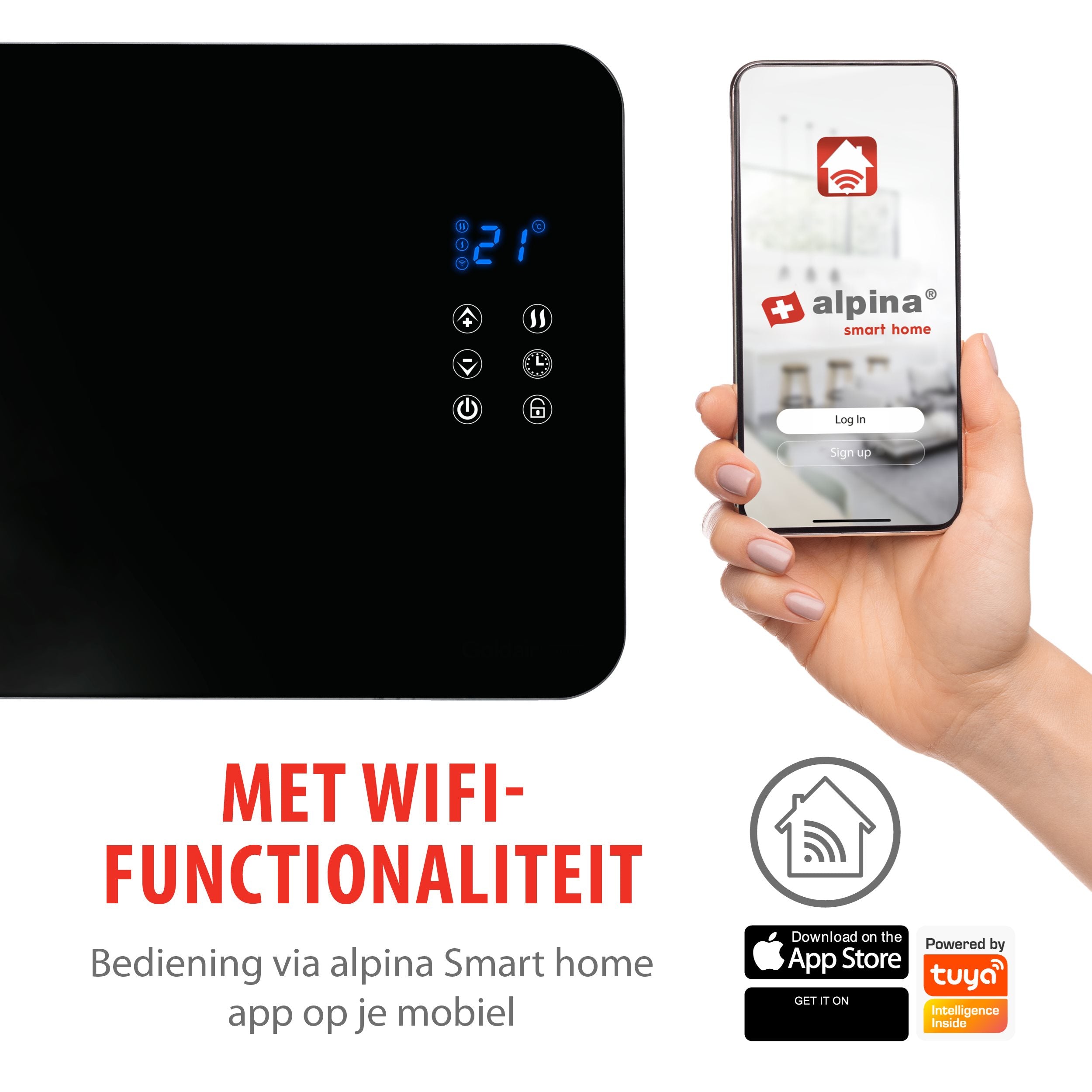 Je bestuurt de convectorkachel gemakkelijk via je Wifi-netwerk en de alpina Smart home app. Deze download je simpelweg via de Apple App Store of je Google Play Store. Maak een account aan en voeg de convectorkachel toe aan je account. Door middel van het scannen van de QR-code op de paneelverwarming verbind je hem met je wifinetwerk. Je kunt nu vanaf afstand de temperatuur bepalen, een timer instellen en de elektrische convector kachel aan en uit zetten.