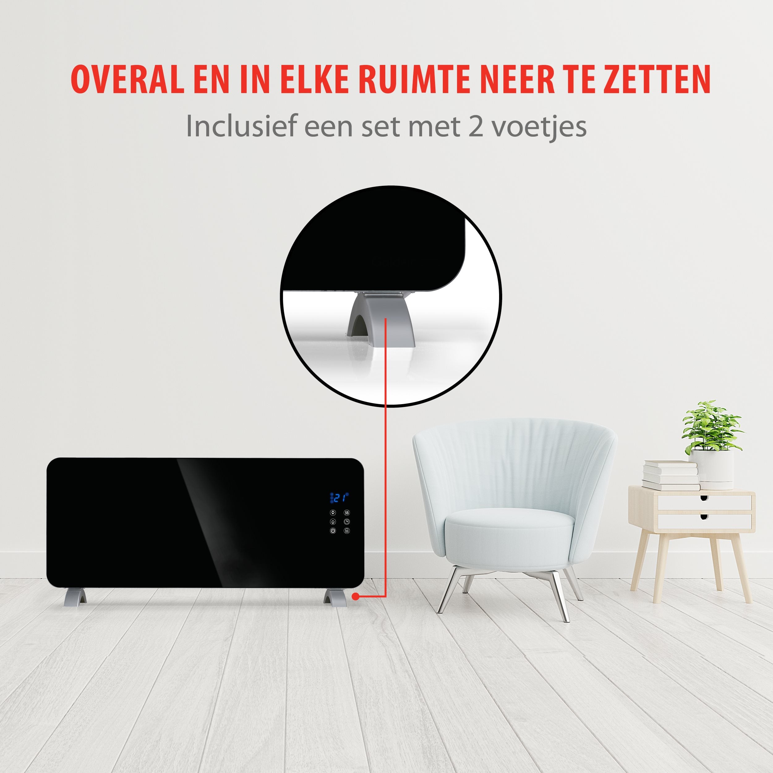 Met de elektrische convectorkachel wordt een set met 2 voetjes meegeleverd. Hiermee kun je de paneelverwarming gemakkelijk overal en in elke ruimte neerzetten. Wil je liever ruimte besparen? Gebruik dan de 16 meegeleverde schroeven om de glasconvector gemakkelijk aan je wand te monteren. LET OP: De convectorkachel is niet geschikt voor gebruik in de badkamer, plaats hem hier daarom ook niet.