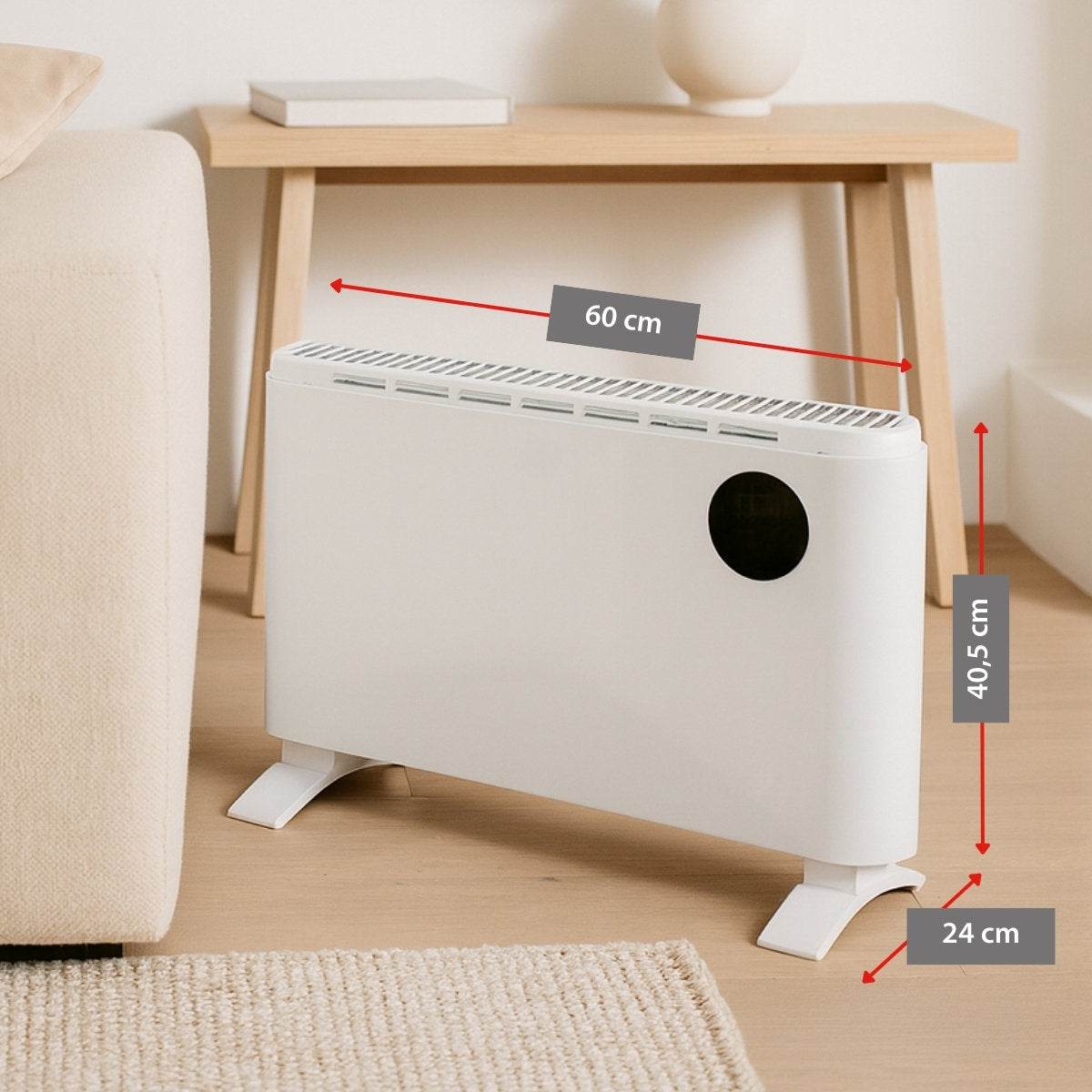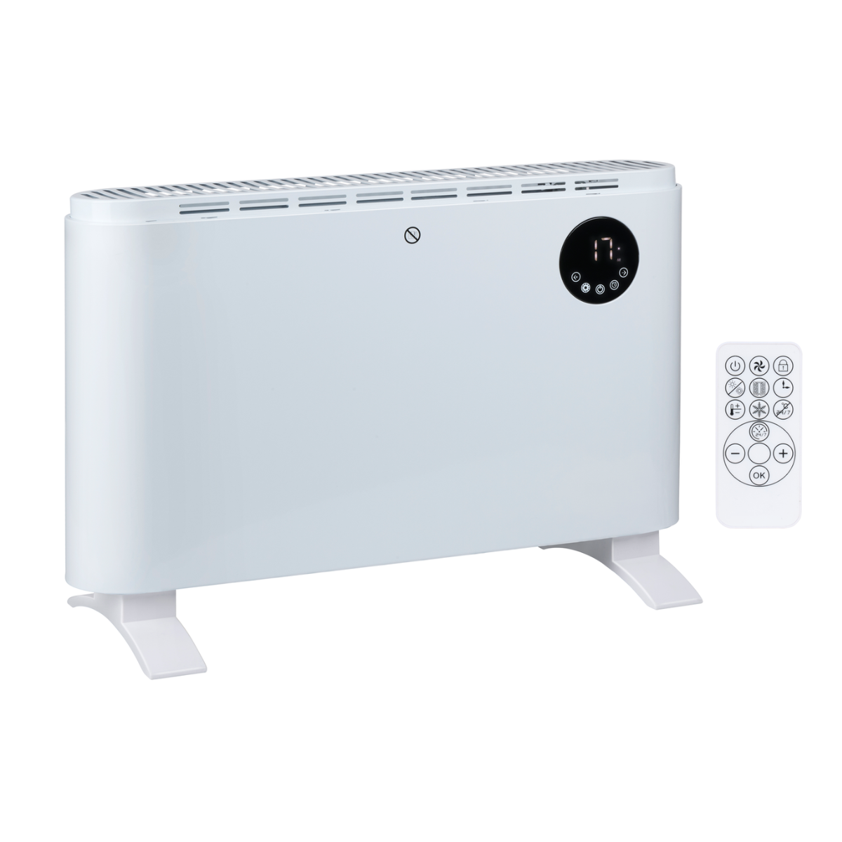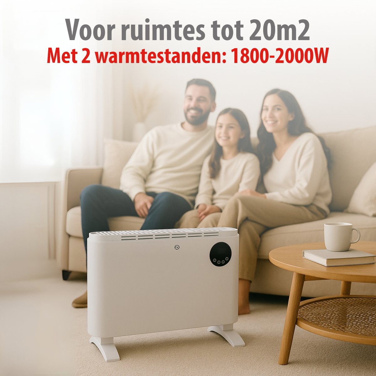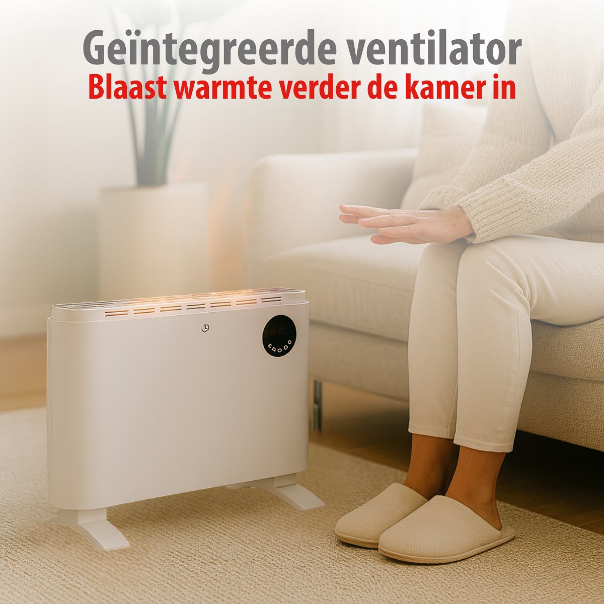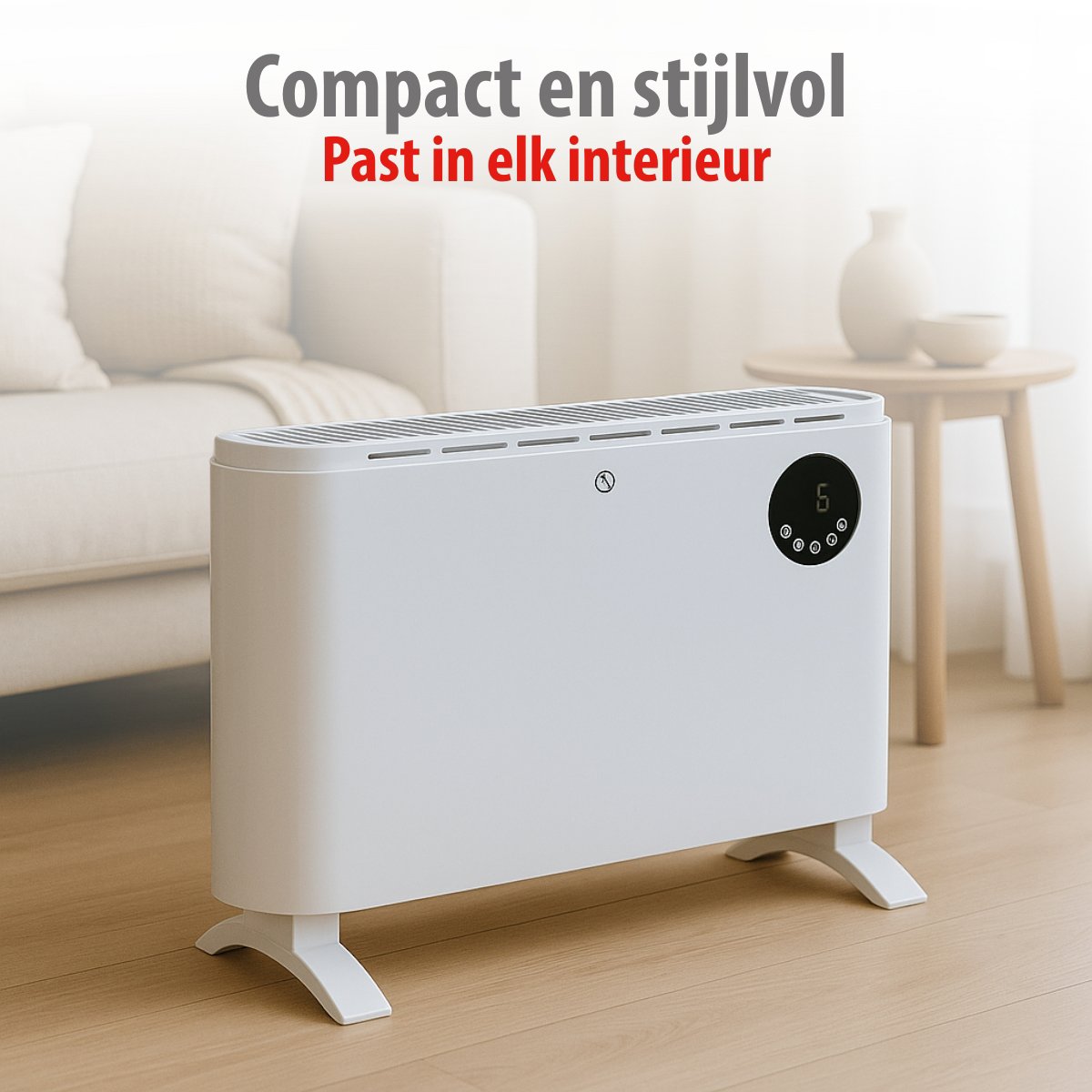 Uniek aan deze convectorkachel is de flexibele plaatsingsmogelijkheid: gebruik hem vrijstaand met de meegeleverde poten voor mobiele inzet in verschillende kamers, of monteer hem aan de muur met het bijgeleverde montagemateriaal voor een vaste, ruimtebesparende installatie. Zo past hij perfect in de woonkamer, slaapkamer, studeerkamer of kantoor.