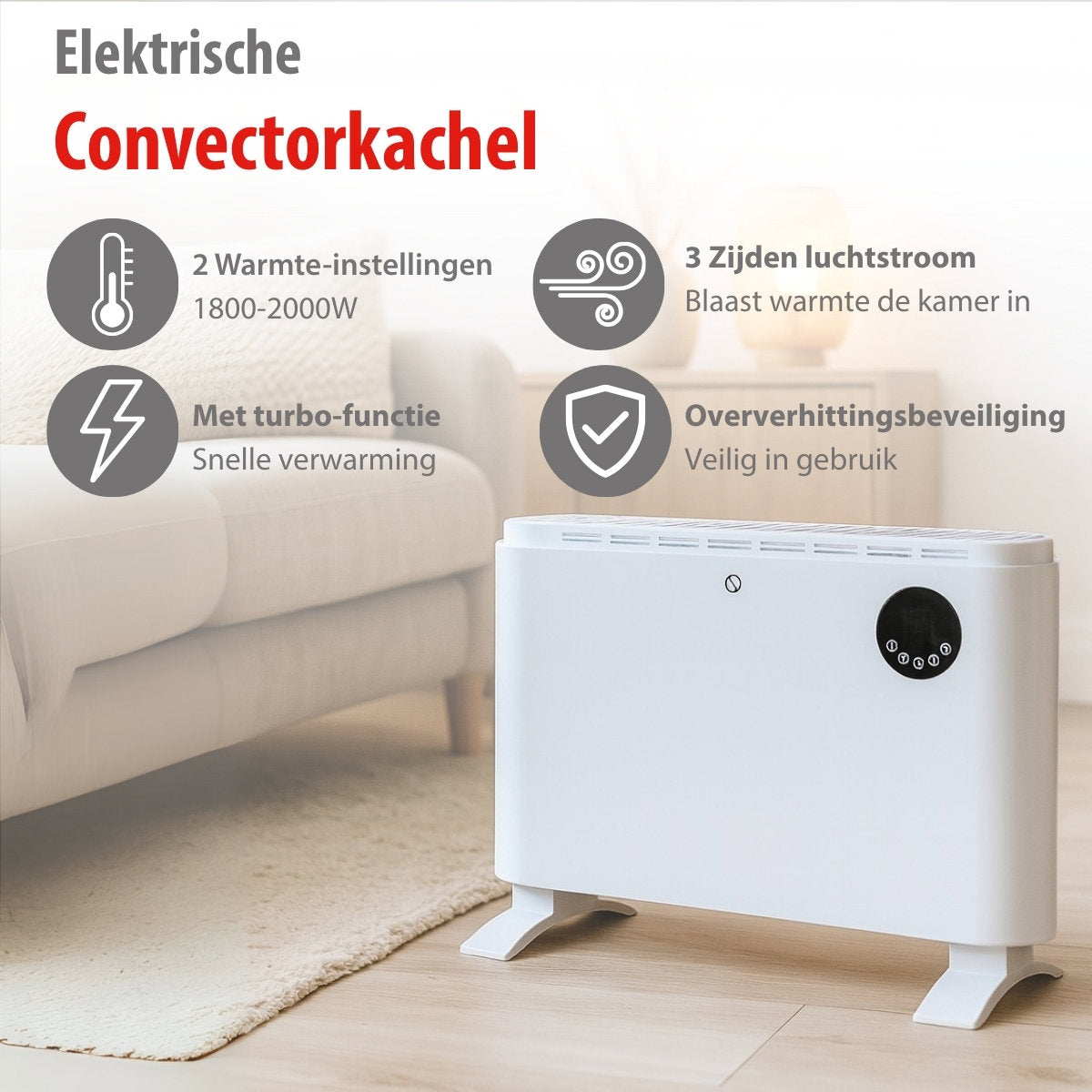 - Drie verwarmingsstanden: 750W, 1250W en 2000W voor optimale warmteafgifte