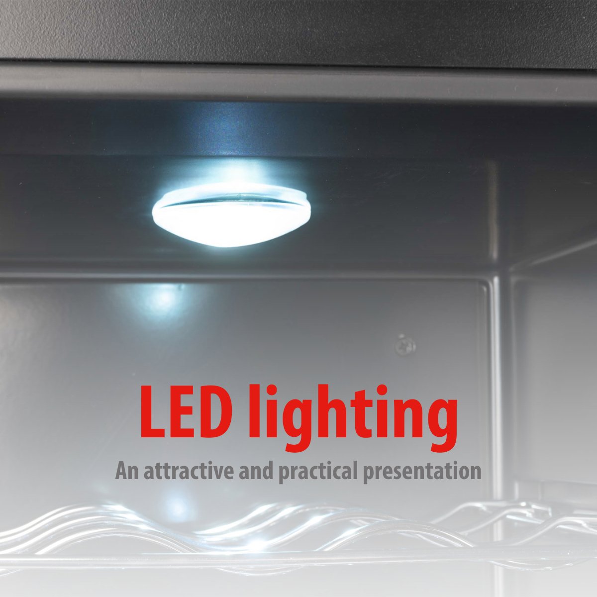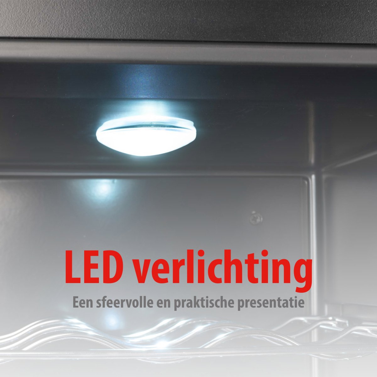 Met ruimte voor in totaal 18 wijnflessen is het natuurlijk fijn om gemakkelijk en snel te kunnen zien welke wijnen je allemaal op voorraad hebt. De alpina wijnkoelkast beschikt daarom over interne LED-verlichting en een chique glazen deur. Dit geeft de wijnklimaatkast niet alleen een luxe uitstraling, maar maakt het ook nog eens makkelijk om snel de juiste wijn te selecteren bij een borrel of diner. De verlichting in de koelkast zit bovenin. Het word aangeraden om voor het bewaren van oudere wijnen en rode wijnen deze zoveel mogelijk onderin de wijnkoelkast te bewaren. Op die manier worden ze minder snel aangetast door de kunstverlichting.