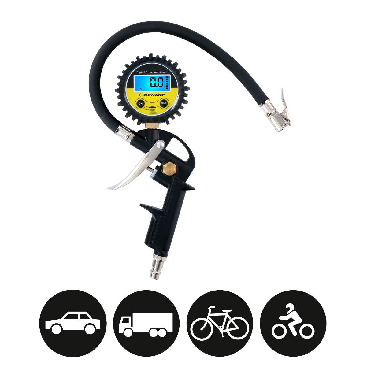 De Dunlop bandenpomp met drukmeter werkt op 2 AAA-batterijen. Je sluit hem vervolgens aan op een luchtcompressor naar keuze. De drukmeter meet de luchtdruk in een band vervolgens middels verschillende eenheden die je op het digitale display af kunt lezen: PSI, BAR, KPA en KG/CM2. De maximale luchtdruk die de manometer in verschillende eenheden kan meten is 0 tot 200 PSI, 0 tot 14 BAR, 0-1400 KPA en 0 to 14 KG/CM2. Je kunt de juiste luchtdruk voor het desbetreffende voertuig handmatig instellen op het LED-verlichtte display. Wanneer je de juiste eenheid en luchtdruk ingesteld hebt sluit je de 30 centimeter lange luchtslang aan op het ventiel van de band.
