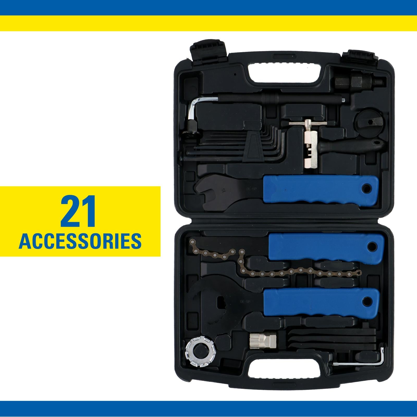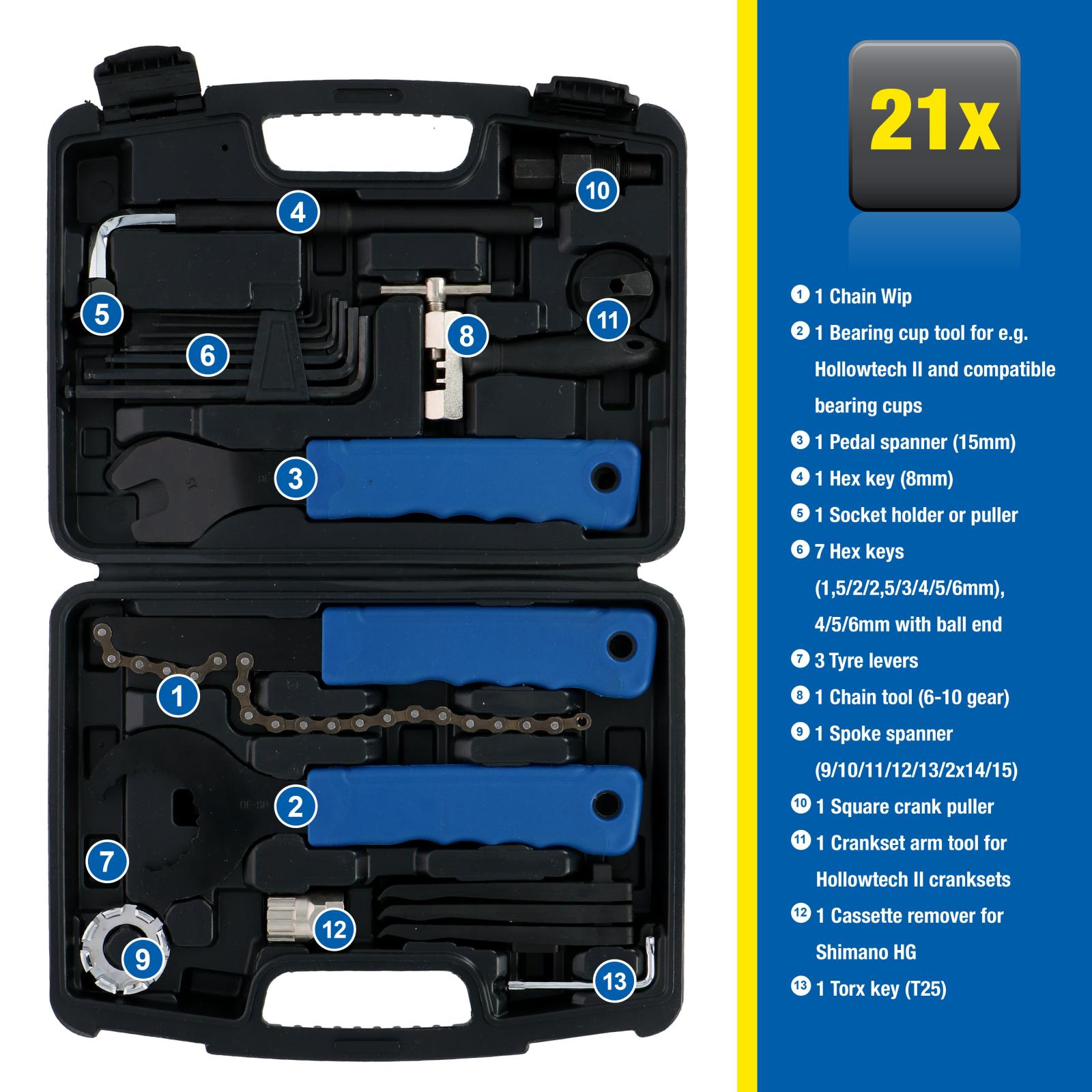 Naast de kettingopener, kettingspons en bandenlichters zit er nog veel meer fietsgereedschap in deze fietsreparatiekoffer. Deze kit van Kinzo bevat alles wat je nodig hebt om je fiets te repareren en te onderhouden. In de kunststof koffer zitten 21 stuks robuust gereedschap voor de fiets. Zo kun je onderweg of thuis altijd zelf je fiets repareren en onderhouden.