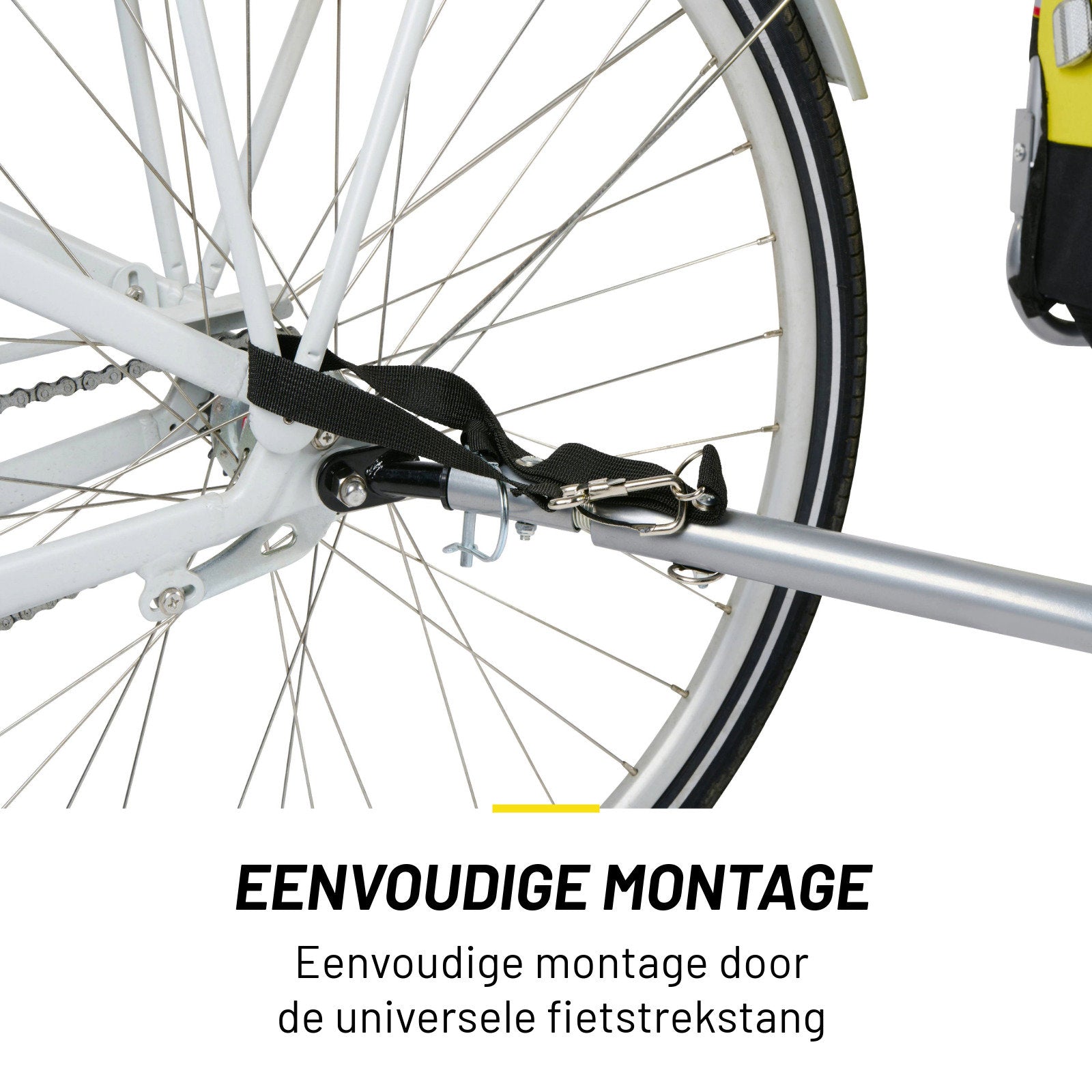 De montage van de kar aan je fiets is eenvoudig en zo gebeurd door de universele fietstrekstang. Je hoeft niet bang te zijn dat je de kar onderweg verliest. Hij zit stevig vast en is dubbel geborgd met een extra beveiliging. Je kunt dus met een gerust hart de weg op met je lievelingsdier.