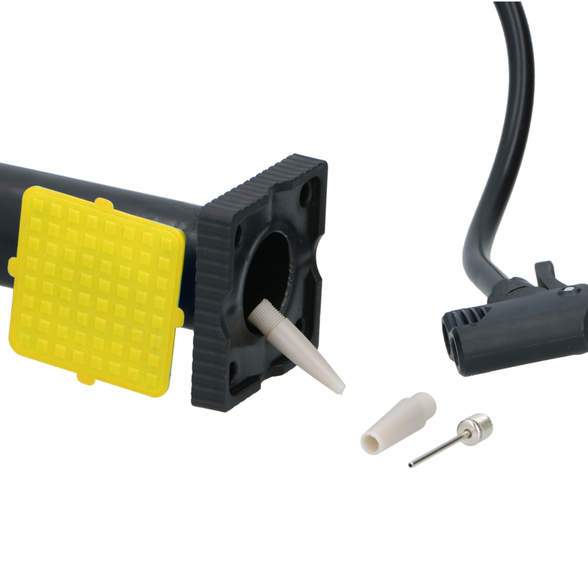 Bij de voetpomp krijg je 3 verschillende adapters die passen op Schrader, Dunlop en Presta ventielen. De adapters zitten netjes opgeborgen in de buis van de pomp. Bij de voetpomp krijg je 3 verschillende adapters die passen op Schrader, Dunlop en Presta ventielen. De adapters zitten netjes opgeborgen in de buis van de pomp die afgesloten wordt met een klepje.