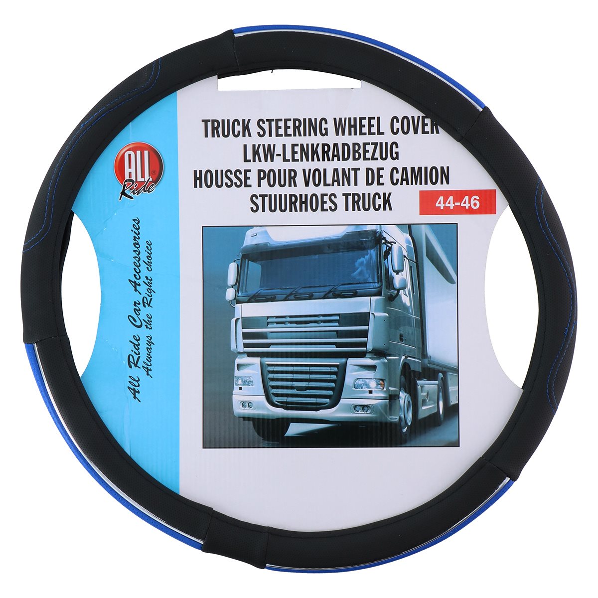 De hoes is universeel en past op elk vrachtwagenstuur van 44 tot 46 centimeter doorsnee. Deze All Ride vrachtwagenstuurhoes is gemaakt van polyurethaan kunstleer. Dit materiaal zorgt voor een strakke uitstraling en oogt modern en sportief uit. De stiksel zijn in net als de dikkere verstevigingsstukken blauw van kleur. Naast een visueel accent, zorgen deze verstevigingsstukken voor extra grip.