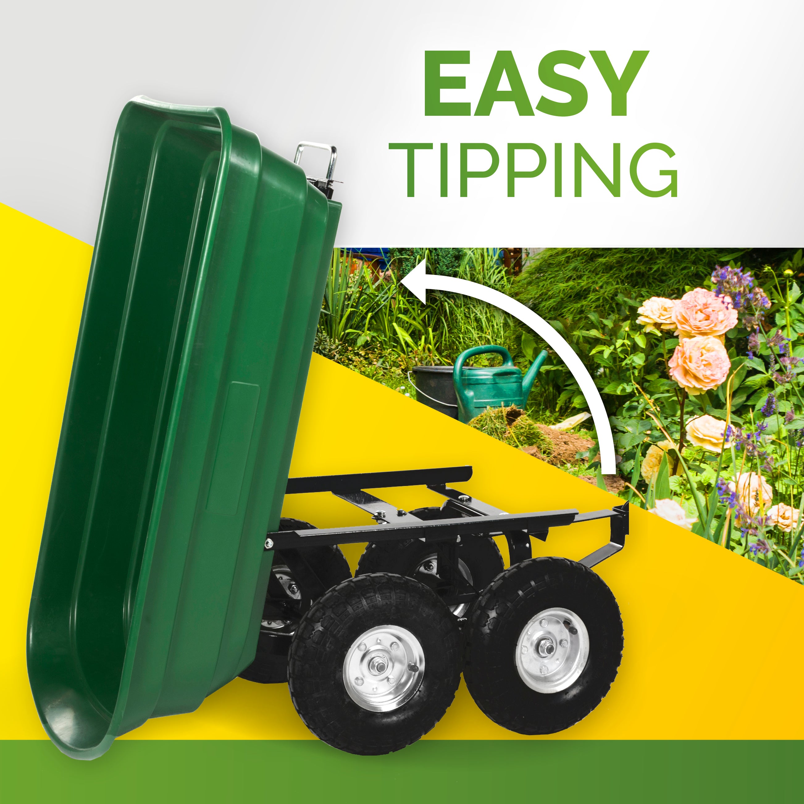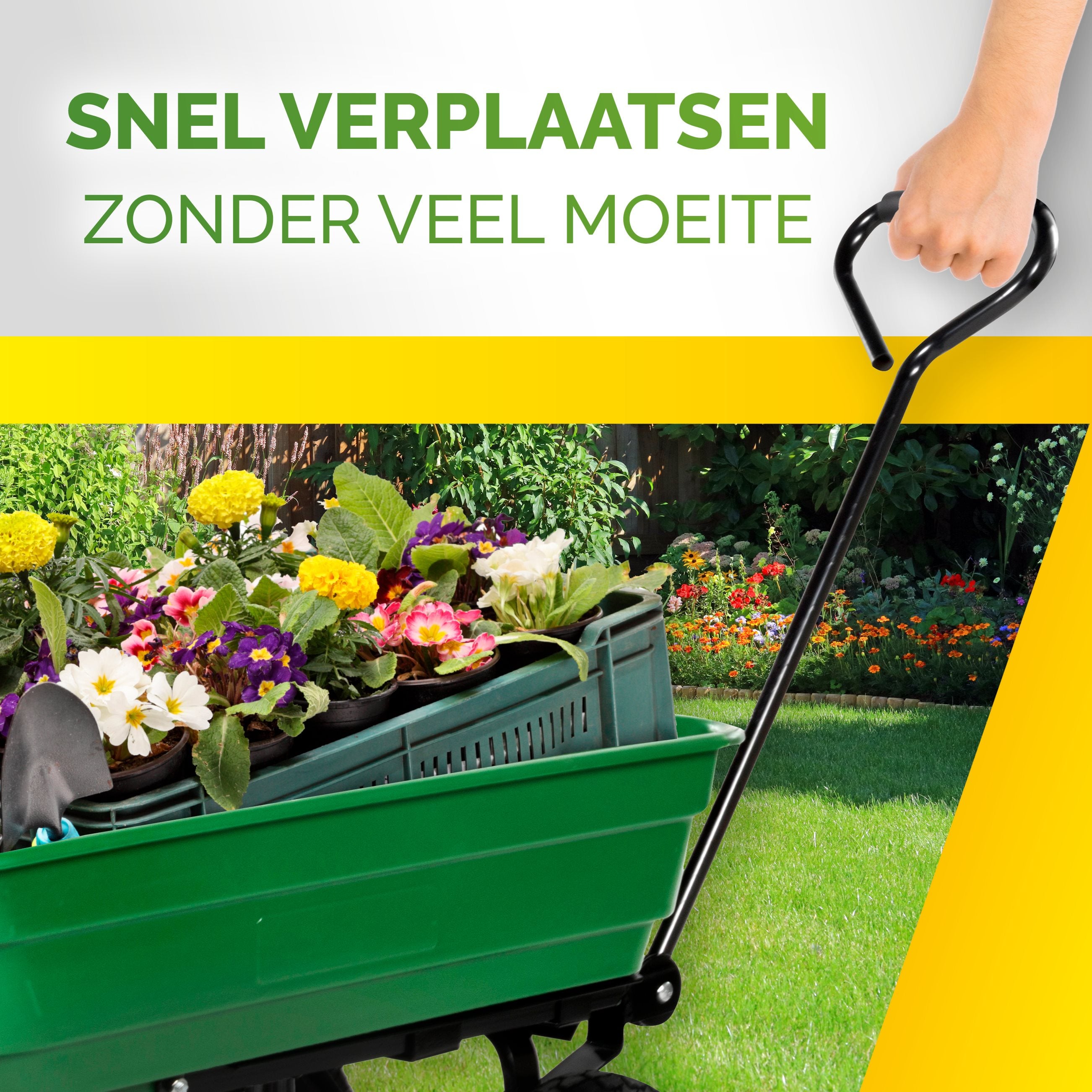 Deze transportkar is voorzien van een kiepfunctie. Zo kun je bijvoorbeeld je tuinaarde of bladafval gemakkelijk lossen op een andere plek in de tuin. Dit zorgt ervoor dat je weinig kracht hoeft te gebruiken en je zonder moeite tuinspullen kan verplaatsen.