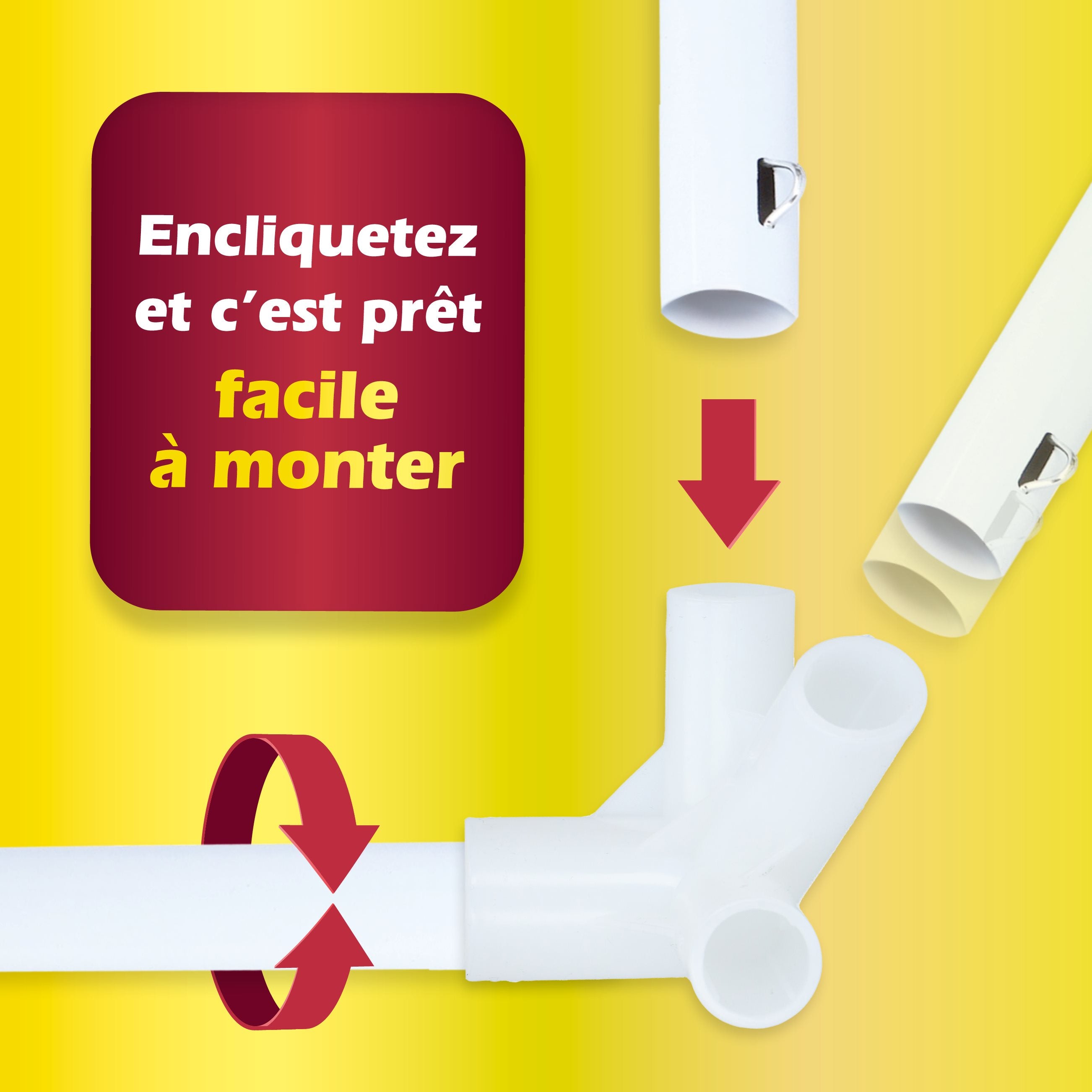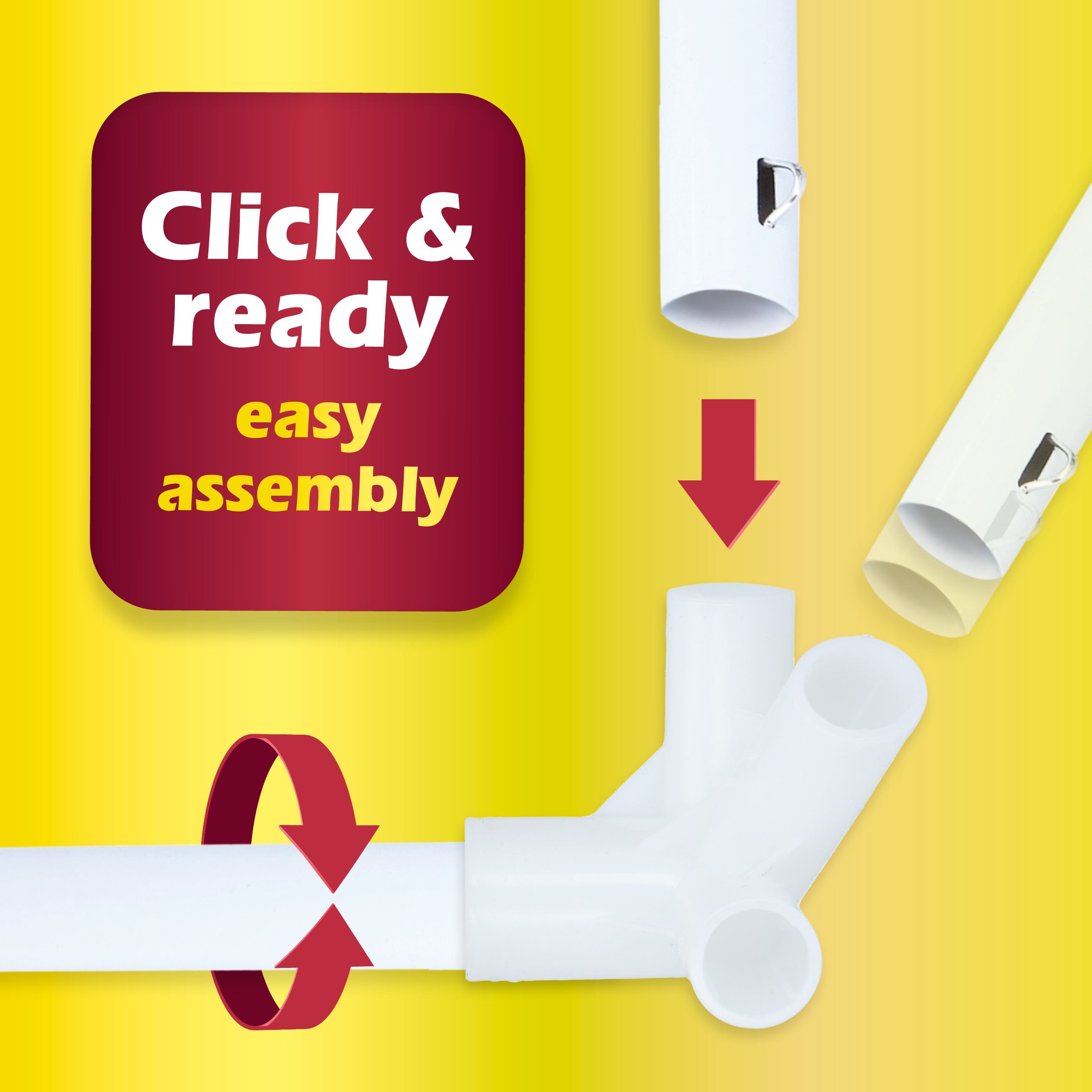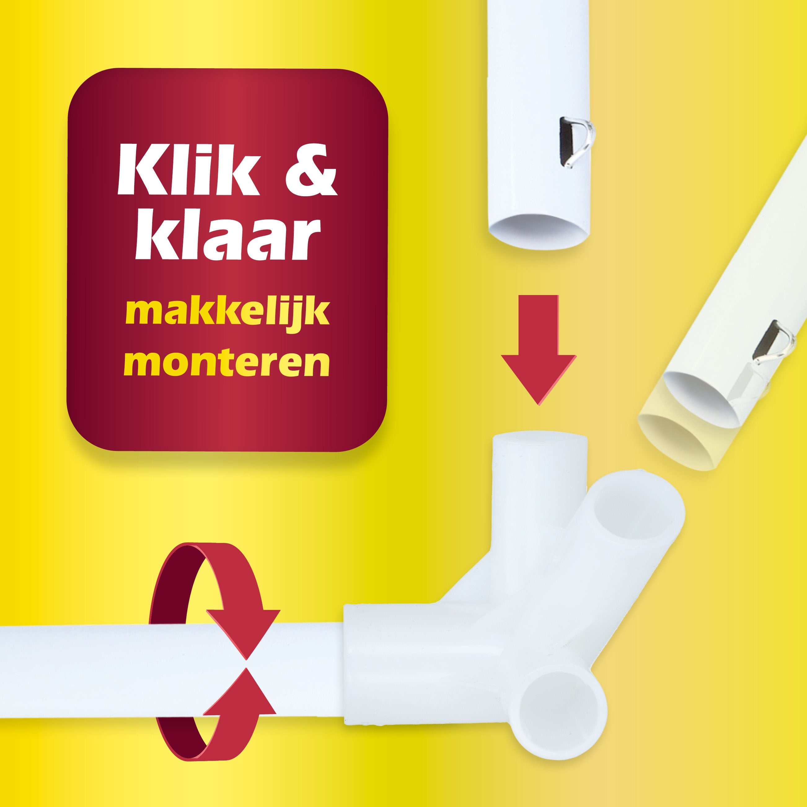 Het stalen tentframe met witte poedercoating klik je gemakkelijk in elkaar. De poten variëren in doorsnee tussen de 18 en 24 mm. Bij de set zitten ook 6 scheerlijnen en 12 tentharingen voor extra stevigheid.