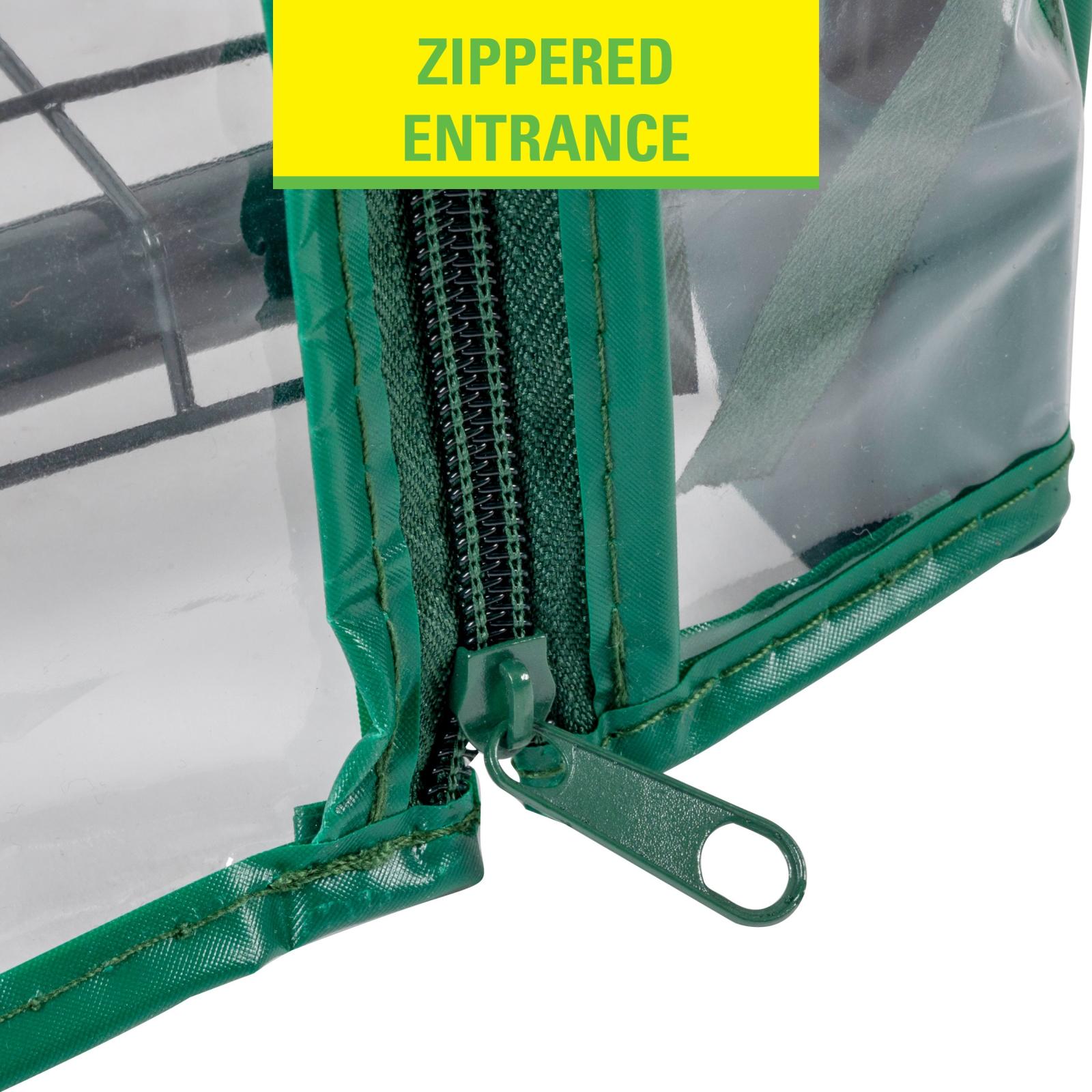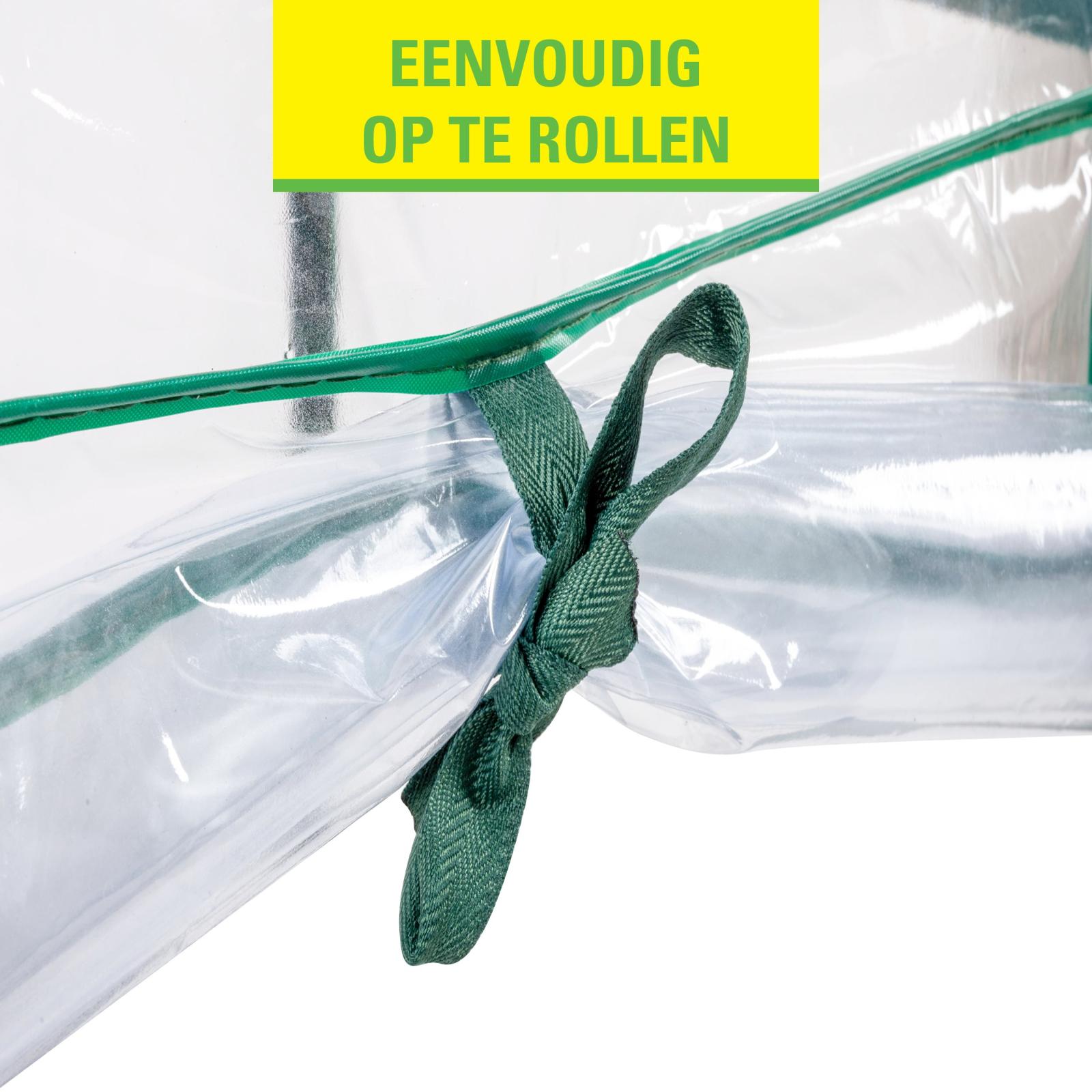 De kas open en sluit je met een rits. Daarnaast rol je de voorkant op voor gemakkelijke en snelle toegang. Dit model biedt ruimte aan veel van je planten door de twee verdiepingen en een omvang van 45 x 50 x 80 centimeter. Het transparante kunststof van de weersbestendige hoes zorgt dat er genoeg zonlicht bij de planten komt. De donkergroene accenten laten de broeikas opgaan in iedere tuin.