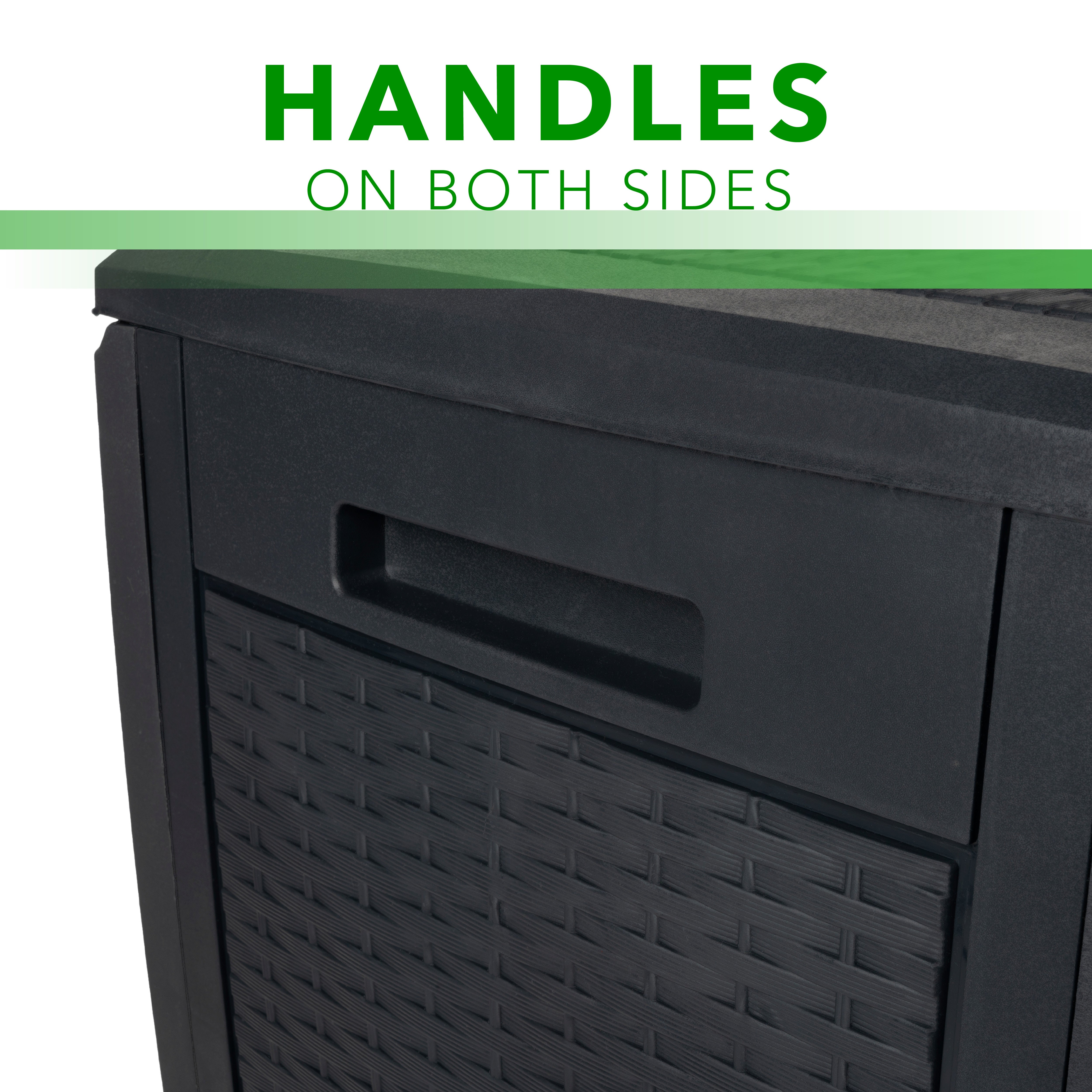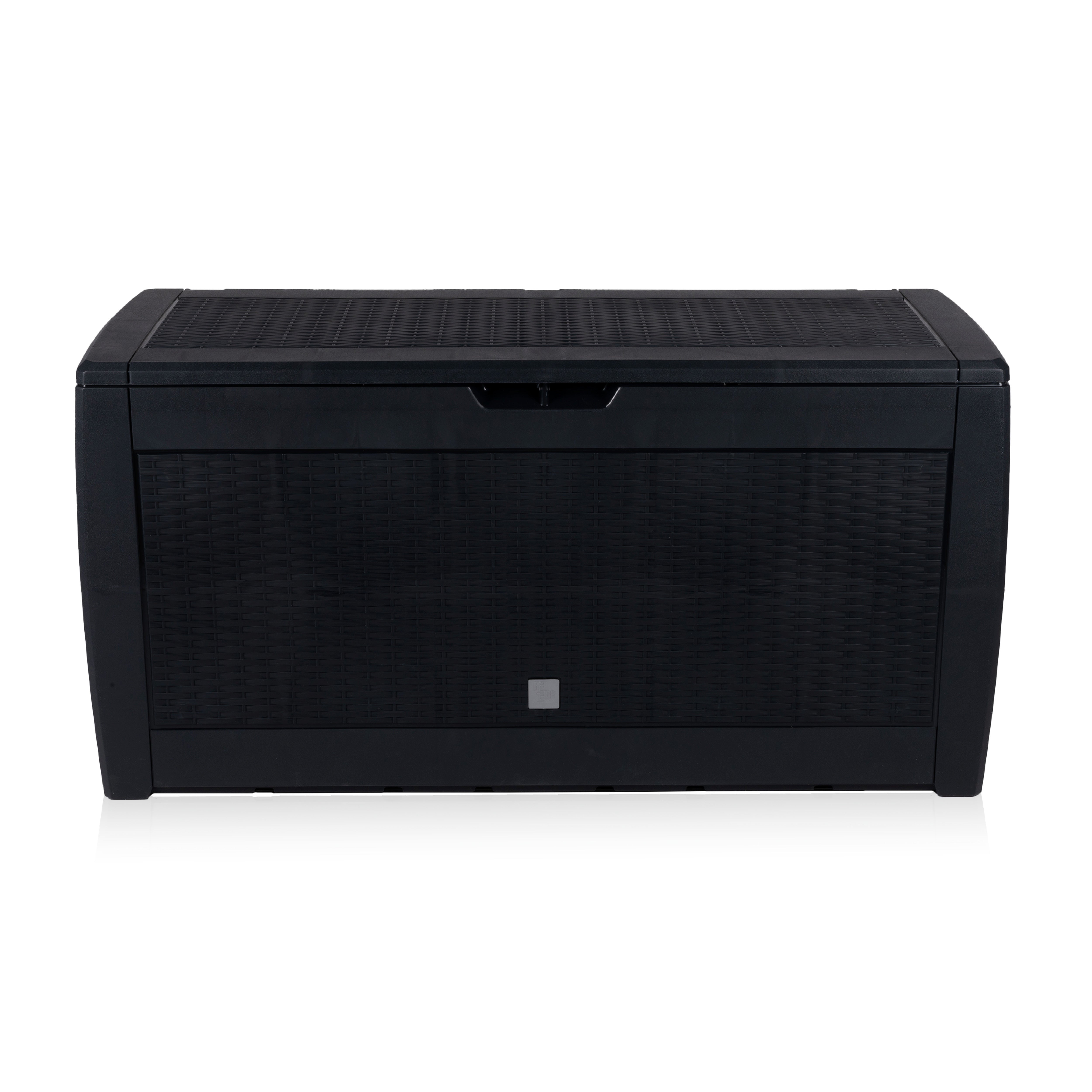 In deze universele opbergbox voor in de tuin of op het balkon berg je van alles op. Tuinkussens, speelgoed en andere tuinspullen bescherm je zo tegen regen en andere weersomstandigheden of vervuiling. Alles voor buiten kun je kwijt in deze royale bak van 310 liter inhoud. De box met deksel is gemaakt van stevig en duurzaam kunststof en heeft een moderne zwarte 'wickerlook'. Je hoeft hem dus niet uit het zicht te zetten, want hij ziet er fraai en elegant uit.