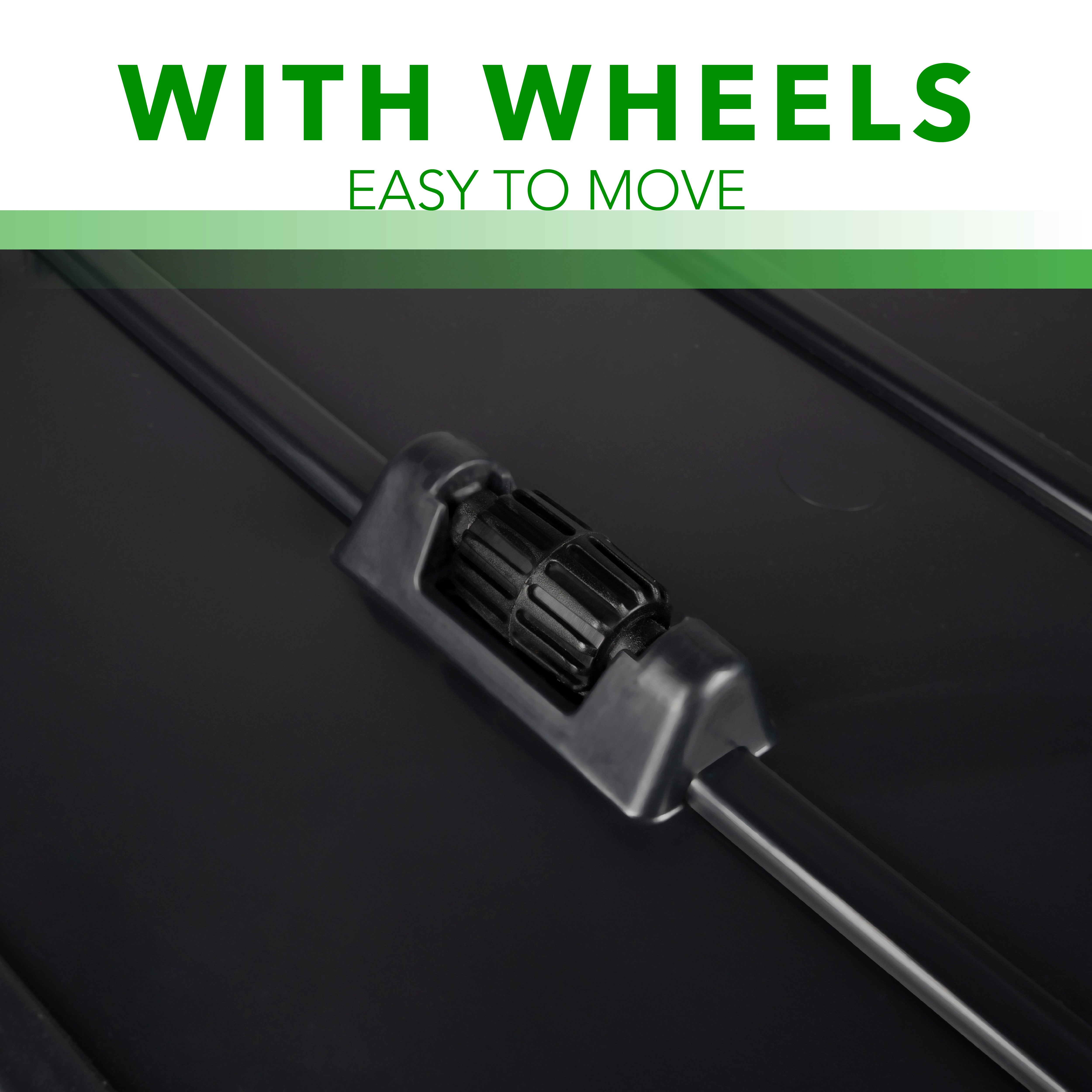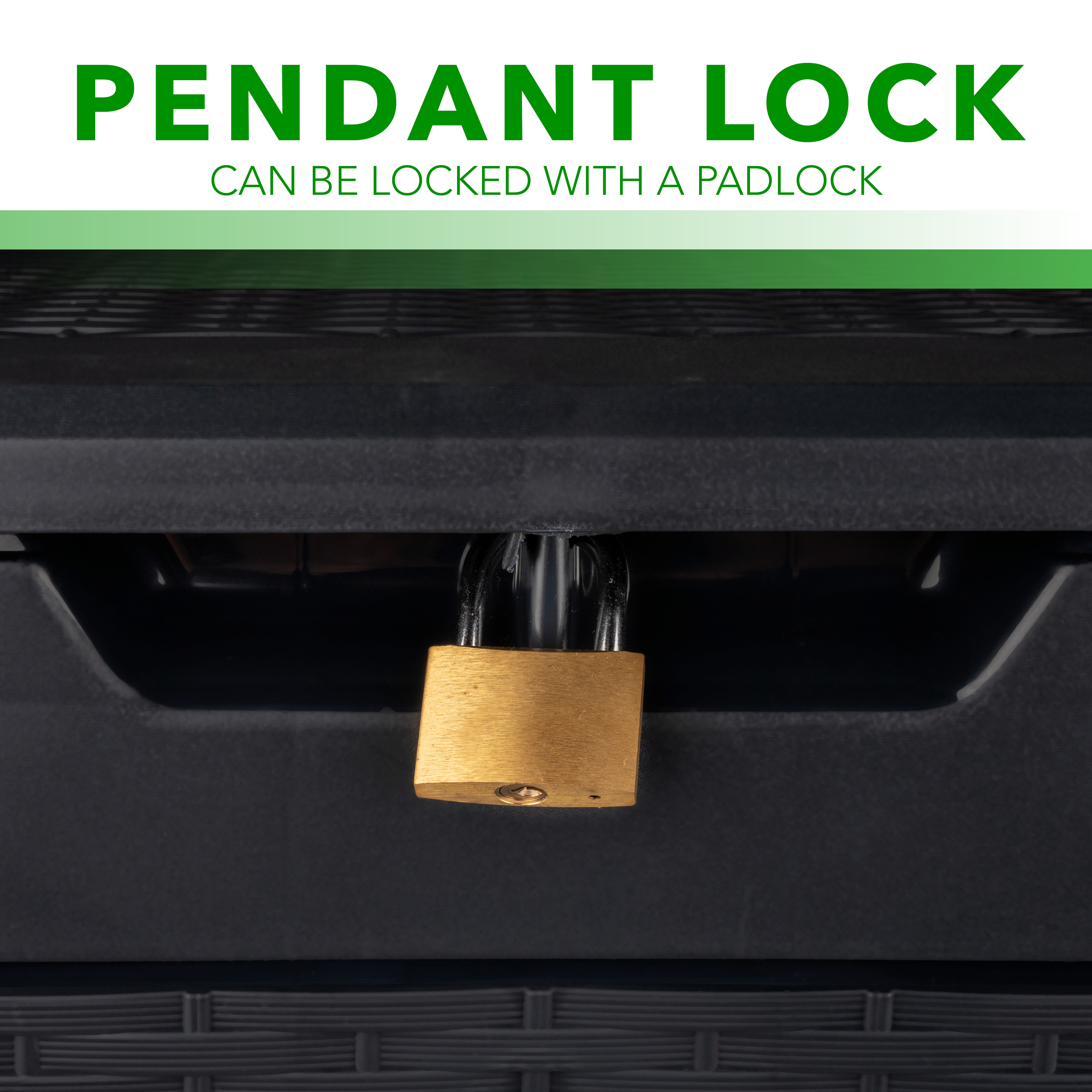 Deze tuinkussen box is uitgerust met handvatten aan beide zijkanten zodat je hem gemakkelijk oppakt. Ook zitten er wielen onder. Hierdoor is hij ook eenvoudig te verplaatsen als hij wat zwaarder beladen is. De stevige box is tevens afsluitbaar. Door de openingen aan de voorkant haal je gemakkelijk een hangslot om de opbergvak op slot te doen. Zo geef je dieven geen kans en zitten je spullen veilig opgeborgen.