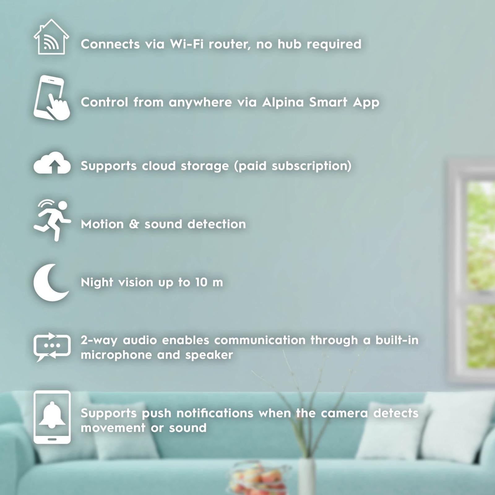 De alpina Smart home camera maakt verbinding via de wifi router. Je hebt dus geen extra hub nodig om de bewakingscamera te laten werken. De wifi camera geeft je niet alleen toegang tot live beelden vanuit huis, maar slaat opnames ook op, zodat je ze op een later moment terug kan kijken. De camera heeft ruimte voor een MicroSD kaart van 128 GB (niet inbegrepen). Voor extra opslagruimte kun je via een los abonnement beelden in de cloud opslaan.