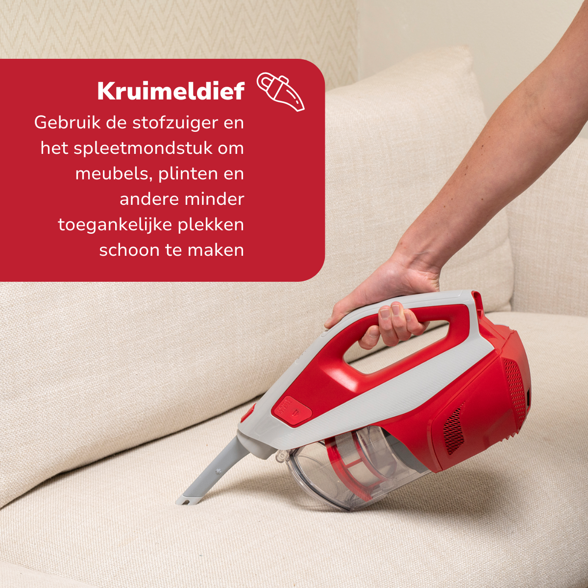 Met de 2-in-1 steelstofzuiger van Dirt Devil haal je niet alleen een snoerloze stofzuiger in huis, maar ook een kruimelzuiger De stofzuiger wordt geleverd met een combiborstel, steel en kierzuigmond. Met de steel en combiborstel maak je snel en gemakkelijk verschillende vloertypes schoon. Door de steel te verwijderen en de kierzuigmond vast te klikken tover je de draadloze steelstofzuiger in een handomdraai om tot handstofzuiger. Zo kom je ook makkelijk op anders moeilijk schoon te maken plekken zoals kieren en hoekjes. Door zijn gewicht van 2,15 kilogram en de afwezigheid van een snoer, manoeuvreer je de stofzuiger gemakkelijk door het huis heen.