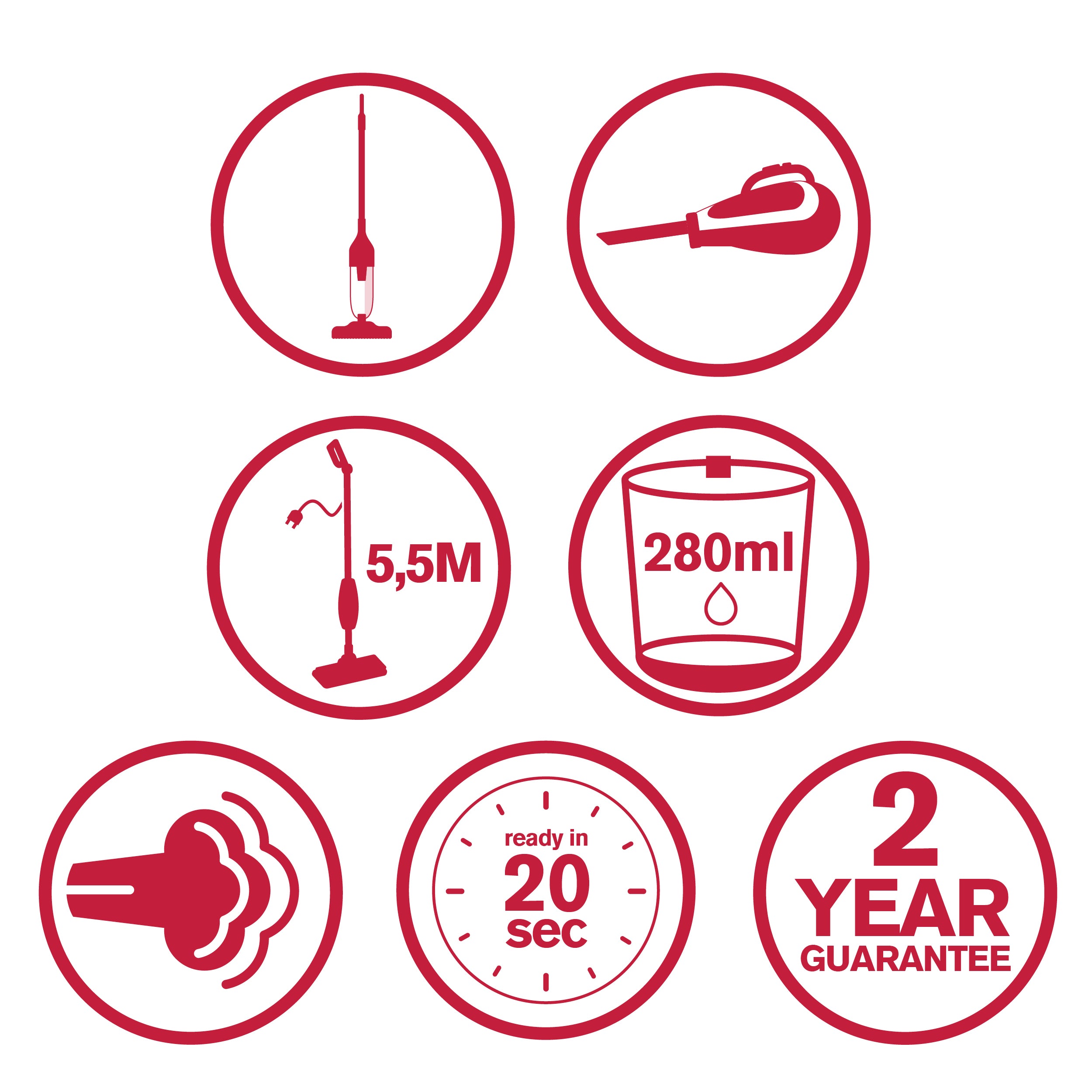 Met de 2-in-1 stoomreiniger en handstomer van Dirt Devil haal je een complete set in huis om het hele huis schoon en hygiënisch te maken. De stoomdweil en handstomer wordt geleverd met een vloerborstel, tapijtloper en 5 verschillende opzetstukken voor zelfs de meest hardnekkige schoonmaak klussen. De watertank heeft een capaciteit van 280 milliliter. Daarnaast heeft de stoomreiniger ook nog een reinigingsmiddelen reservoir met ruimte voor 150 ml schoonmaakmiddel. Met een volle watertank kun je de stoomdweil 20 minuten aan een stuk gebruiken. Hierdoor heb je ten alle tijden schone en hygiënische vloeren. Door de steel van de stoommop te verwijderen en het geïntegreerde handvat te gebruiken tover je de stoomdweil in een handomdraai om tot een handstomer. Als handstomer kun je de stoomreiniger gebruiken voor het reinigen van onder andere gordijnen, kleding en meubels, maar ook voor het verwijderen van vlekken op je fornuis, de velgen van je auto en zelfs hardnekkige vlekken uit ovens.