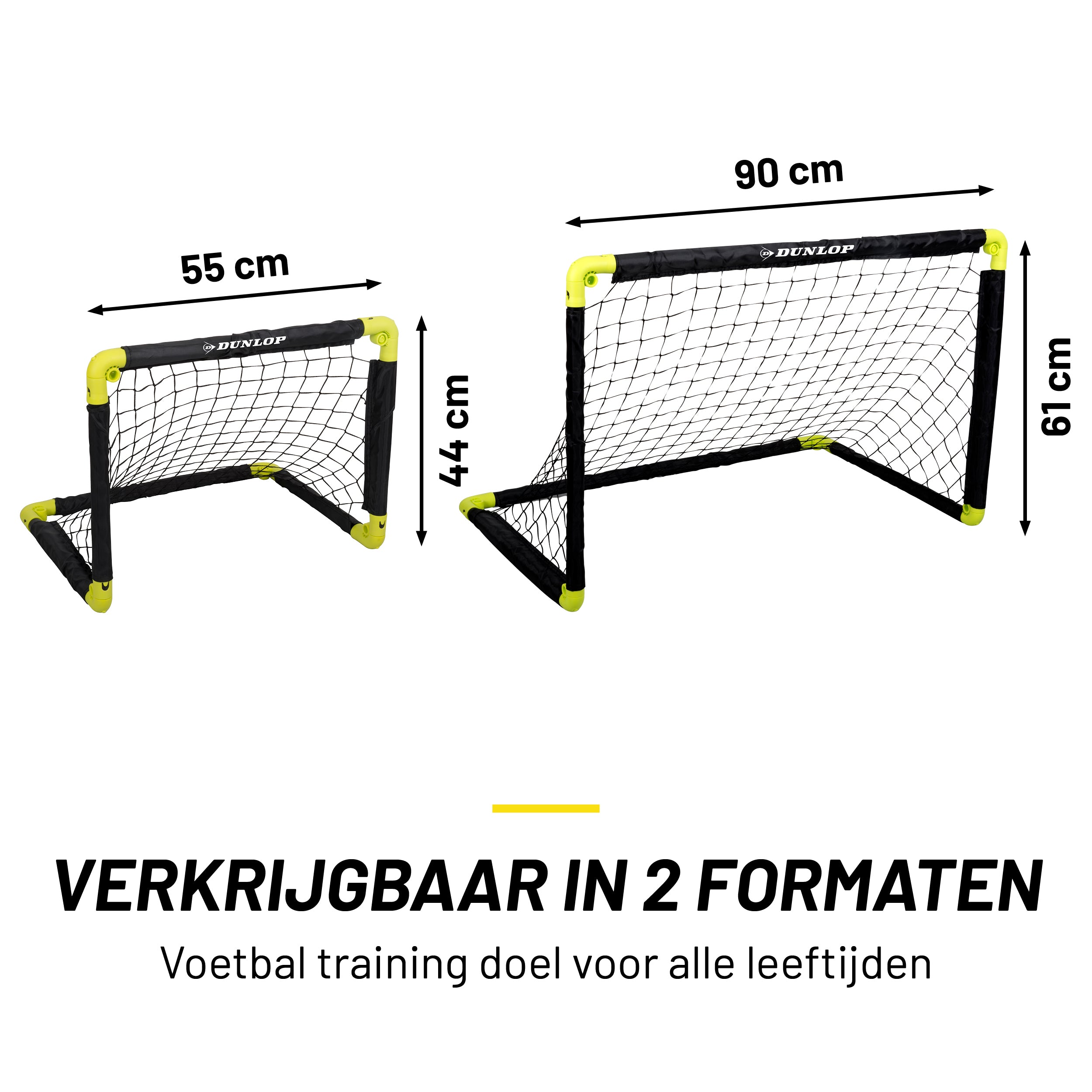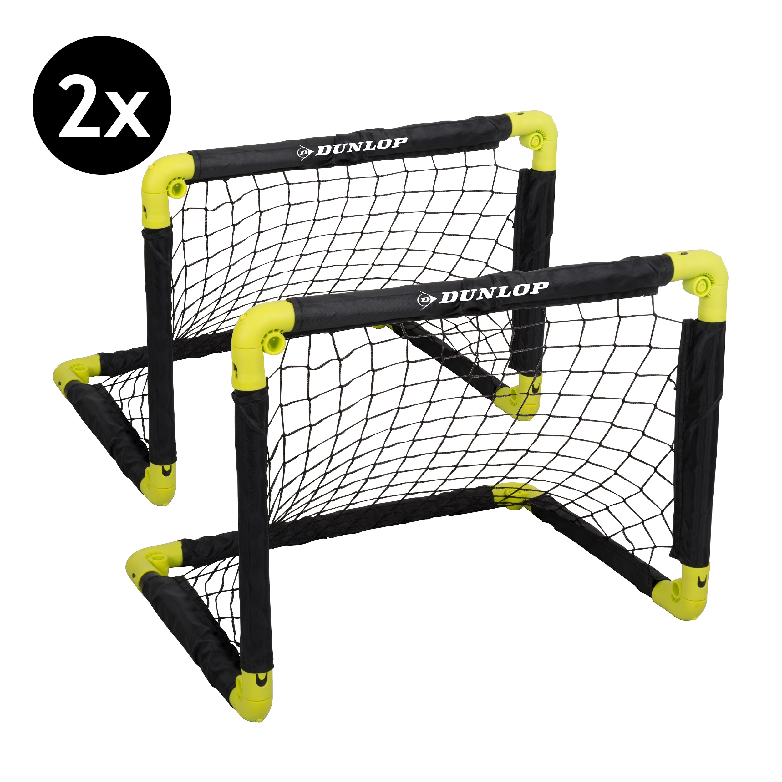 Daag elkaar uit met een partijtje voetbal of verbeter je scoringskansen met deze set van 2 opvouwbare mini-voetbalgoals van Dunlop. Je hebt ze met het kliksysteem zo opgezet. De 4 meegeleverde grondpinnen zorgen dat de goals stevig staan. De goals zijn gemaakt van polypropyleen, een stevig kunststof. Ze zijn grotendeels zwart met felgele details op de hoeken.