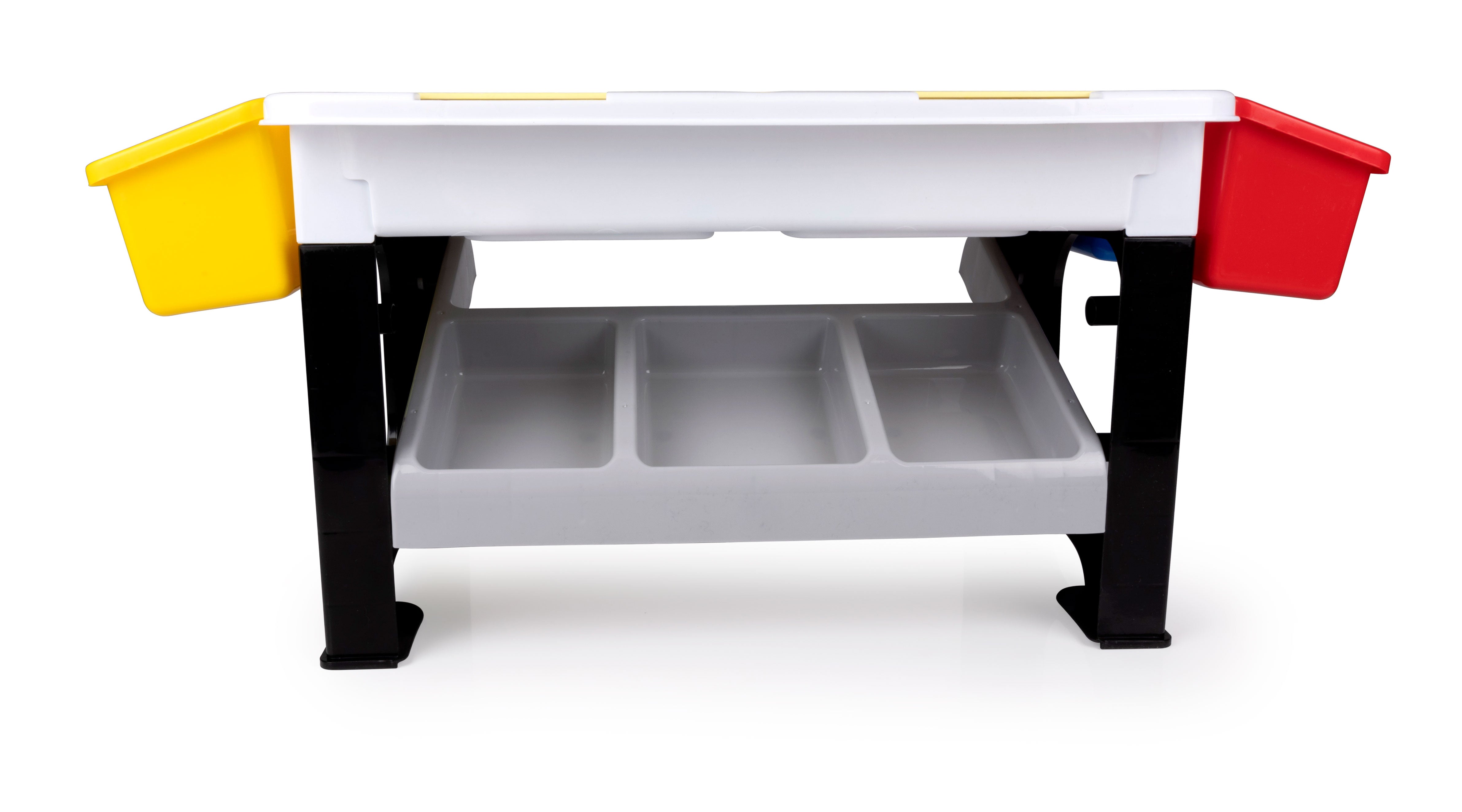 De speeltafel biedt veel opbergruimte. Onder het bouwoppervlak zit een grote bak waar je de stenen in kan opbergen. Daaronder, tussen de poten, zitten 3 vakken die schuin hangen, zodat je kleintje gemakkelijk bij de blokjes kan. En dan heb je ook nog eens 4 gekleurde opbergbakken die je aan de zijkant kan klikken.