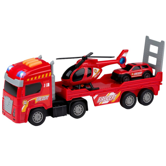 - Inhoud: Brandweertruck met oplegger, brandweerauto en helikopter