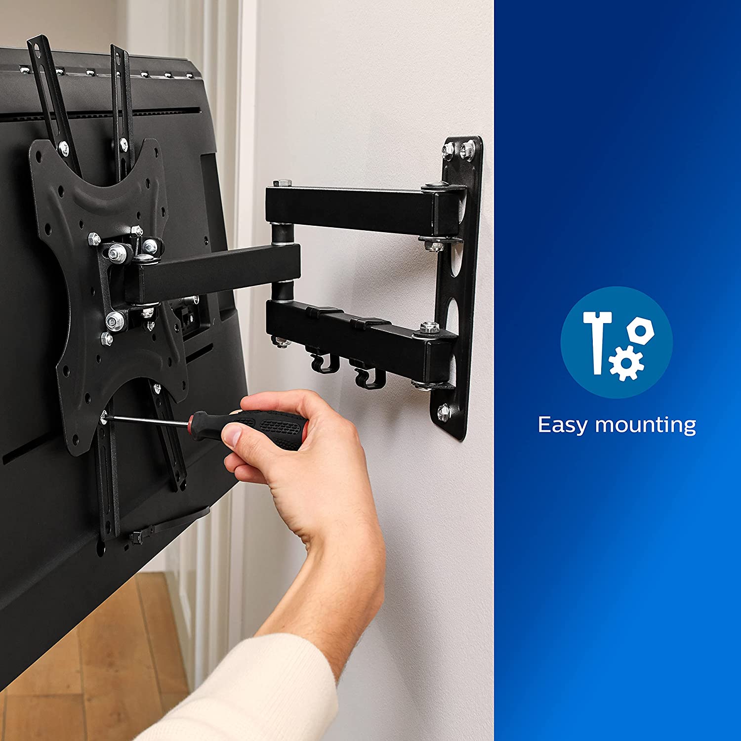 Je bevestigt de Philips SQM9232/10 muurbeugel gemakkelijk en snel aan vrijwel elke wand. De 1-2-3 installatieset die meegeleverd wordt met het ophangsysteem bevat schroeven, pluggen en bouten voor verschillende soorten muren en sjablonen. Hierdoor kun je de wandbeugel na ontvangst vrij snel in gebruik nemen. Mocht de TV muurbeugel niet helemaal waterpas hangen, dan kun je hem na bevestiging nog corrigeren bij het horizontaal monteren van de TV.