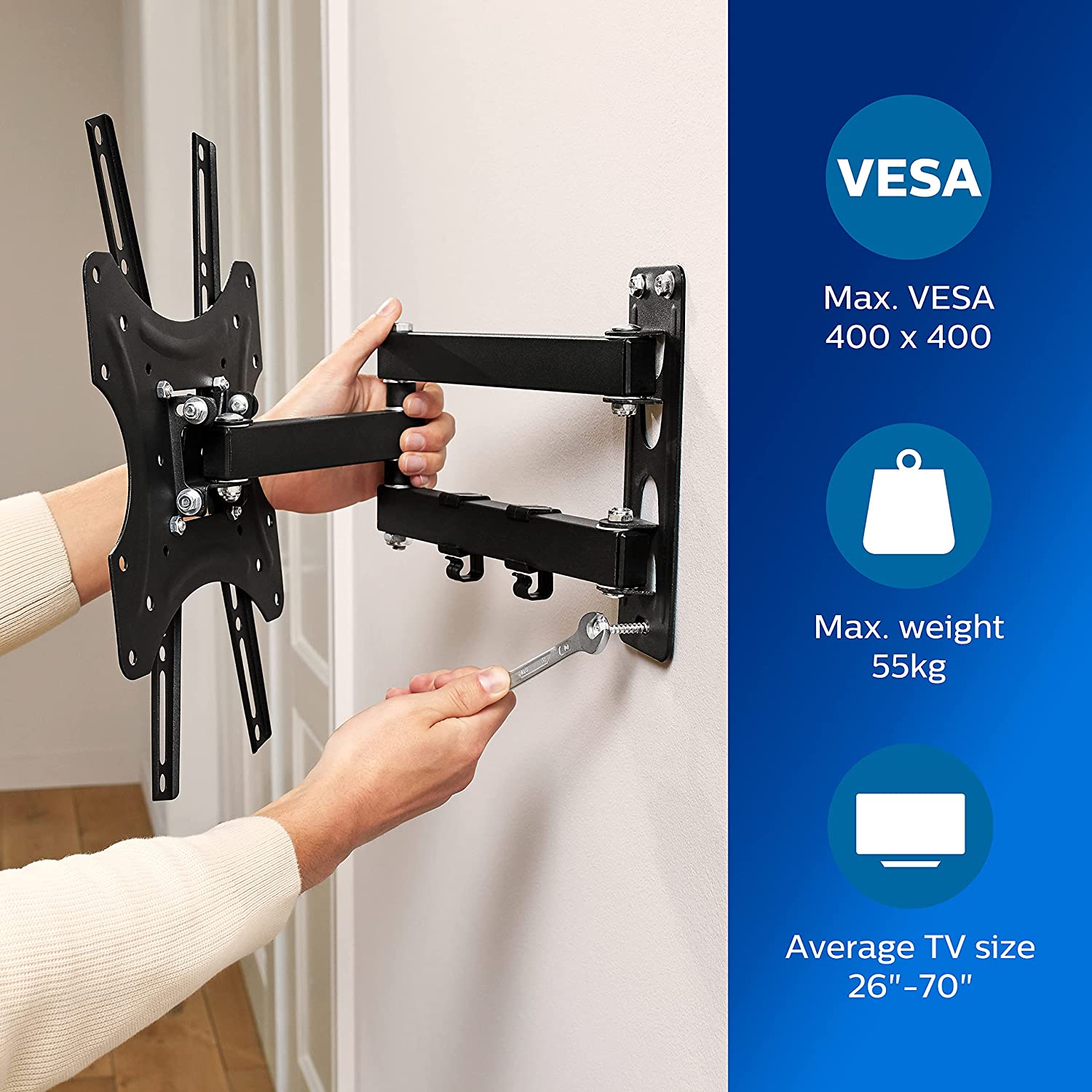 De TV muurbeugel van Philips is universeel en dus te gebruiken op verschillende TV's. De wandbeugel is geschikt voor TV's met een maximaal gewicht van 35 kilogram en een maximale grootte van 26 tot 70 inch. De TV wandbeugel is daarnaast compatibel met LCD, LED, OLED en QLED. Je kunt zowel platte als curved TV's aan de muurbeugel bevestigen. De wandbeugel is voorzien van VESA-patroon montagegaten. Deze komen overeen met de bevestigingspunten van de meeste TV's. Hierdoor past hij op verschillende VESA-maten: 75 x 75mm, 100 x 100 mm, 200 x 200 mm, 300 x 300 mm en 400 x 400 mm.