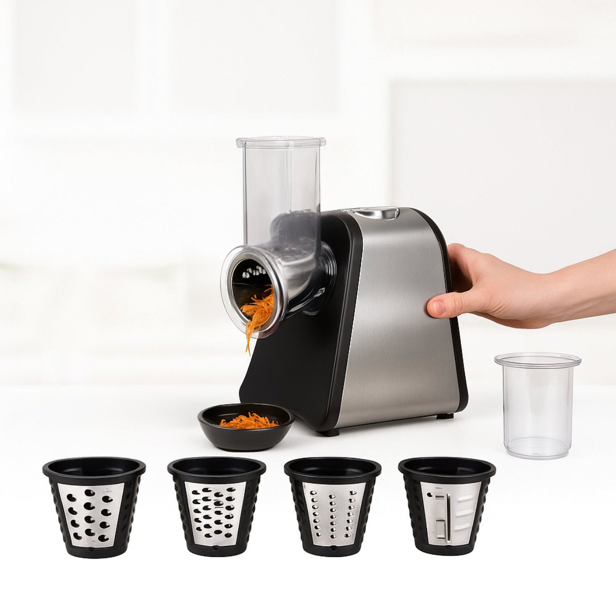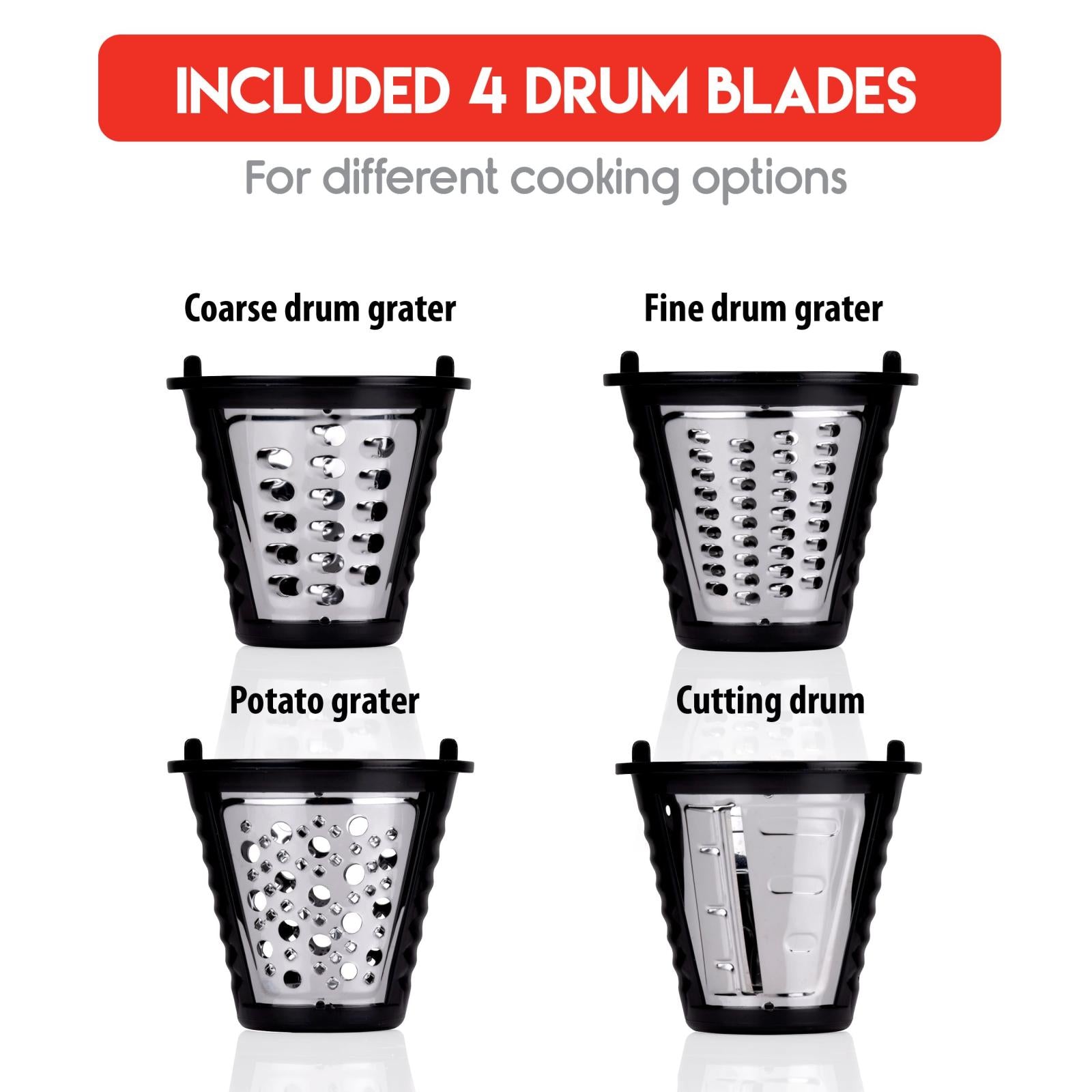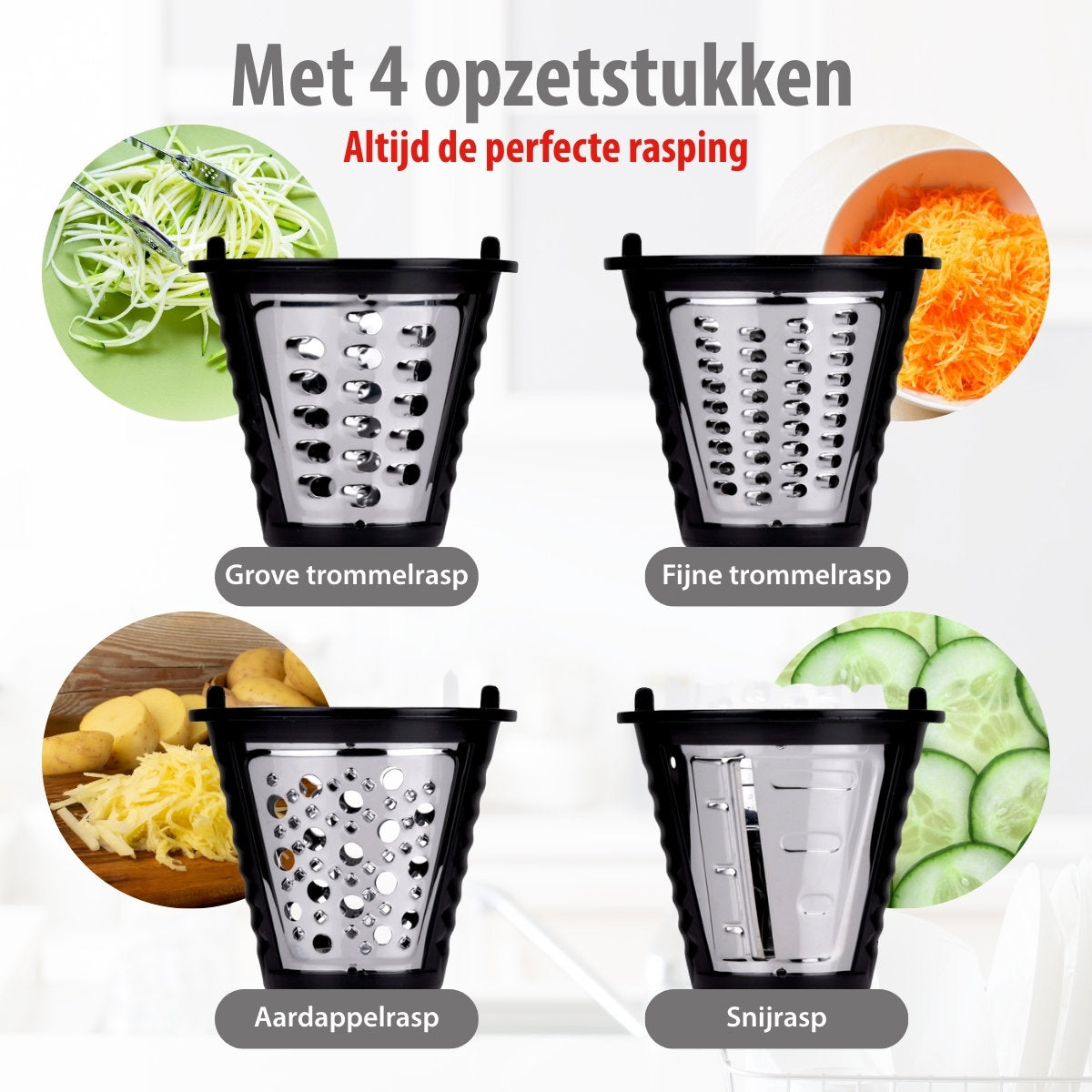 De elektrische rasp word geleverd met 4 messen bedoeld voor verschillende doeleinden. De fijne en grove snijtrommel raspen beide je groenten in schaafsels, maar zoals de naam suggereert in twee verschillende maten: grof of fijn. Met de meegeleverde pureertrommel bewerk jij aardappels fijn genoeg als goede basis voor een puree. Als laatste krijg je ook nog een plakkensnijtrommel meegeleverd, hiermee snijd je komkommer in plakjes of bespaar zeeën van tijd tijdens de bereiding van een heerlijk ratatouille recept!