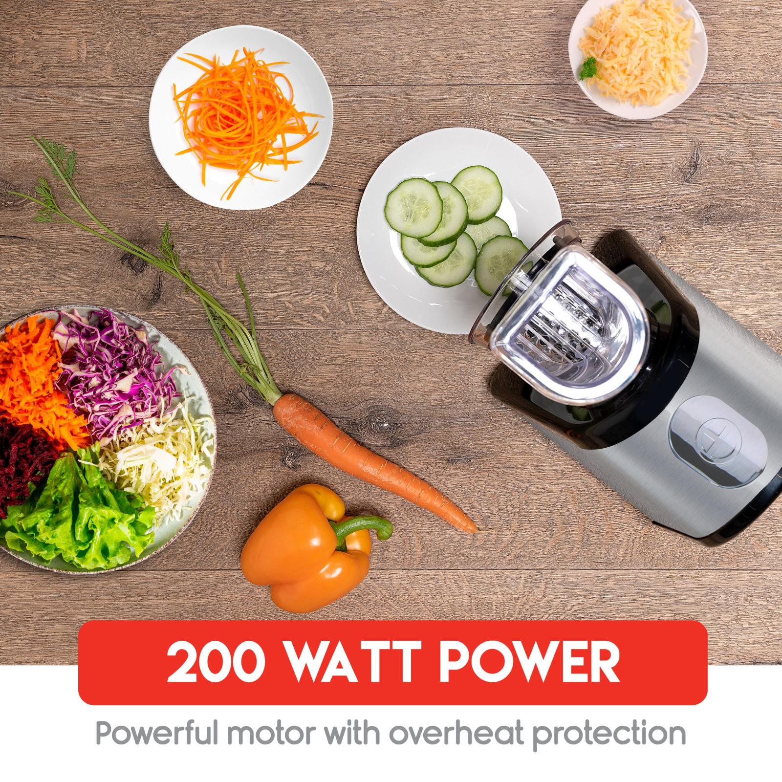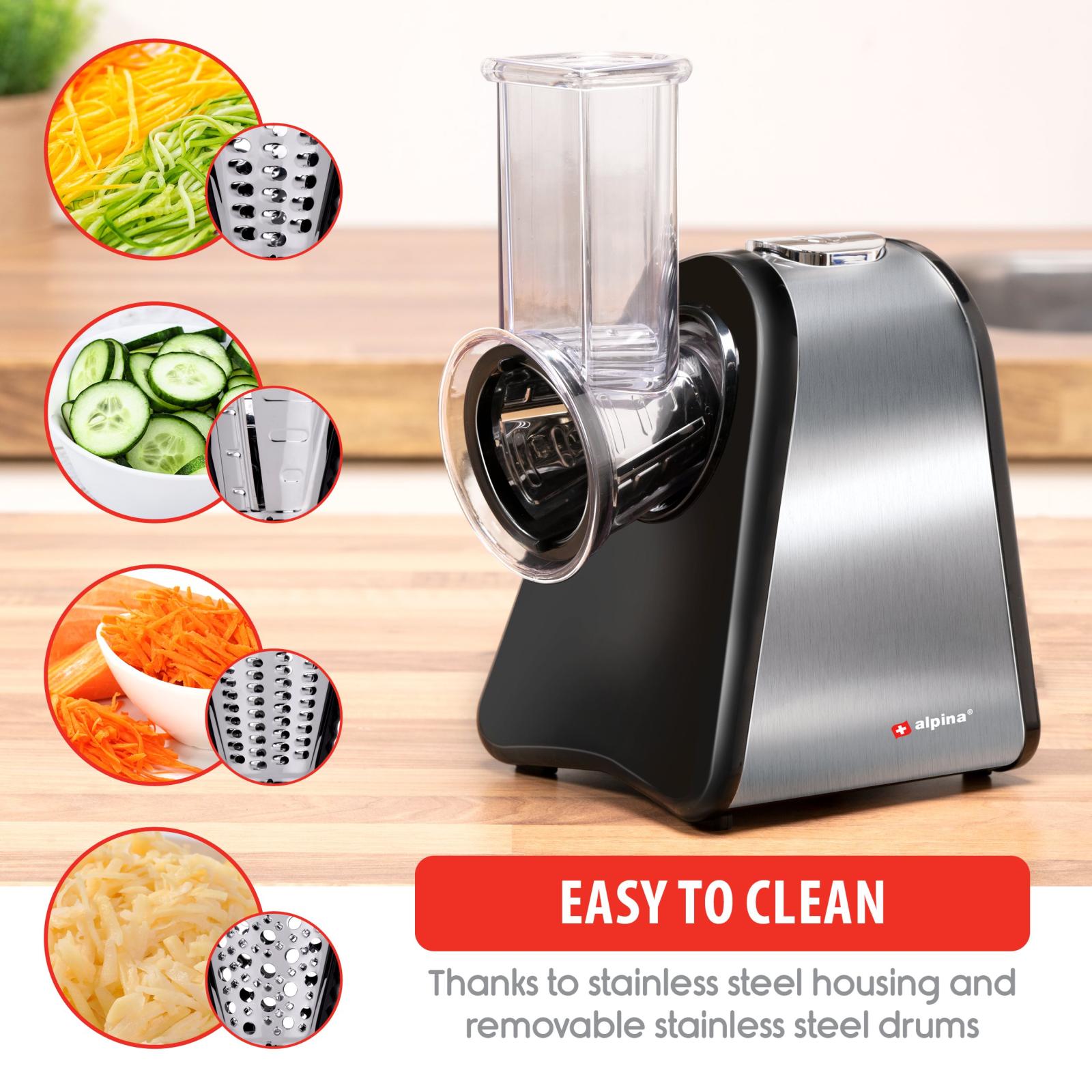 Met deze 4-in-1 elektrische groentesnijder van alpina bespaar je tijd en moeite in de keuken. Jij maakt in een handomdraai een gezonde ovenschaal of groentequiche met behulp van deze elektrische rasp, ook wel bekend als mandoline. Zowel de behulzing als de messen zijn gemaakt van stevig roestvrij staal en de krachtige 200 watt motor met oververhittingsbescherming bewerkt elke groente zonder problemen tot een werkbaar product. Deze multifunctionele groentesnijder wordt jouw nieuwe hulpje in de keuken!
