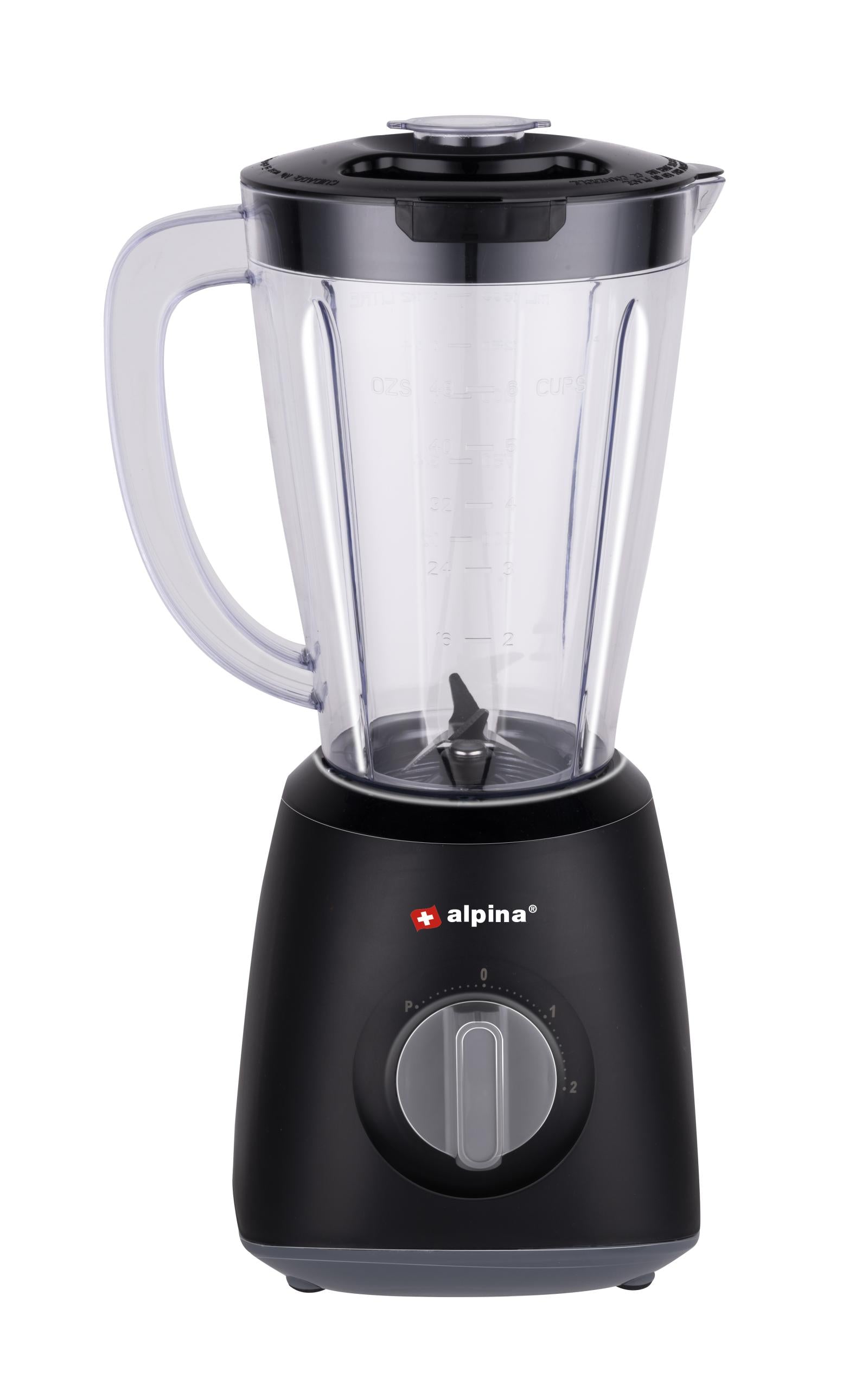 Met deze zwarte blender van Alpina maak je in een handomdraai sapjes, smoothies, soepen, sauzen, milkshakes en babyvoeding. De blender heeft een kan van kunststof met een ruime inhoud van 1,5 liter. Hierdoor heb je volop ruimte om allerlei fruit en/of groenten fijn te maken. Met de 4 vlijmscherpe, roestvrijstalen mesjes kan deze blender ook harde fruit- en groentensoorten aan.