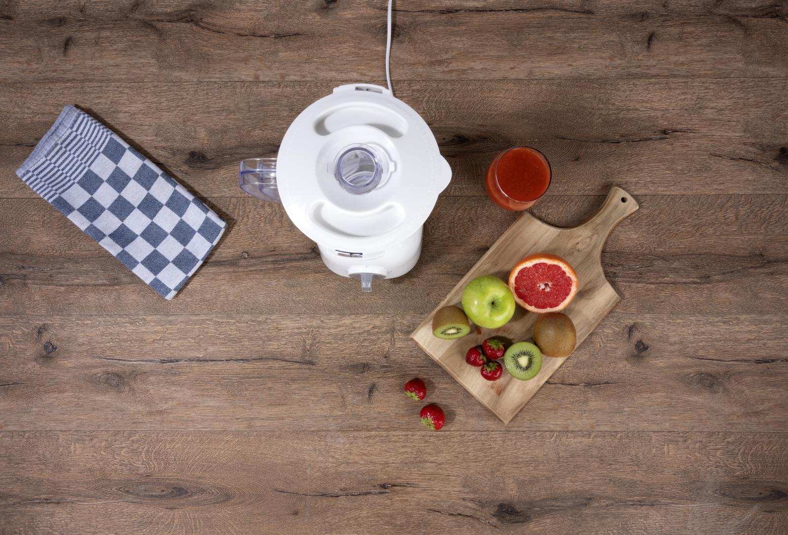 In de kunststof deksel zit een opening die is afgedicht met een klein maatbekertje. Hier voeg je eventuele kleine hoeveelheden ingrediënten toe, bijvoorbeeld wat kruiden, olie, water of melk. De grote kan heeft een maatverdeling, zodat je goed ziet hoeveel erin zit. Het handvat op de kan zorgt ervoor dat je de inhoud gemakkelijk uitschenkt.