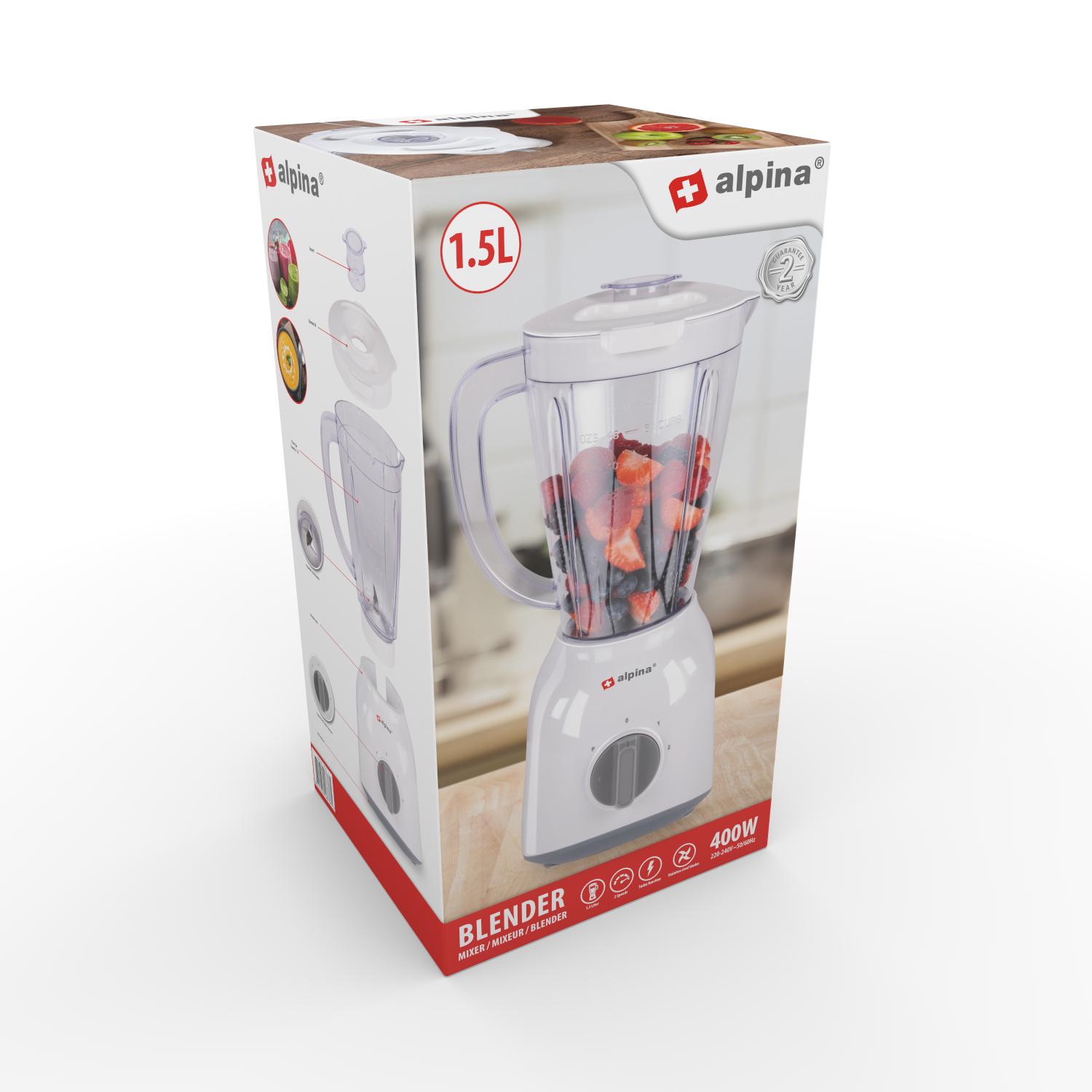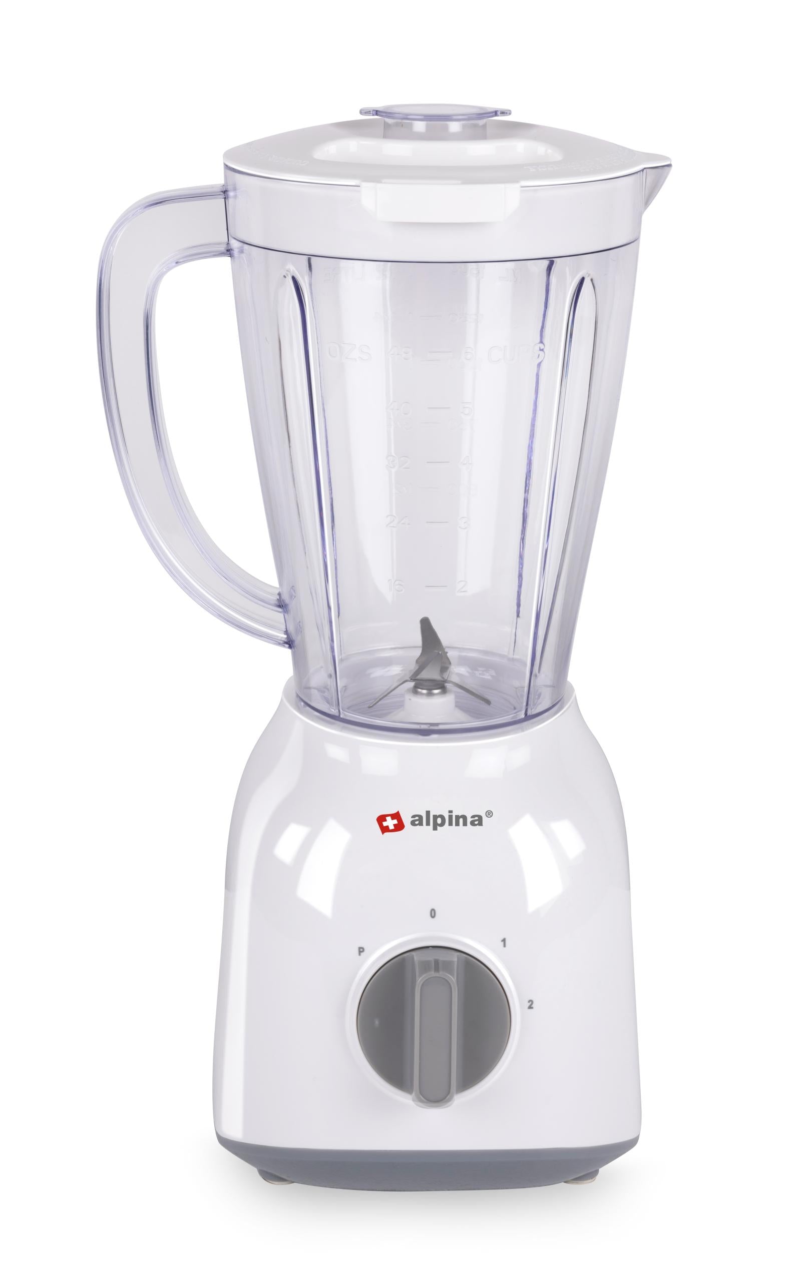 Sapjes, smoothies, soepen, sauzen, milkshakes, babyvoeding; die bereid je allemaal in deze handige en razendsnel werkende blender van kwaliteitsmerk alpina. De kunststof kan heeft een inhoud van 1,5 liter waardoor je de ruimte hebt om allerlei fruit en/of groenten fijn te maken. De 4 roestvrijstalen mesjes zijn vlijmscherp en kunnen ook harde fruit- en groentensoorten aan.
