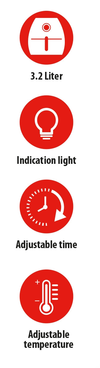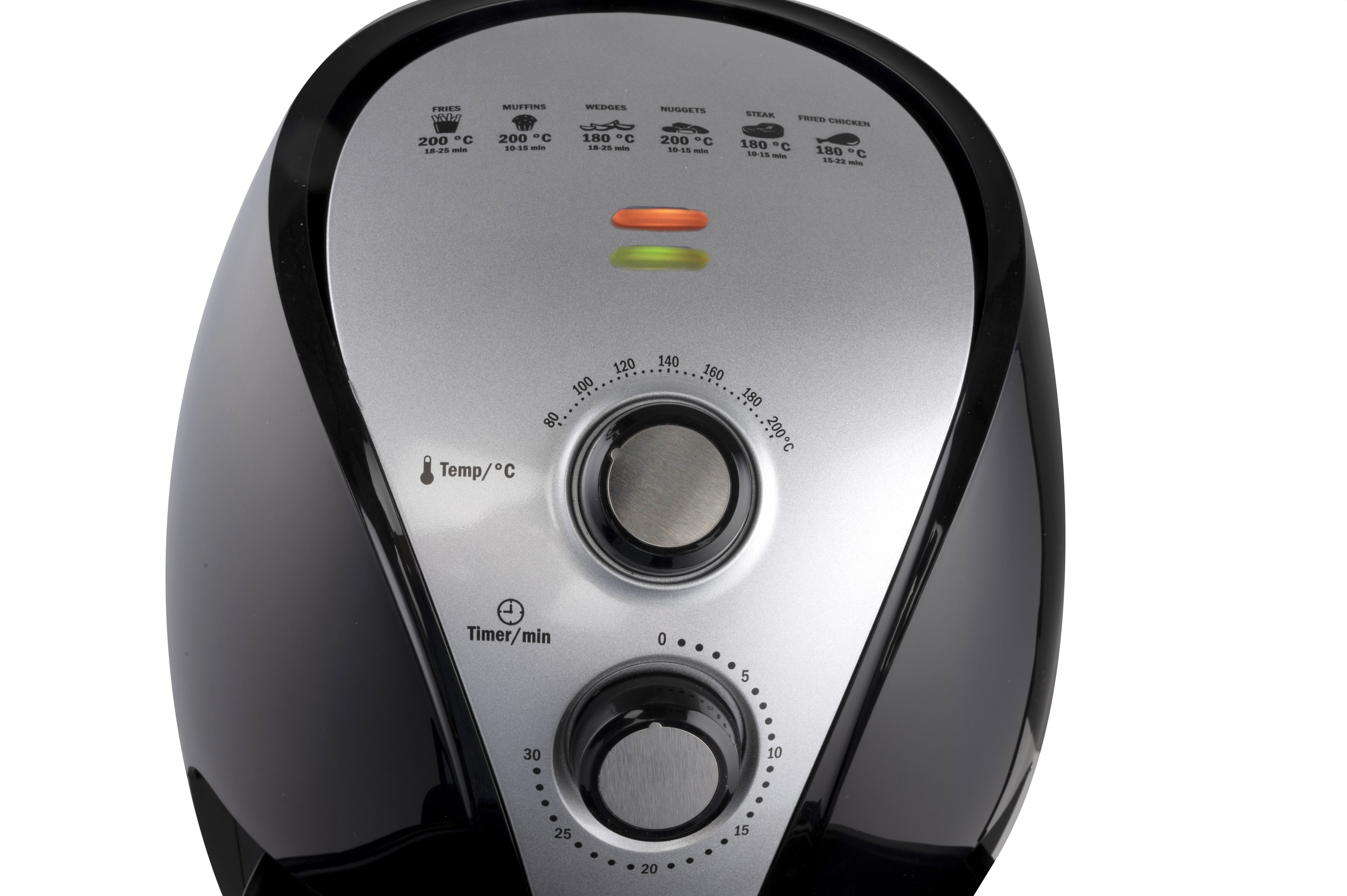 Bediening van de airfryer gaat gemakkelijk. De temperatuur stel je in met een draaiknop, variërend van 80 tot 200 graden Celsius. Aan de bovenzijde staan met icoontjes enkele suggesties qua bereidingstijd en temperatuur. Ook de timer werkt met een draaiknop, die je kan laten oplopen tot maximaal 30 minuten. Als de tijd verstreken is, hoor je een geluidsignaal. De airfryer heeft 2 indicatorlampjes. De groene lamp geeft aan of het apparaat in werking is, het oranjerode lampje is de warmte-indicator.