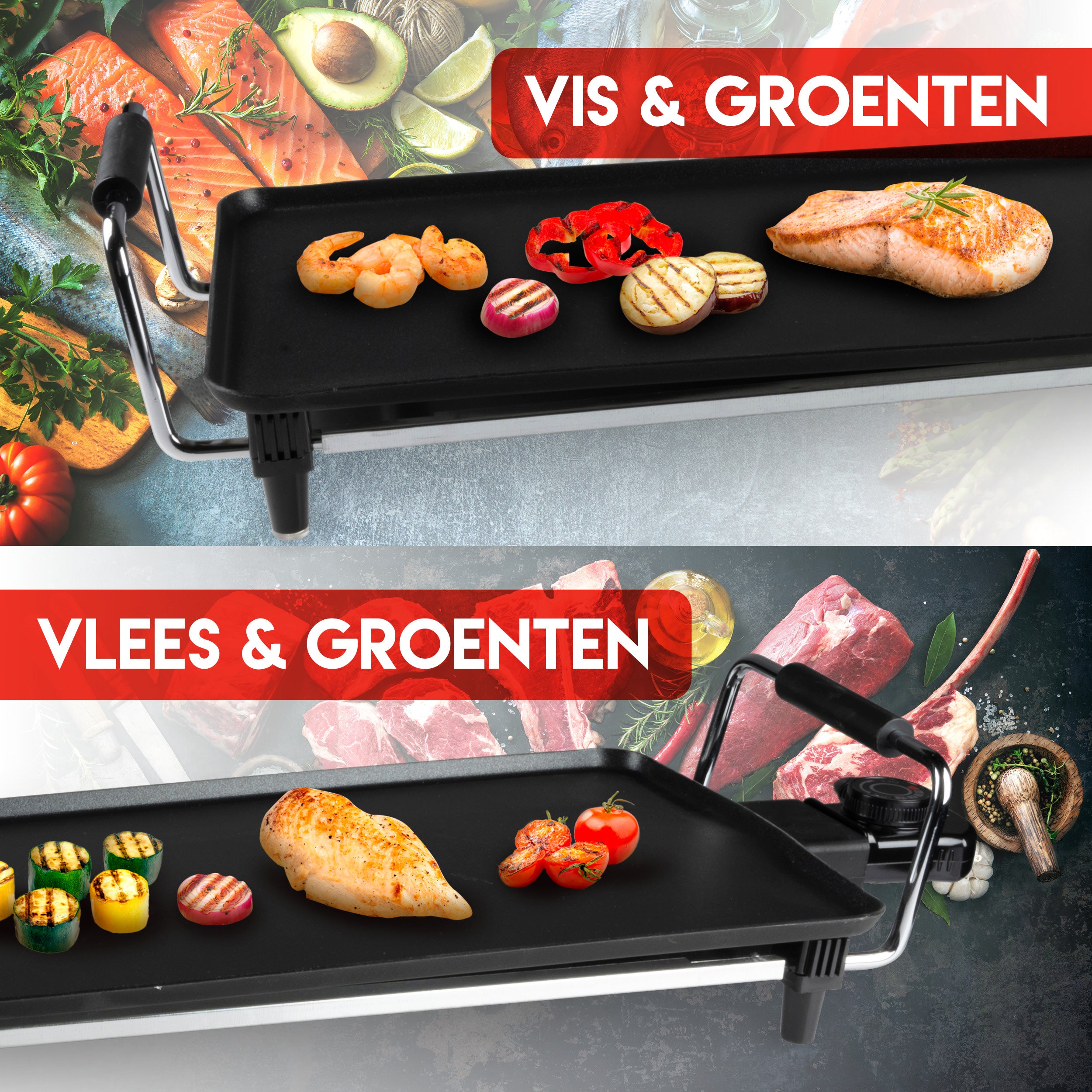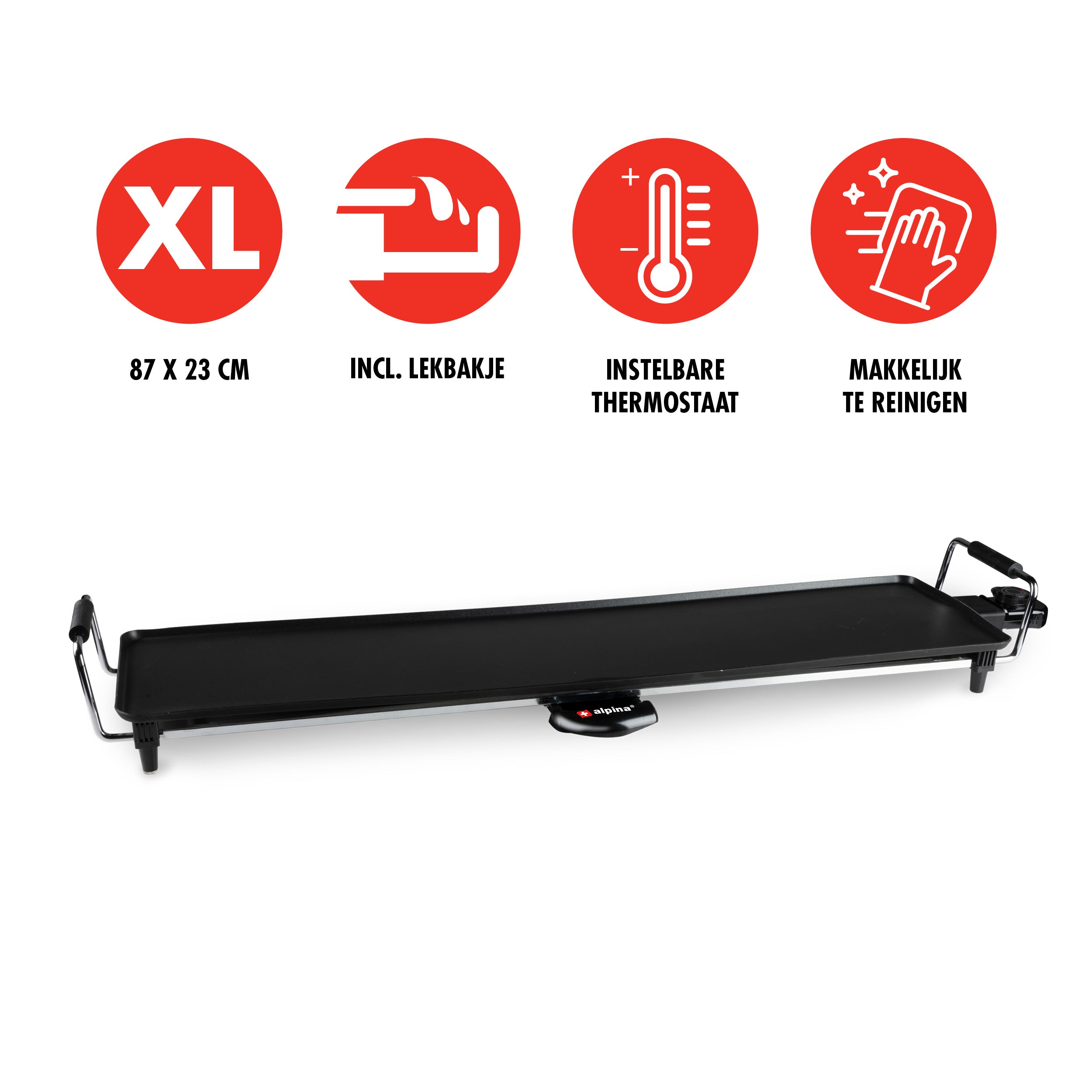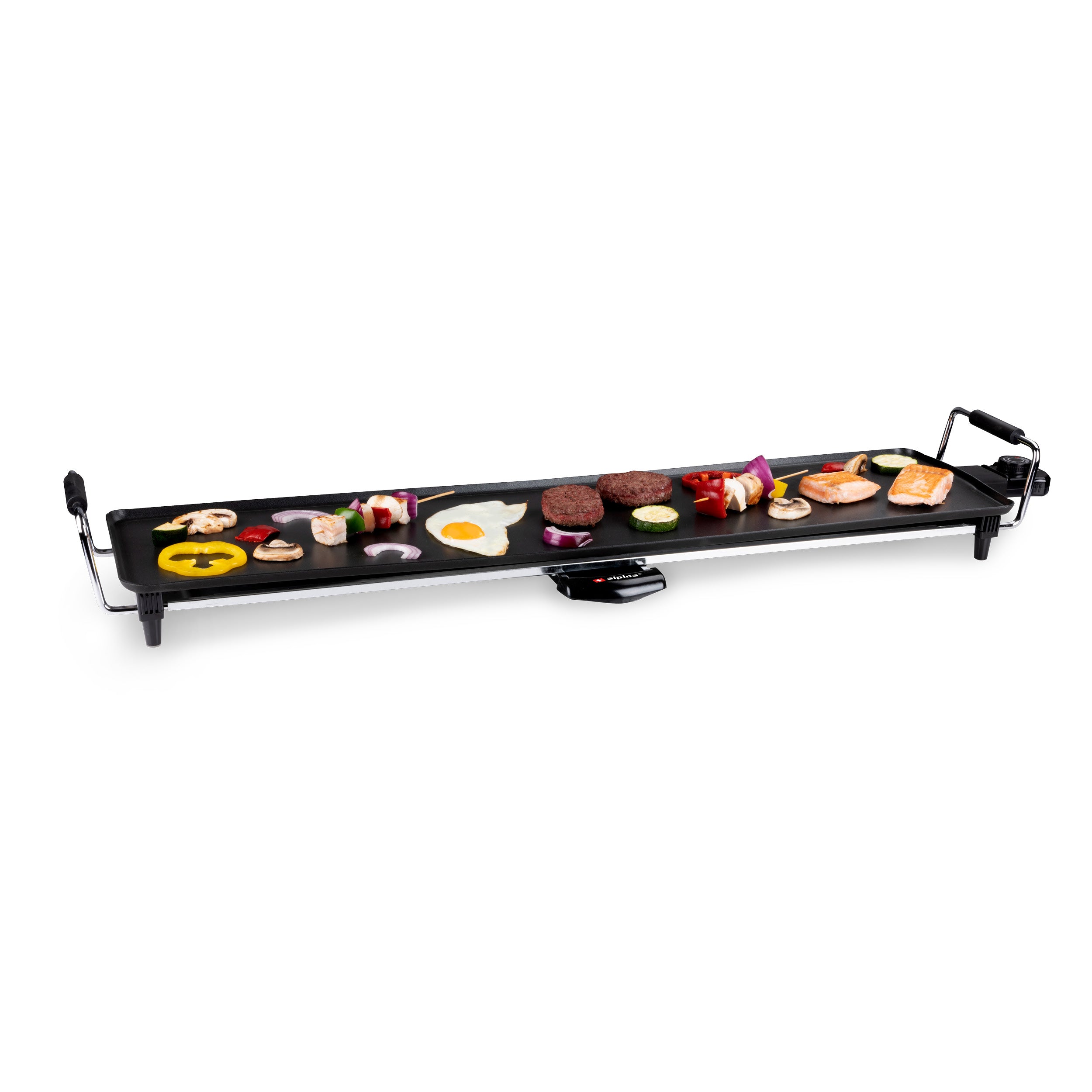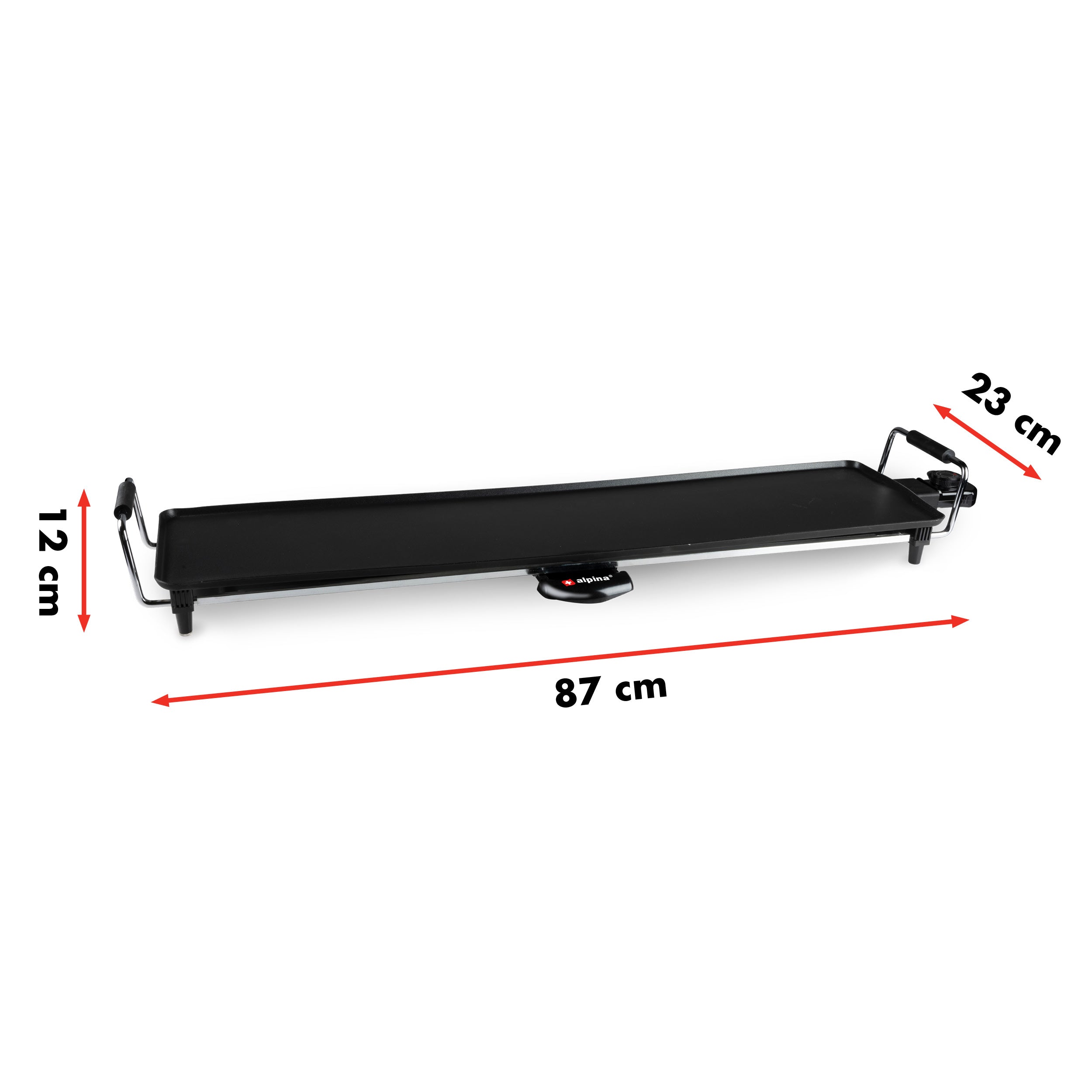 Deze elektrische bakplaat heeft een extra groot oppervlak, zodat je met veel personen tegelijk kan aanschuiven. De grillplaat is zo'n 87 centimeter lang en circa 23 centimeter breed. Dat geeft je een grilloppervlak van maar liefst 0,2 m².