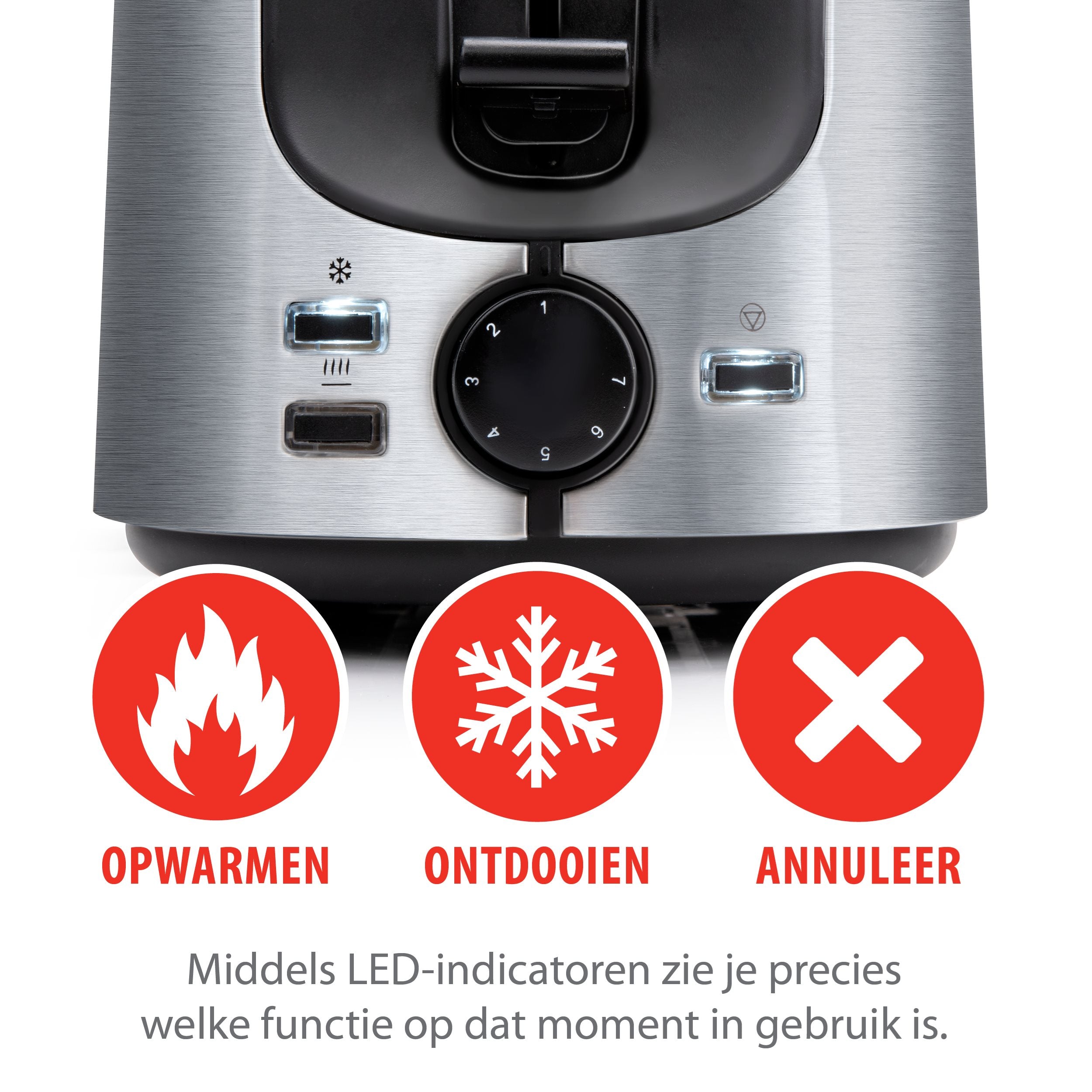 Hoe heb jij je brood het liefste? Het is helemaal aan jou met deze broodrooster met tostiklemmen van alpina. Kies uit 7 verschillende bruiningsstanden, van heel licht geroosterd tot donkerbruin getoast. Sla jij brood altijd in voor de hele week in en bewaar je het daarom in de vriezer? Met de ontdooifunctie zorg jij ervoor dat je brood eerst op de juiste manier ontdooit wordt voordat je het roostert. Zo voorkomt het apparaat dat het geroosterde brood taai wordt door te snelle opwarming. Het broodrooster met tostiklemmen houdt je brood lekker lang warm.