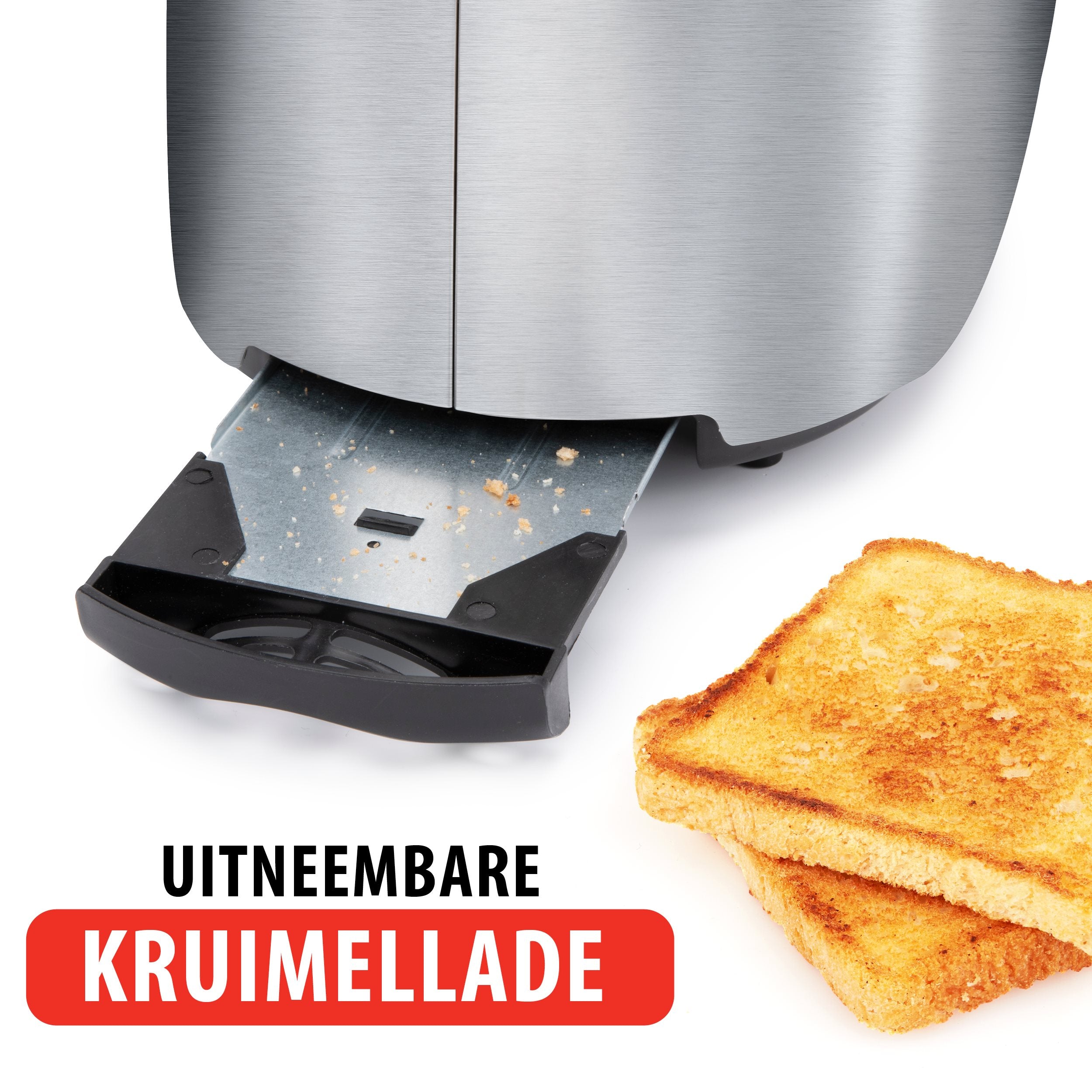 Per keer rooster jij twee sneetjes brood in de gleuven van de toaster en op het toastrek kun jij rond brood plaatsen ter verwarming. Het broodrooster is voorzien van een indicatielichtje om aan te geven wanneer het apparaat klaar is voor gebruik. Wanneer het brood klaar is met het door jou ingestelde bruiningsniveau, springt de sneetjes automatisch omhoog, zoals je dit gewend bent van een broodrooster. De onderkant van de toaster is voorzien van een lade om kruimels in op te vangen en gemakkelijk is te legen. De voetjes zijn voorzien van anti-slip, jouw broodrooster blijft staan waar die staat!