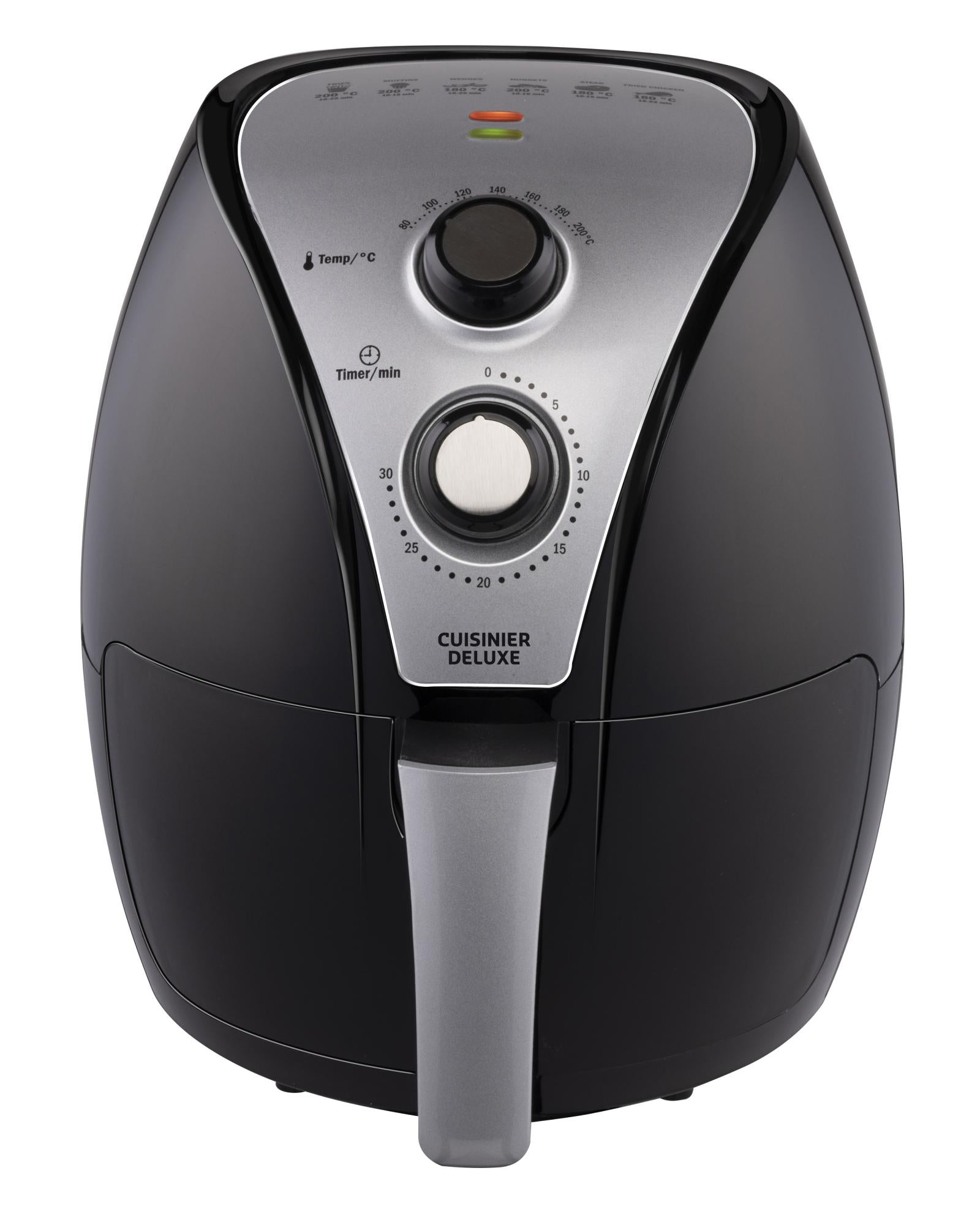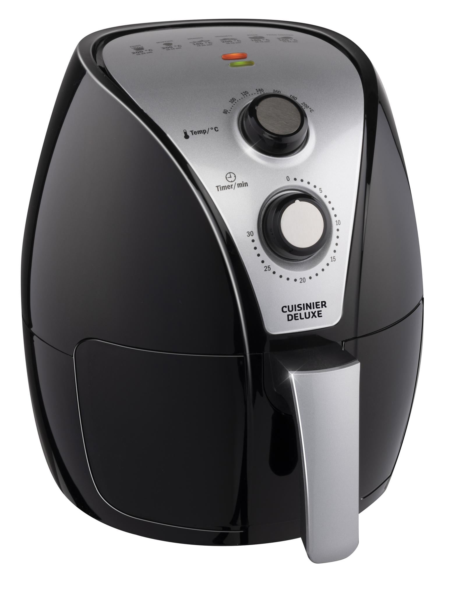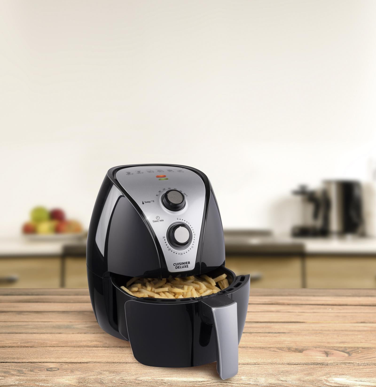 Frietjes en snacks bakken in een hetelucht friteuse betekent tot 80% minder vet gebruiken. Met deze airfryer van Cuisinier Deluxe gaat gezond frituren ook nog eens razendsnel en heel gemakkelijk. De verwijderbare lade met uitneembaar rekje heeft een inhoud van maar liefst 3,2 liter en is voorzien van een anti-aanbaklaag.