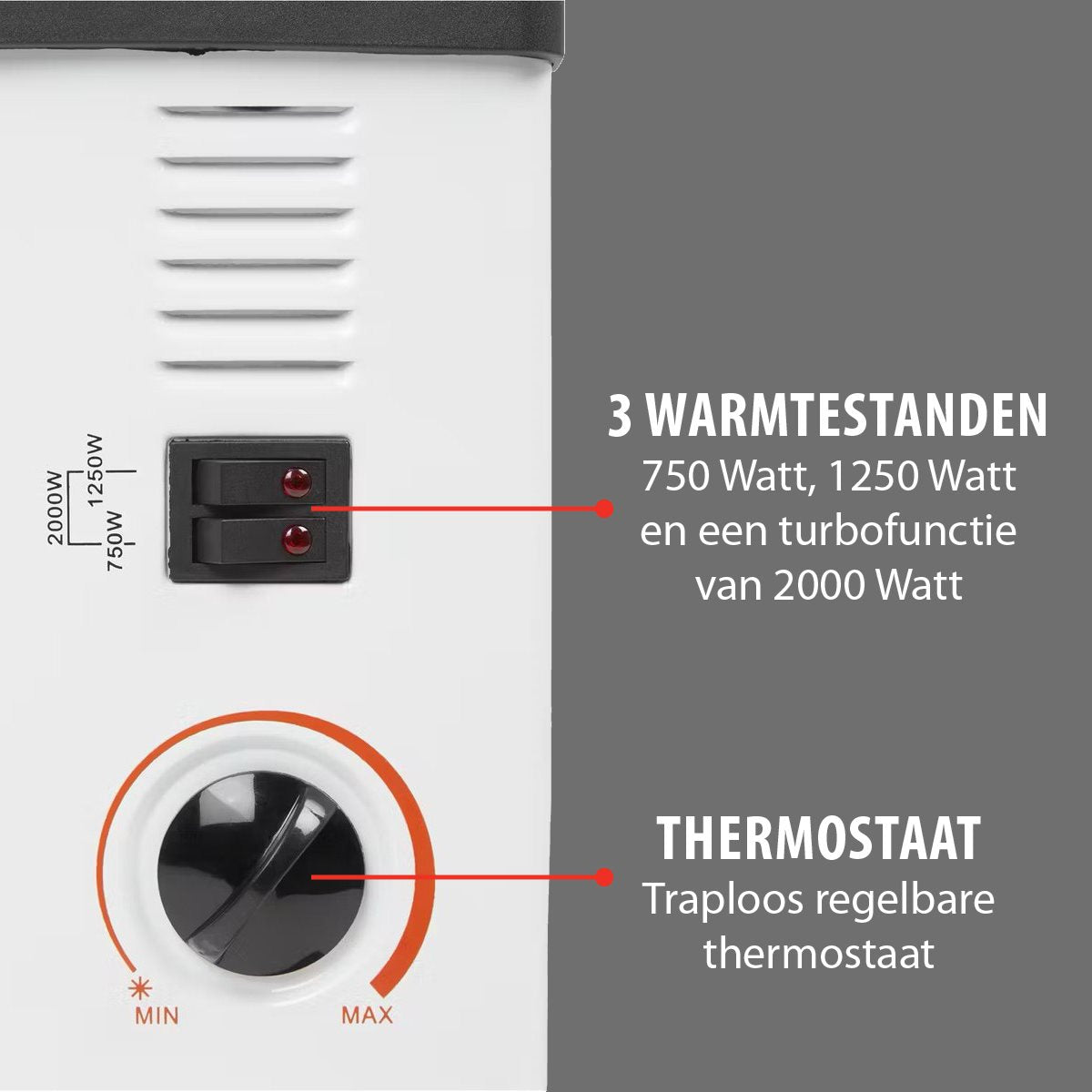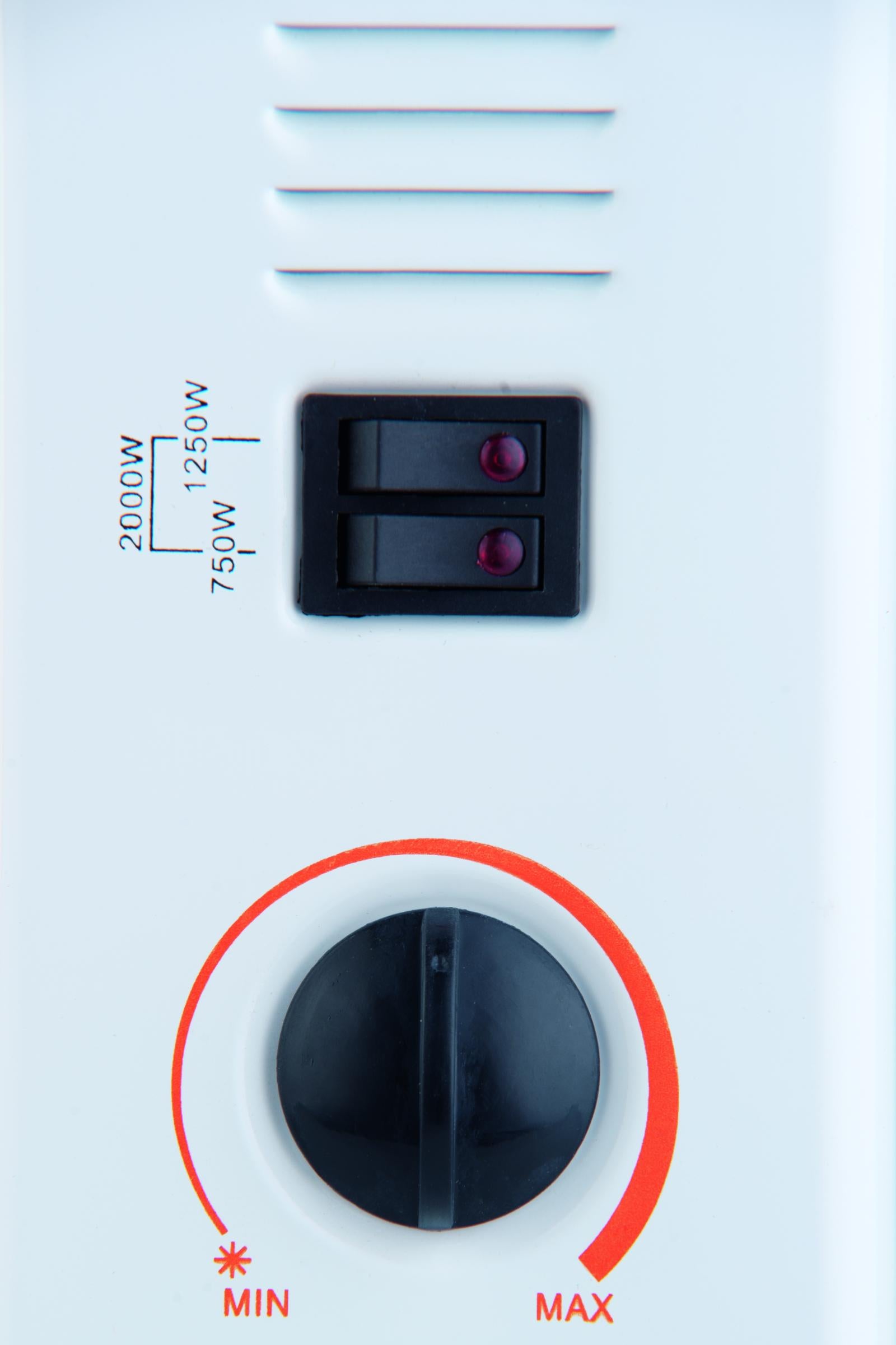 De elektrische kachel van alpina beschikt over 3 standen: 750W, 1250W en een turbofunctie van 2000W. Daarnaast kun je de temperatuur ook naar eigen voorkeur instellen. Hierdoor bepaal jij zelf hoe snel de convectorkachel verwarmt en hoe warm je het wil hebben. De verschillende wattage standen beheer je middels 3 switches op de elektrische kachel. Daaronder bevindt zich een draaiknop waarmee je de temperatuur van de elektrische convector kachel kunt instellen.