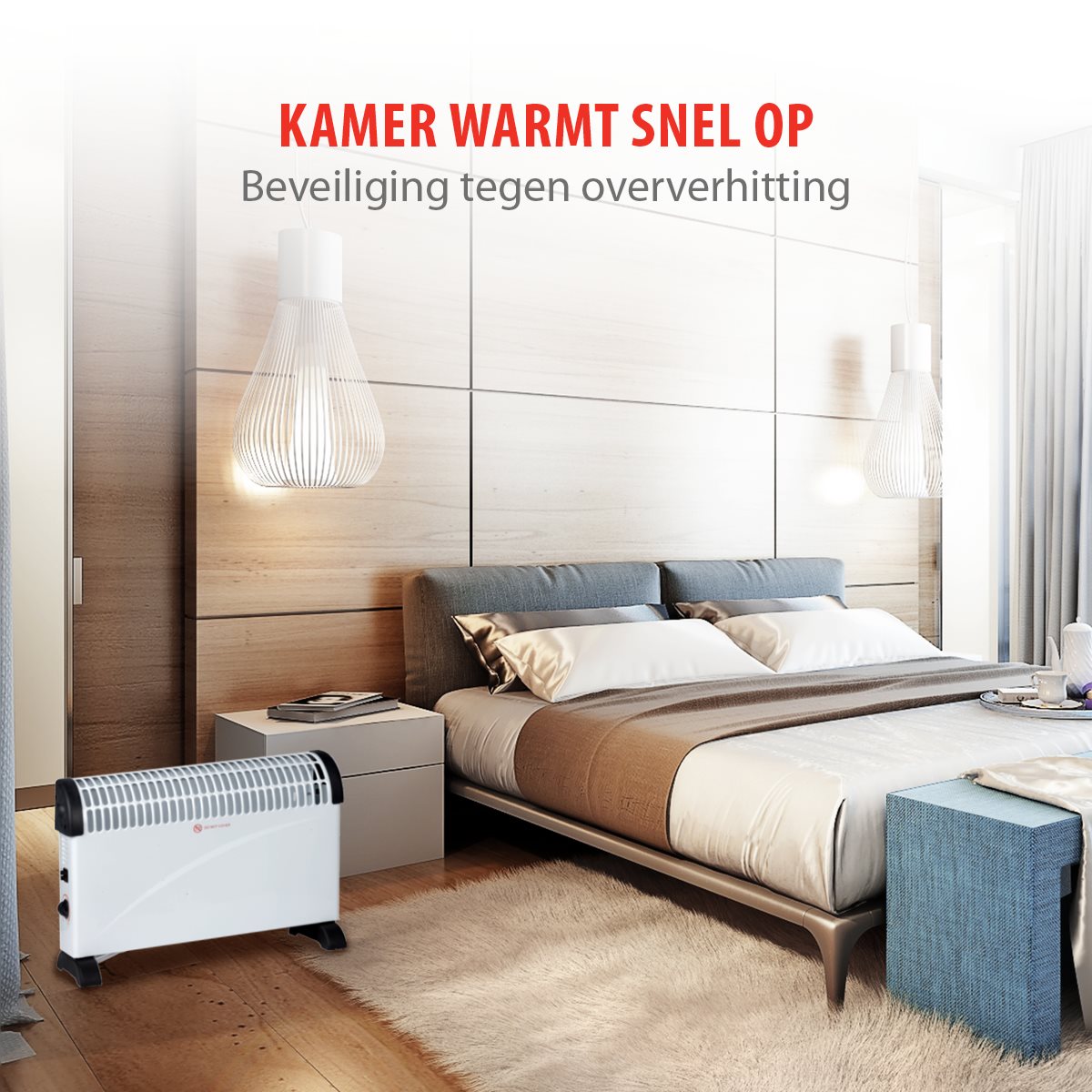Naast een zuinig alternatief op gas verwarming, heeft deze elektrische convectorkachel nog een ander voordeel. Convectie verwarming is namelijk vrijwel geruisloos. De elektrische kachel trekt koude lucht aan en warmt deze op. Hierbij komt vrij weinig geluid vrij, wat de kachel geschikt maakt voor langer gebruik en gebruik in je slaap- of studeerkamer. Plekken waar je doorgaans de rust en stilte goed kunt gebruiken.