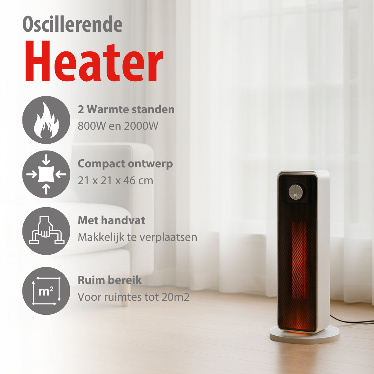 • Oscillatiefunctie: Verspreidt de warmte gelijkmatig door de ruimte dankzij de automatische oscillatie.