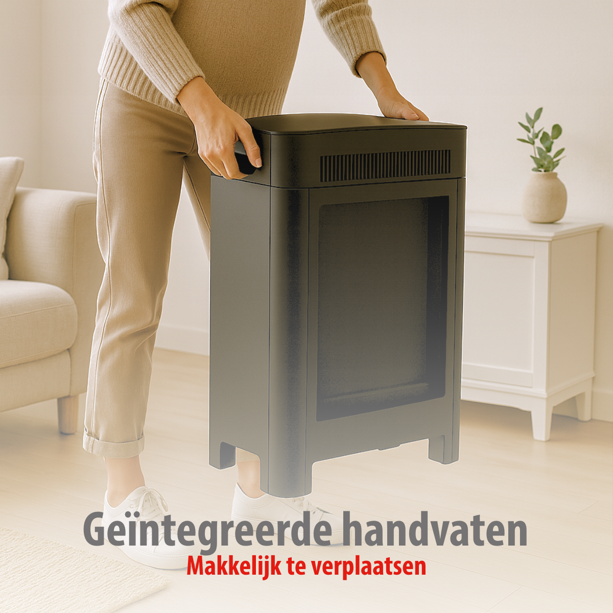 Deze kachel van 59 x 26 x 41 centimeter groot is gemakkelijk verplaatsbaar. Je kunt hem met de 2 aan de zijkanten ingebouwde handvatten overal neerzetten waar je wilt. Het enige wat je nodig hebt is een stopcontact.