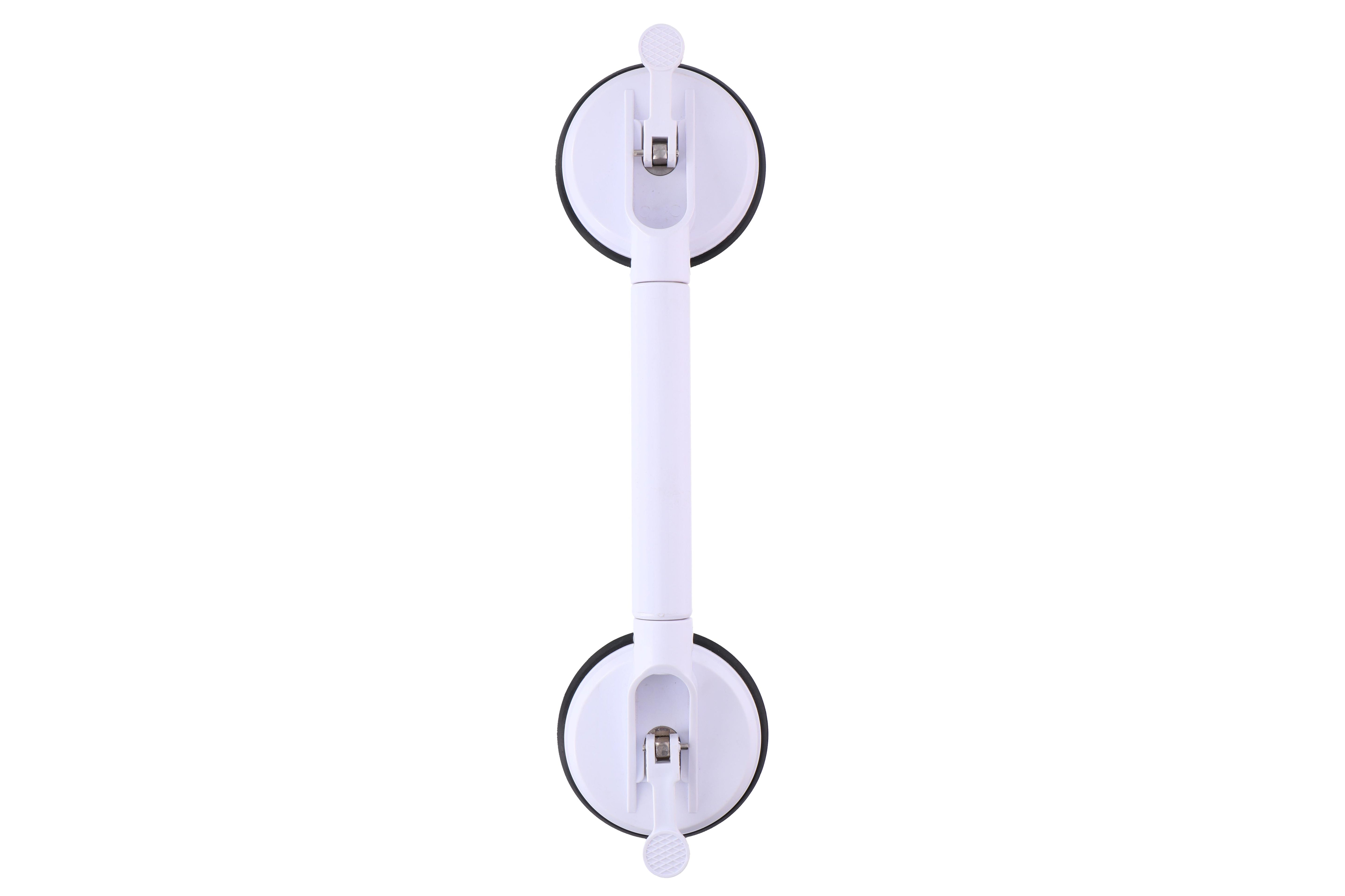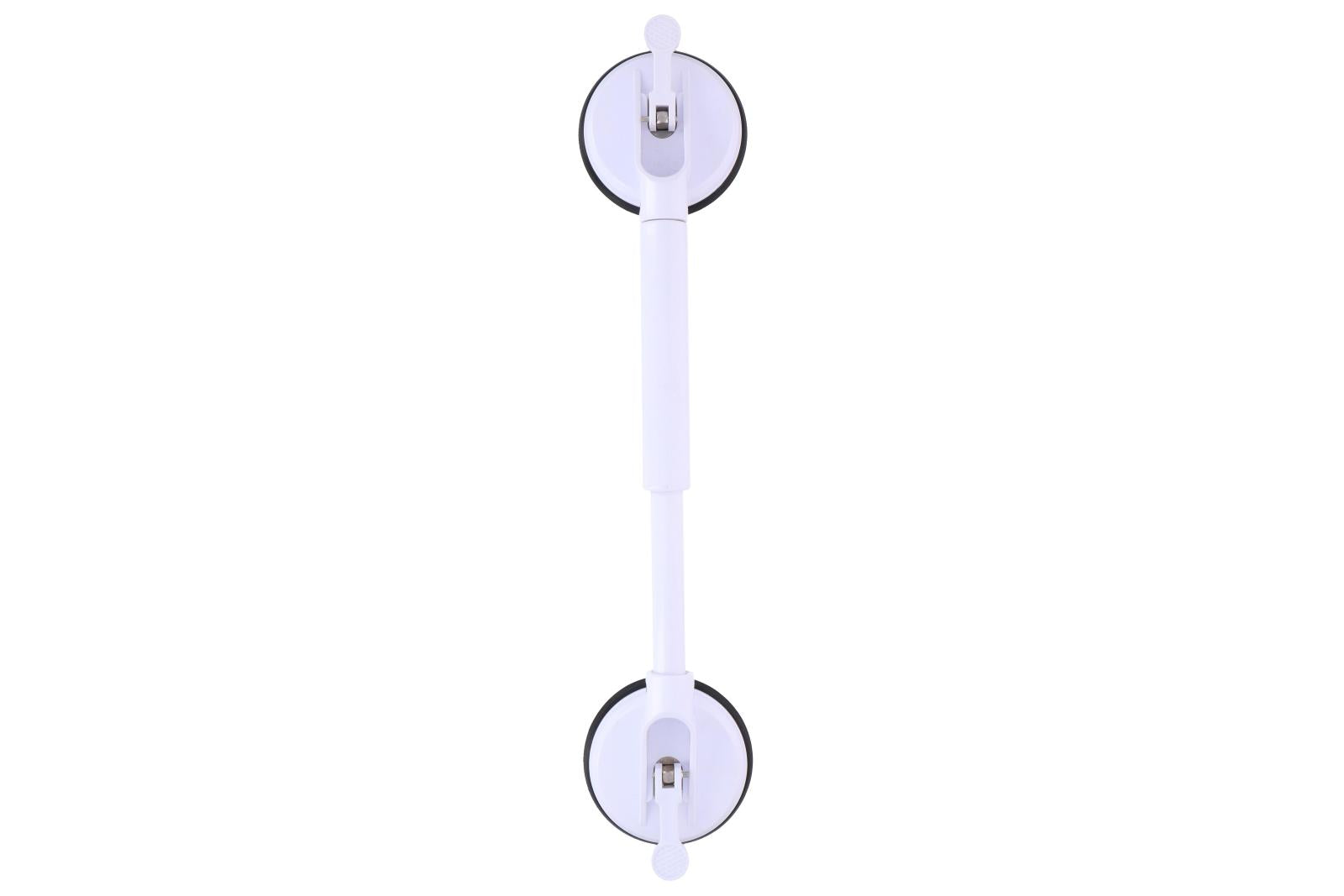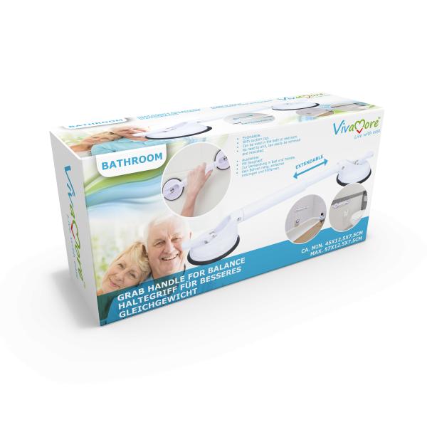 Soms heb je even wat meer zekerheid nodig in de badkamer. Met deze sterke Vivamore handgreep bewaar je je evenwicht wanneer je douche of bad in stapt. Ook tegen de wand bij het toilet is deze handgreep een goed hulpmiddel. Deze douchegreep is uitschuifbaar zodat je hem gemakkelijk met beide handen kunt vasthouden. Door de klemmen van de douchegreep naar beneden te duwen, hechten de zuignappen zich aan de badkamerwand. Let op: de zuignappen plakken alleen op een gladde, vlakke, niet poreuze ondergrond. Deze handgrepen zijn uitsluitend bedoeld om het evenwicht te bewaren. Er mag niet met het volle gewicht aan gehangen worden. Controleer voor het vastgrijpen of de handgreep goed vast zit.