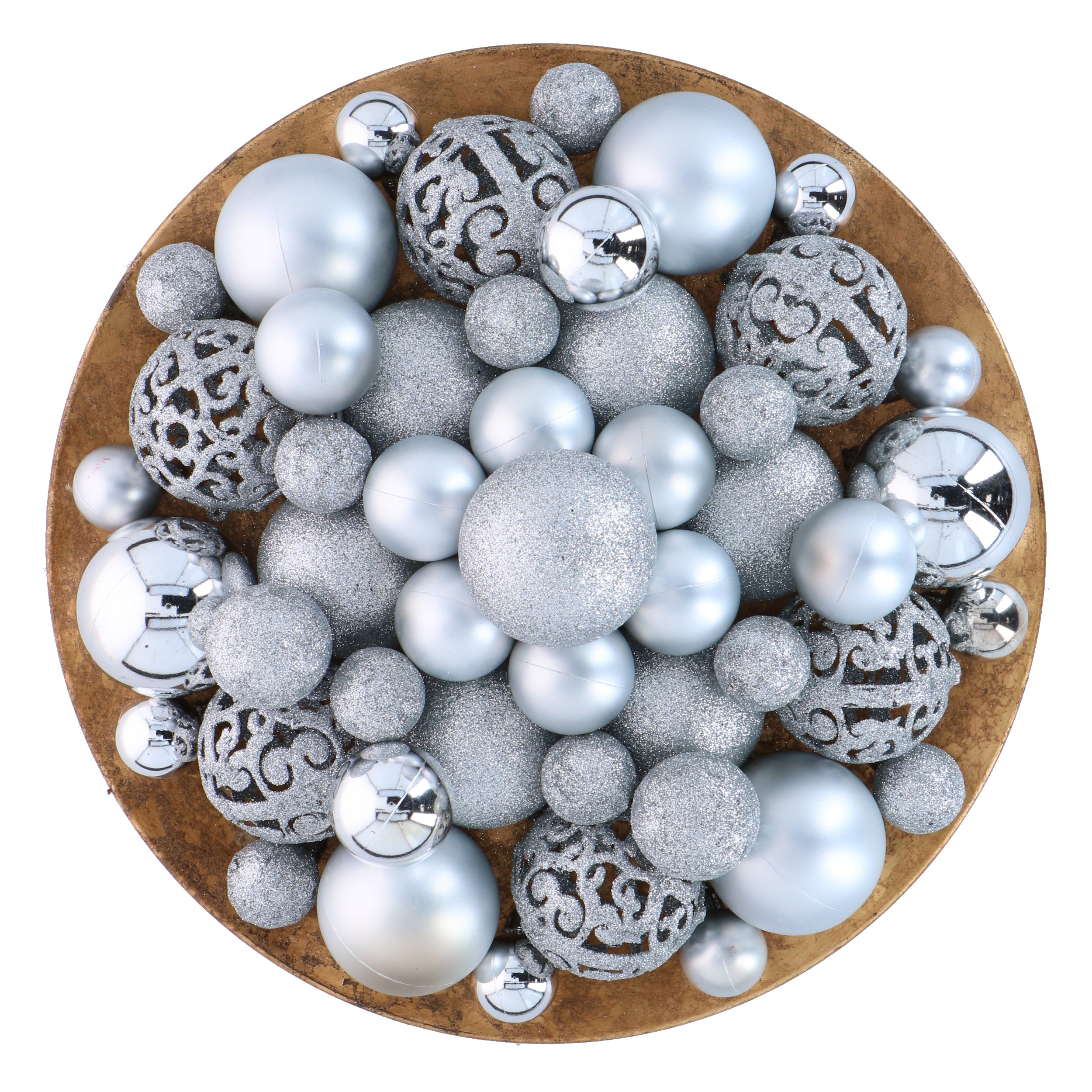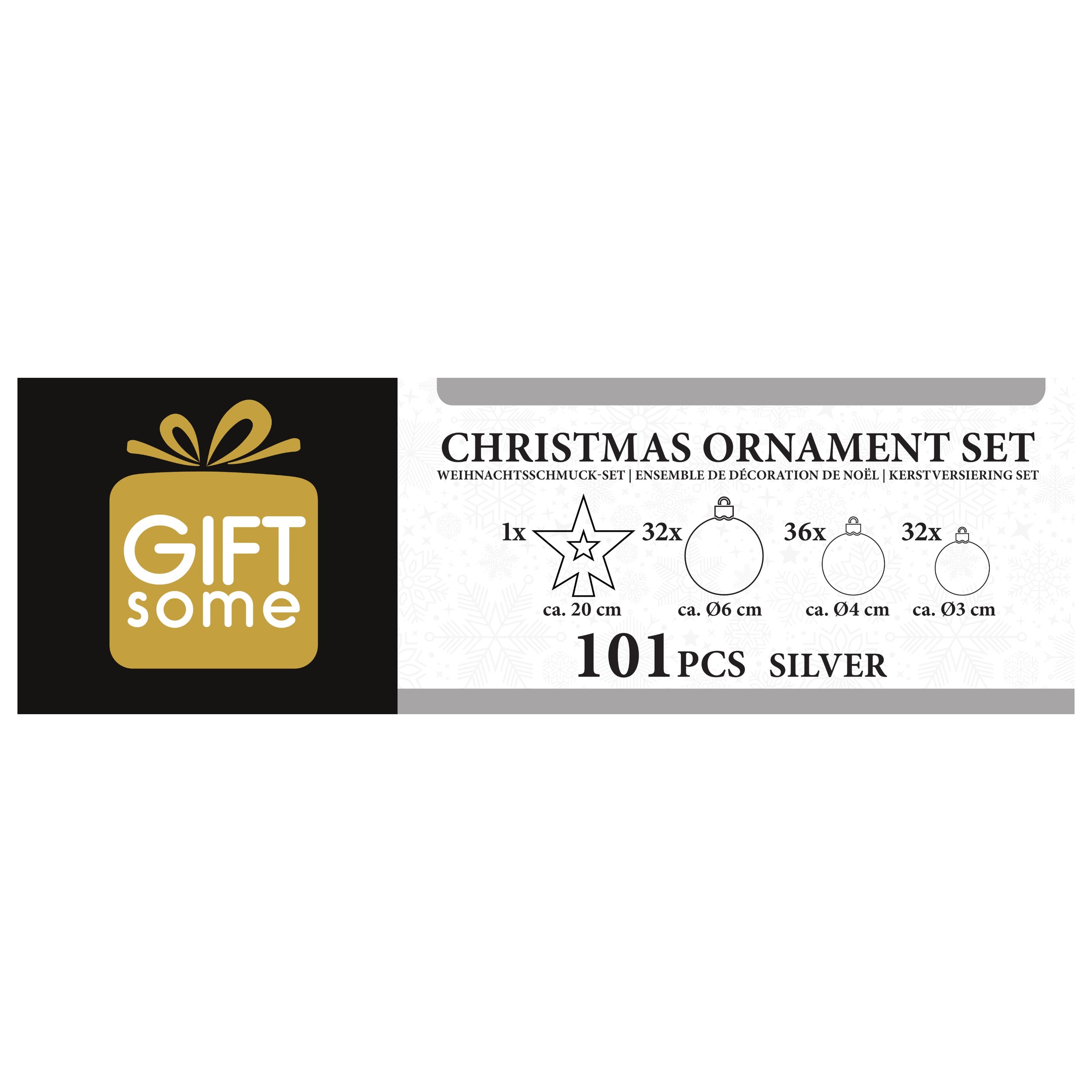 Tover je kerstboom in een handomdraai om tot dé blikvanger in huis met behulp van deze zilveren kerstballen set van Giftsome. De set bestaat uit maar liefst 100 kerstballen in verschillende afwerkingen en een prachtige zilveren piek. Dankzij het materiaal van deze kunststof kerstballen is deze set de ideale kerstversiering voor gezinnen met kleine kinderen en huisdieren. Met de kerstballenset worden verschillende kerstbalhaakjes geleverd waarmee je elke indivuele kerst decoratie gemakkelijk aan je kerstboom of krans kunt bevestigen.