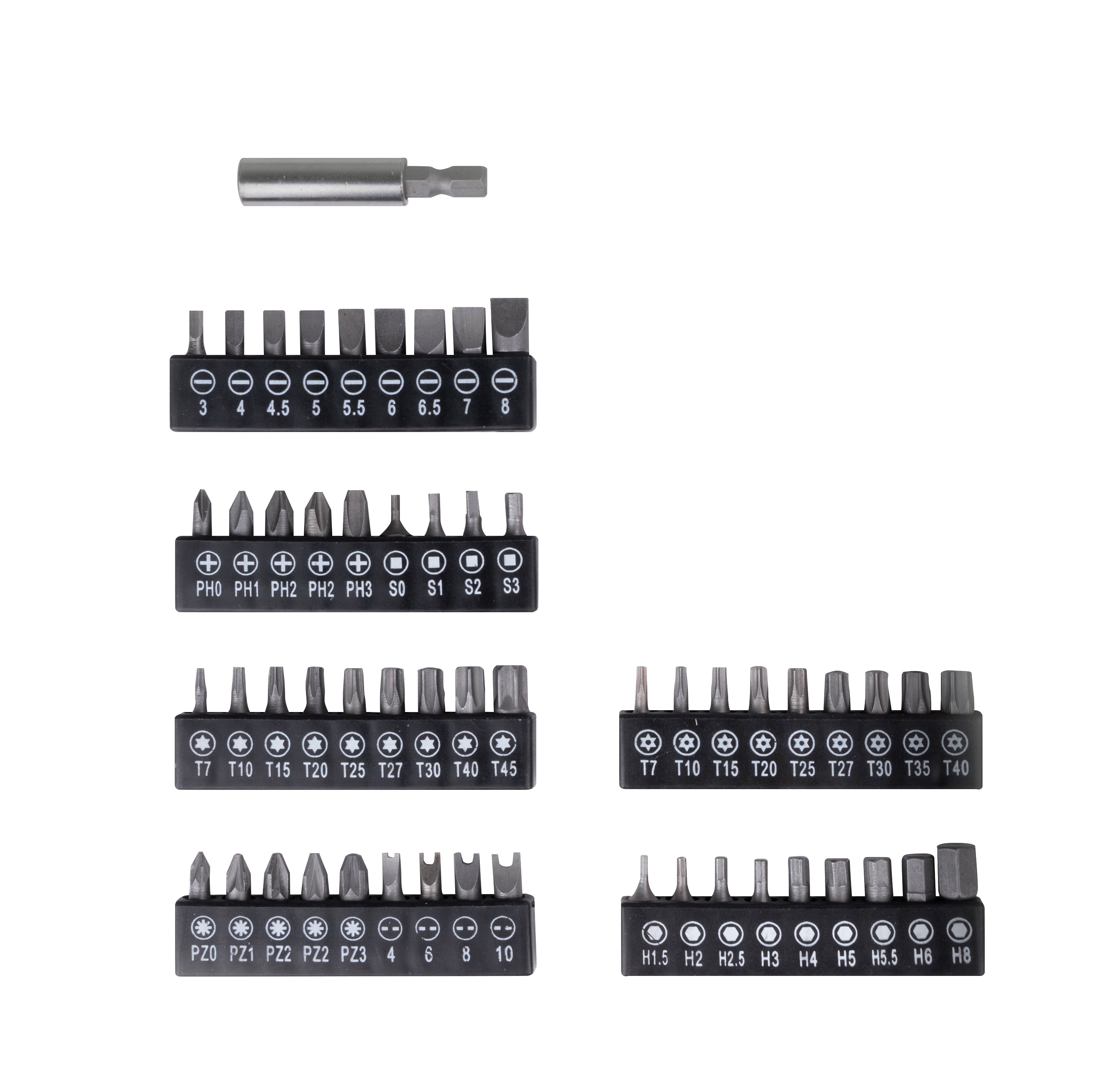 - 5x Pozidriv: PZ0, PZ1, 2x PZ2 en PZ3