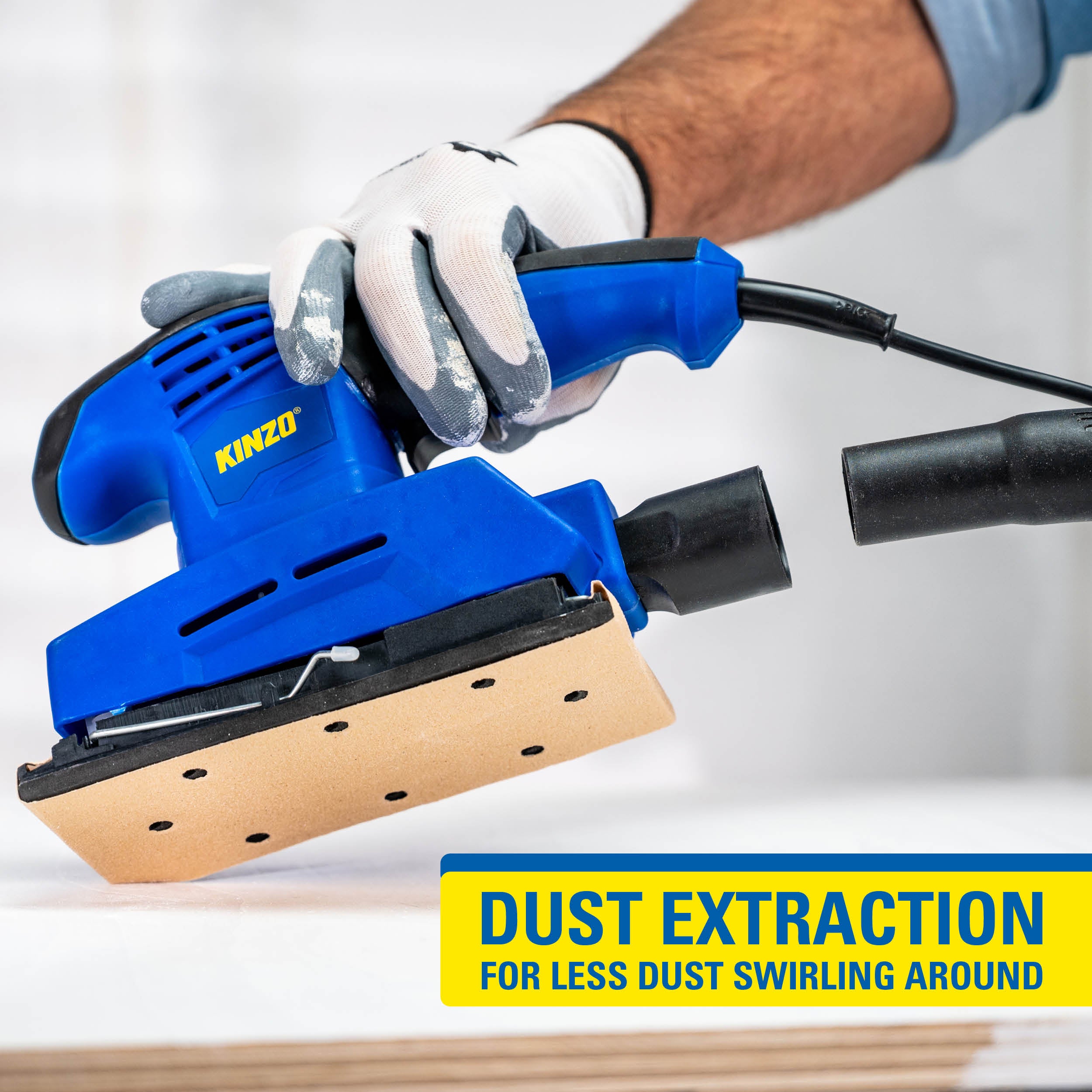 De Kinzo schuurmachine komt met speciale stofafzuiging. Deze stofafzuiging zorgt ervoor dat er tijdens het schuren zo min mogelijk ronddwarrelend stof vrij komt. Hierdoor is de Kinzo vlakschuurmachine beter voor de gezondheid dan een schuurmachine zonder stofafzuiging.