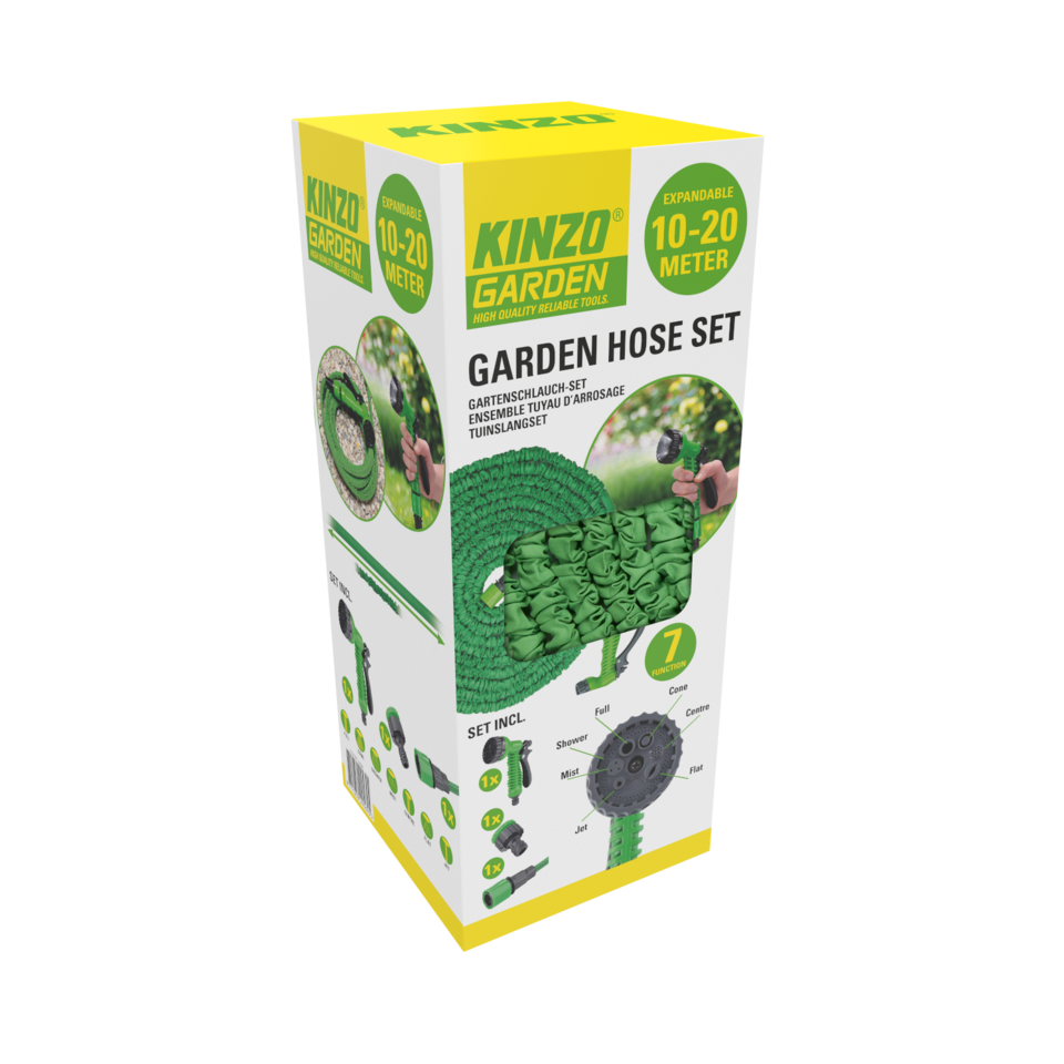 Deze flexibele tuinslang set met opzetstuk is ideaal voor het onderhouden en besproeien van je tuin. De set wordt geleverd met een flexibele tuinslang. Deze heeft een lengte van10 meter en is uitrekbaar tot en maximale lengte van maar liefst 20 meter. Zo heb je meer bewegingsvrijheid dan bij een traditionele tuinslang. Hierdoor neemt de tuinslang ook minder ruimte in beslag wanneer hij niet in gebruik is. Tot slot worden er nog een sproeikop en een koppelstuk meegeleverd. De sproeikop beschikt over 7 spraystanden variërend van een harde waterstraal tot een zachte mist.