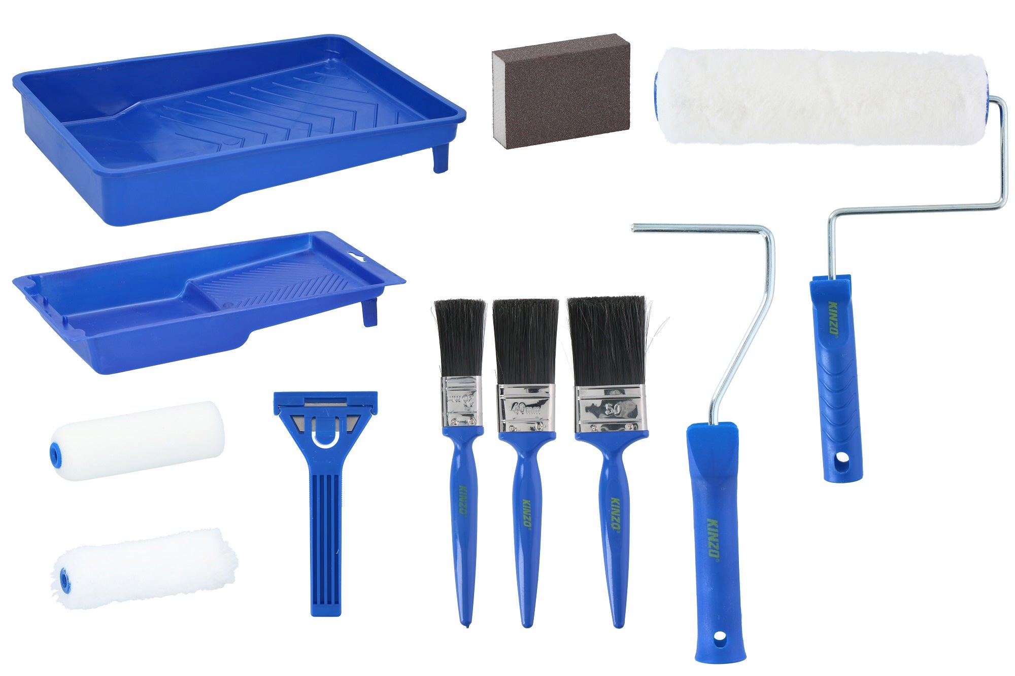 Schilderklus op de agenda? Of je nu een meubel een ander kleurtje wilt geven, een kozijn wilt schilderen of je muur wilt sauzen. Met deze 12-delige complete schilderset van Kinzo kun je elke verfklus aan. Je krijgt 3 rollers, 3 kwasten, 2 beugels, 1 schuurblok, 1 glaskrabber en 2 verfbakken.