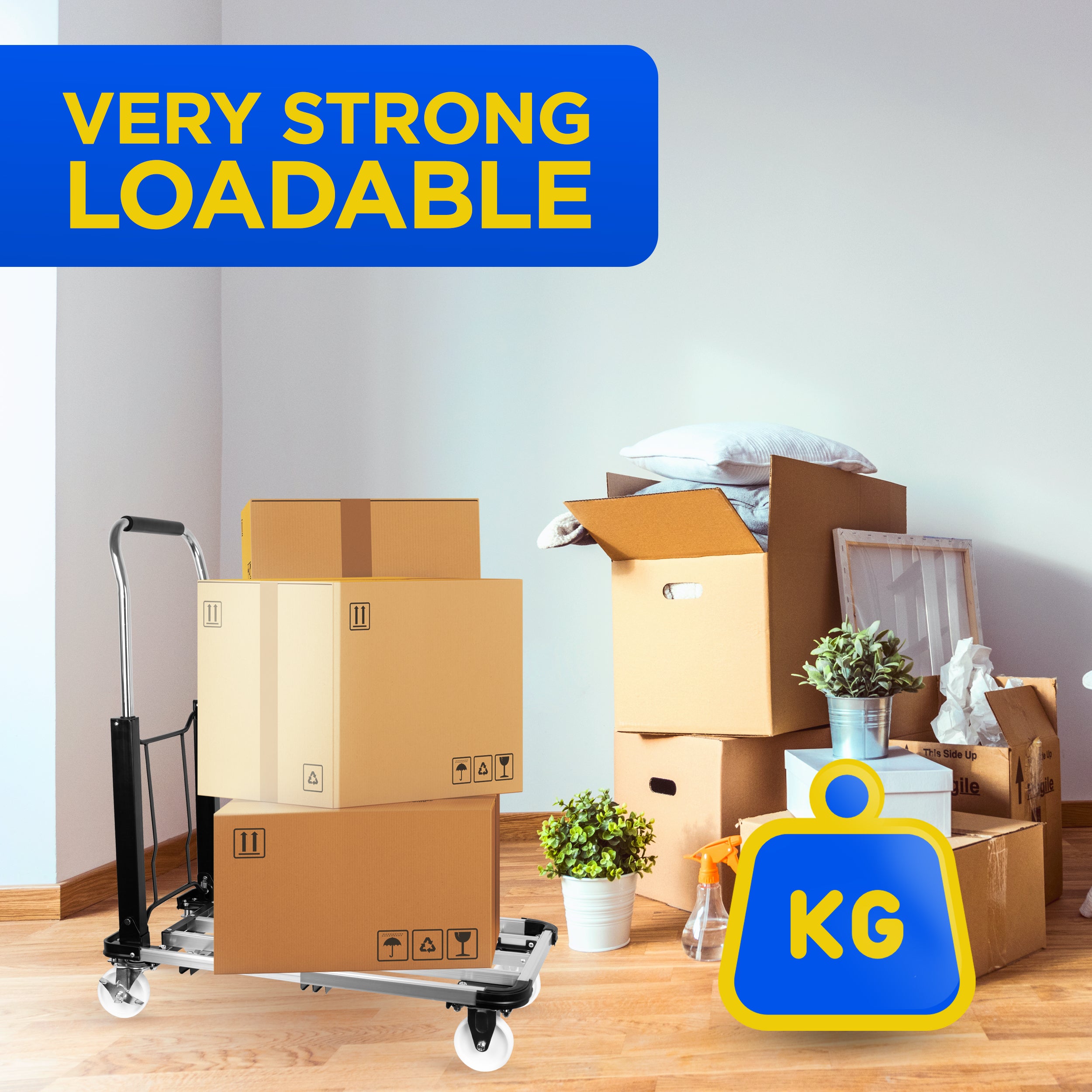 De kar heeft een duwbeugel met een softgrip handvat. De afmetingen van de trolley zijn 71 x 41 x 94,5 cm centimeter. Gebruik je de transportwagen niet dan klap je hem in zodat je hem compact kunt opbergen. Je kunt de duwbeugel inklappen en het platform in elkaar schuiven zodat hij nog minder plaats inneemt. Het karretje meet opgevouwen 56 x 41 x 23 cm.