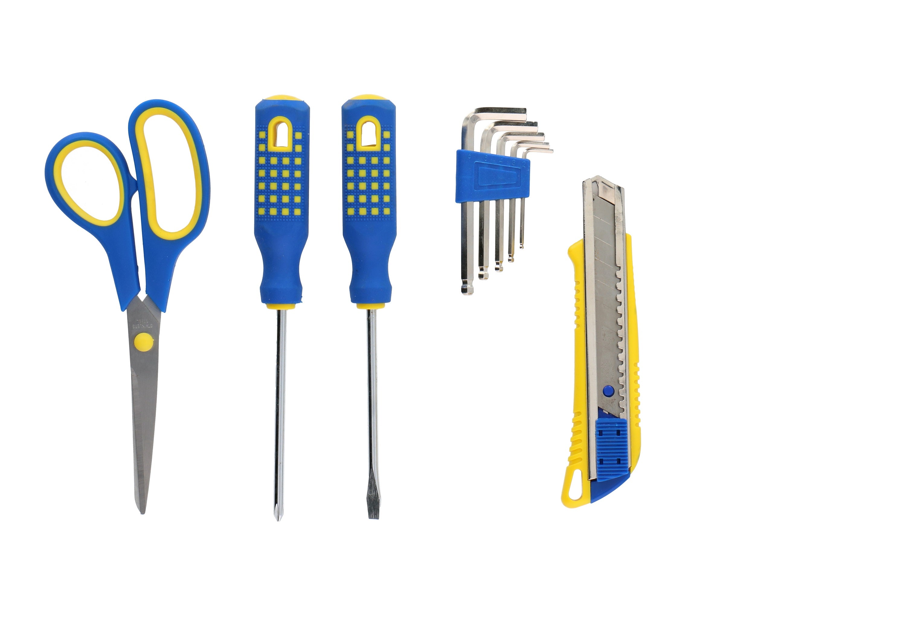 Even een schroefje van een keukenkastje aan draaien of een kroonsteentje vastschroeven van een lamp die je ophangt. Deze goed gevulde gereedschapskist bevat alles wat je nodig hebt. De set bestaat uit: 2 schroevendraaiers, 1 schroevendraaier met kruiskop, 1 met een platte knop. Verder vind je in het gereedschapskoffertje 1 stanleymes, 1 schaar, 1 rolmeter, 1 rol tape, 5 inbussleutels en 10 bits.