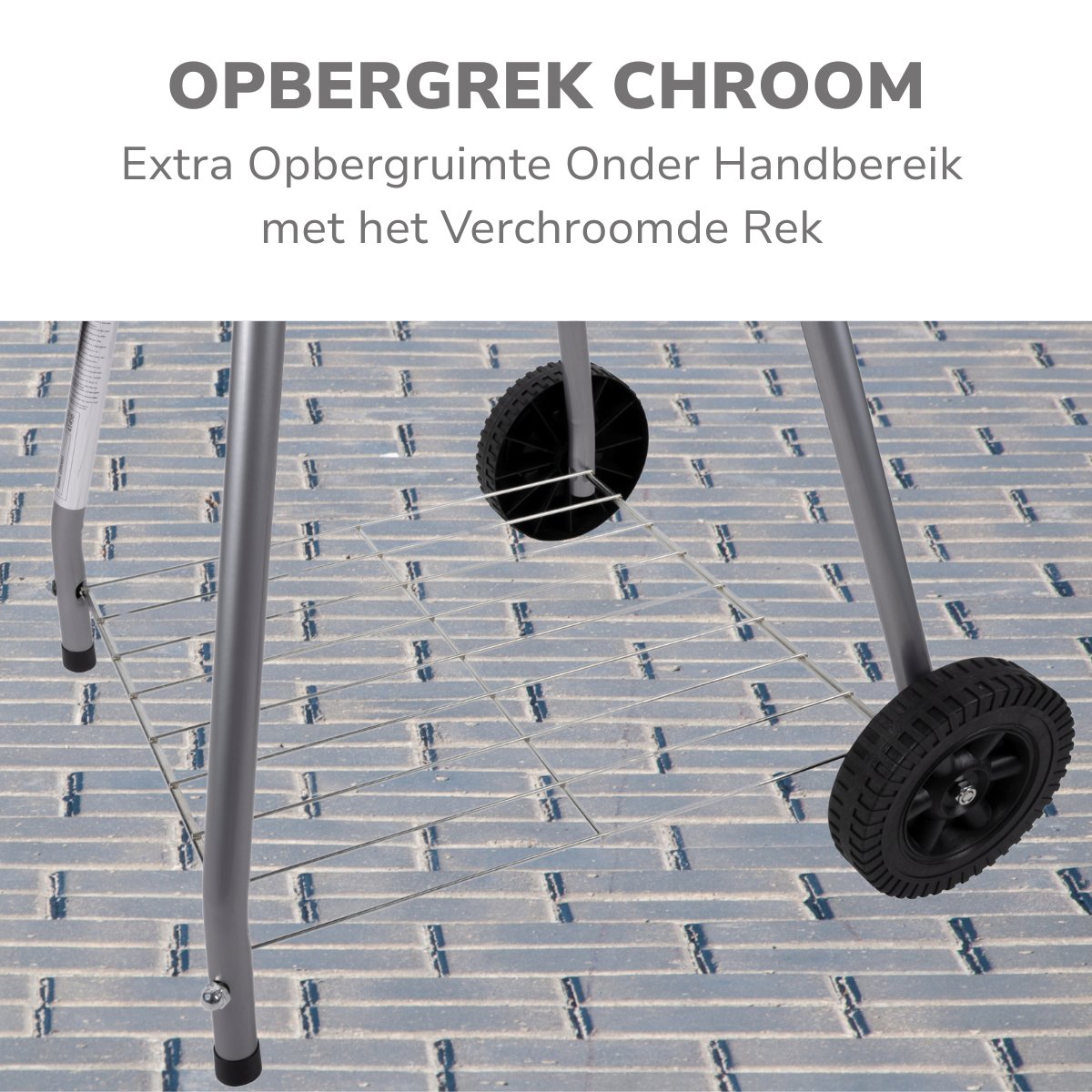Het grillrooster van deze barbecue heeft een diameter van 45 cm; voor veel mensen een prima formaat. Wil je wat spullen binnen handbereik houden? Leg ze dan onder de barbecue op het verchroomde rooster. De BBQ heeft een hoogte van zo'n 83 cm, zodat je staand kunt barbecueën zonder ver voorover te hoeven buigen. Fijn voor je rug!