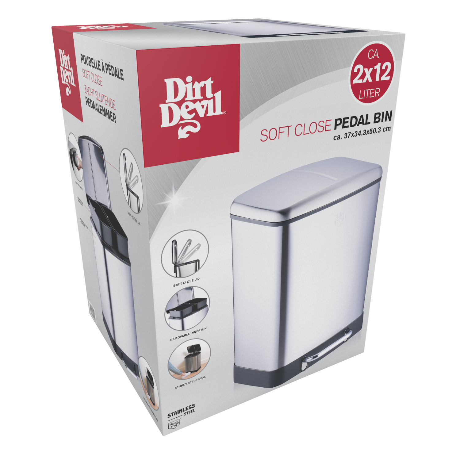Ga bewust om met het afval in huis dankzij deze Dirt Devil afvalscheidingsprullenbakken. De moderne pedaalemmer heeft 2 losse prullenbakken met een inhoud van 12 liter. Hierdoor wordt afvalscheiding een stuk makkelijker aangezien je bijvoorbeeld plastic in de ene prullenbak kwijt kunt, en karton en papier in de andere prullenbak. Dankzij een voetpedaal aan de onderzijde van de pedaalemmer kun je de deksel openen zonder hierbij je handen te gebruiken. De deksel van de afvalscheidingprullenbakken beschikt over een soft-close mechanisme. Hierdoor valt de deksel rustig dicht zonder daarbij veel geluid te maken en ontsnappen nare geurtjes ook niet zo snel. De pedaalemmer is gemaakt van zilverkleurig roestvrij staal. Dit materiaal staat er om bekend stevig en duurzaam te zijn, maar is daarnaast ook makkelijk schoon te houden.