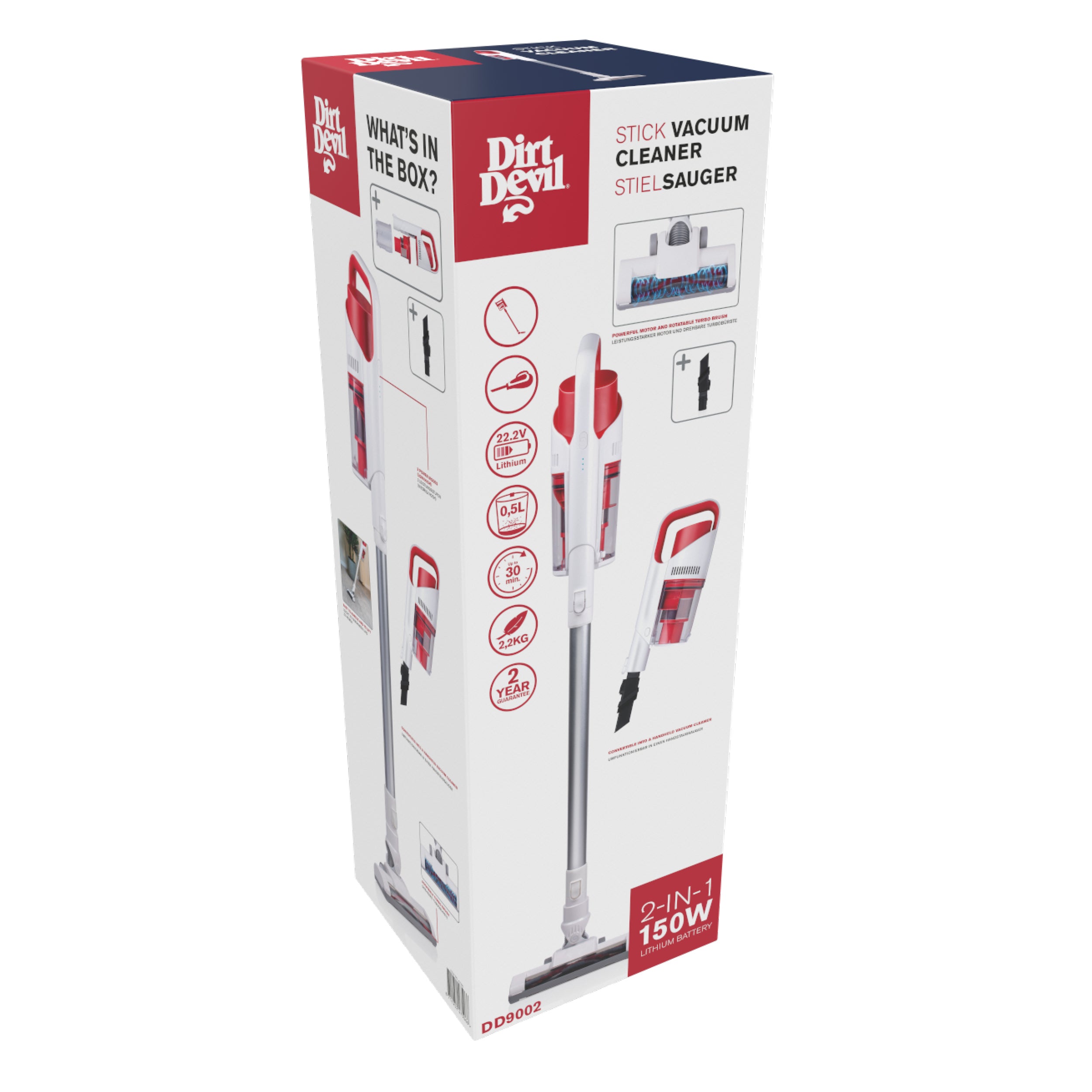 Met de 2-in-1 steelstofzuiger van Dirt Devil haal je niet alleen een snoerloze stofzuiger in huis, maar ook een kruimelzuiger. De stofzuiger wordt geleverd met een combiborstel, steel en kierzuigmond. Met de steel en combiborstel maak je snel en gemakkelijk verschillende vloertypes schoon. Door de steel te verwijderen en de kierzuigmond vast te klikken tover je de draadloze steelstofzuiger in een handomdraai om tot handstofzuiger. Zo kom je ook makkelijk op anders moeilijk schoon te maken plekken zoals kieren en hoekjes. Door zijn gewicht van 2,2 kilogram en de afwezigheid van een snoer, manoeuvreer je de stofzuiger gemakkelijk door het huis heen.