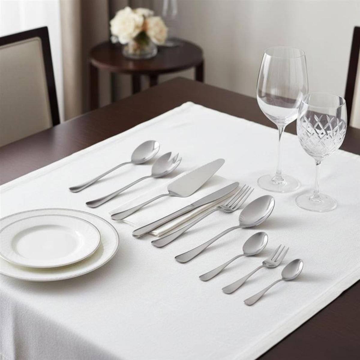 - Bevat: 12 dinermessen, 12 dinervorken, 12 dinerslepels, 12 theelepels, 12 koffielepels, 12 cakevorken, 1 serveerlepel, 1 serveervork, 1 cakeschep